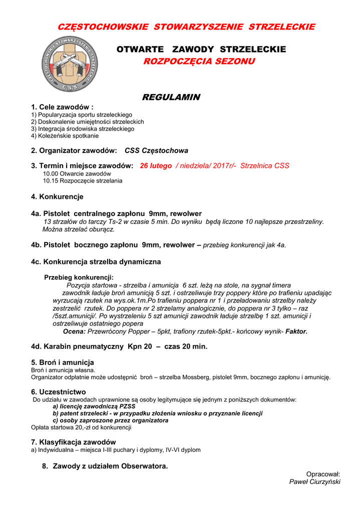 CZĘSTOCHOWSKIE STOWARZYSZENIE STRZELECKIE OTWARTE ZAWODY STRZELECKIE ROZPOCZĘCIA SEZONU REGULAMIN 1. Cele zawodów : 1) Popularyzacja sportu strzeleckiego 2) Doskonalenie umiejętności strzeleckich 3) Integracja środowiska strzeleckiego 4) Koleżeńskie spotkanie 2. Organizator zawodów: CSS Częstochowa 3. Termin i miejsce zawodów: 26 lutego / niedziela/ 2017r/- Strzelnica CSS 10.00 Otwarcie zawodów 10.15 Rozpoczęcie strzelania 4. Konkurencje 4a. Pistolet centralnego zapłonu 9mm, rewolwer 13 strzałów do tarczy Ts-2 w czasie 5 min. Do wyniku będą liczone 10 najlepsze przestrzeliny. Można strzelać oburącz. 4b. Pistolet bocznego zapłonu 9mm, rewolwer – przebieg konkurencji jak 4a. 4c. Konkurencja strzelba dynamiczna Przebieg konkurencji: Pozycja startowa - strzelba i amunicja 6 szt. leżą na stole, na sygnał timera zawodnik ładuje broń amunicją 5 szt. i ostrzeliwuje trzy poppery które po trafieniu upadając wyrzucają rzutek na wys.ok.1m.Po trafieniu poppera nr 1 i przeładowaniu strzelby należy zestrzelić rzutek. Do poppera nr 2 strzelamy analogicznie, do poppera nr 3 tylko – raz /5szt.amunicji/. Po wystrzeleniu 5 szt amunicji zawodnik ładuje strzelbę 1 szt. amunicji i ostrzeliwuje ostatniego popera Ocena: Przewrócony Popper – 5pkt, trafiony rzutek-5pkt.- końcowy wynik- Faktor. 4d. Karabin pneumatyczny Kpn 20 – czas 20 min. 5. Broń i amunicja Broń i amunicja własna. Organizator odpłatnie może udostępnić broń – strzelba Mossberg, pistolet 9mm, bocznego zapłonu i amunicję. 6. Uczestnictwo Do udziału w zawodach uprawnione są osoby legitymujące się jednym z poniższych dokumentów: a) licencję zawodniczą PZSS b) patent strzelecki - w przypadku złożenia wniosku o przyznanie licencji c) osoby zaproszone przez organizatora Opłata startowa 20,-zł od konkurencji 7. Klasyfikacja zawodów a) Indywidualna – miejsca I-III puchary i dyplomy, IV-VI dyplom 8. Zawody z udziałem Obserwatora. Opracował: Paweł Ciurzyński