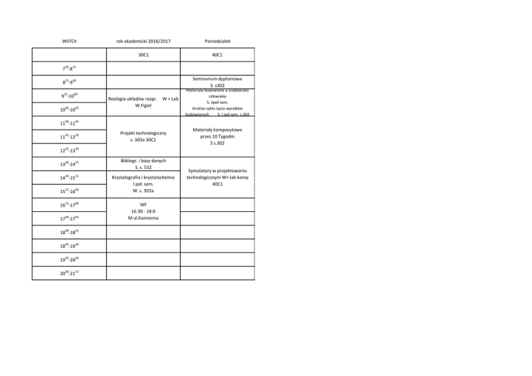 WIiTCh rok akademicki 2016/2017 Poniedziałek 30C1 40C1 730-815 Seminarium dyplomowe S. s302 815-900 915-1000 1000-1045 Reologia układów rozpr. W.Figiel W + Lab Materiały budowlane a środowisko człowieka S. IIpoł sem. Analiza cyklu życia wyrobów budowlanych S. I poł sem s.302 1100-1145 1145-1230 Projekt technologiczny s. 303a 30C1 Materiały kompozytowe przez 10 Tygodni S s.302 1245-1330 1330-1415 1430-1515 1515-1600 1615-1700 1700-1745 1800-1845 1845-1930 1945-2030 2030-2115 Bibliogr. i bazy danych S. s. 532 Krystalografia i krystalochemia I poł. sem. W. s. 303a WF 16.30 - 18.0 M ul.Kamienna Symulatory w projektowaniu technologicznym W+ lab komp 40C1 WIiTCh rok akademicki 2016/2017 Wtorek 30C1 40C1 730-815 815-900 915-1000 1000-1045 1100-1145 Automat. I pomiary ćw. s.532 Termodynamika techniczna III rok cw. s 134 1145-1230 1245-1330 1330-1415 1430-1515 Automatyka i pomiary W. S 135 1515-1600 1615-1700 1700-1745 1800-1845 1845-1930 1945-2030 2030-2115 Podstawy Technologii Ceramiki, II połowa laboratorium 430 15.15-19.00 WIiTCh rok akademicki 2016/2017 Środa 30C1 40C1 730-815 815-900 915-1000 1000-1045 WF 9.00 - 10.30 K ul.Kamienna 1100-1145 1145-1230 1245-1330 1330-1415 1430-1515 1515-1600 1615-1700 1700-1745 1800-1845 1845-1930 1945-2030 2030-2115 Technologia materiałów wiążących betonu w. + ćw. s.302 WIiTCh rok akademicki 2016/2017 Czwartek 30C1 40C1 Termodynamika chemiczna wykład + ćw s.532 30C1 Przetwórstwo tworzyw stosowanych w budownictwie W s.134 730-815 815-900 915-1000 1000-1045 1100-1145 1145-1230 1245-1330 Materiałozn. I korozja 202 30C1 1330-1415 1430-1515 Podst. budownictwa W. s. 532 1515-1600 1615-1700 1700-1745 1800-1845 1845-1930 1945-2030 2030-2115 Podst. budownictwa P. s. 532 w. s Przetwórstwo tworzyw stosowanych w budownictwie Lab 52C 1 grupa x 5 zajęć po 6 godz. 11.00-15.30 WIiTCh rok akademicki 2016/2017 Piątek 30C1 40C1 730-815 815-900 915-1000 1000-1045 1100-1145 45 11 -12 30 1245-1330 1330-1415 1430-1515 1515-1600 1615-1700 1700-1745 1800-1845 1845-1930 1945-2030 2030-2115 Surowce i proc. Technologii chemicznej Ćw. S.532 Surowce i proc. Technologii chemicznej W. s 532 Ang. term. techn. Ćw. s. sala SJO