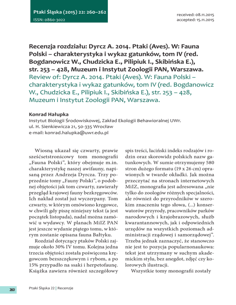 Ptaki Śląska (2015) 22: 260–262 ISSN: 0860-3022 received: 08.11.2015 accepted: 15.11.2015 Recenzja rozdziału: Dyrcz A. 2014. Ptaki (Aves). W: Fauna Polski – charakterystyka i wykaz gatunków, tom IV (red. Bogdanowicz W., Chudzicka E., Pilipiuk I., Skibińska E.), str. 253 – 428, Muzeum i Instytut Zoologii PAN, Warszawa. Review of: Dyrcz A. 2014. Ptaki (Aves). W: Fauna Polski – charakterystyka i wykaz gatunków, tom IV (red. Bogdanowicz W., Chudzicka E., Pilipiuk I., Skibińska E.), str. 253 – 428, Muzeum i Instytut Zoologii PAN, Warszawa. Konrad Hałupka Instytut Biologii Środowiskowej, Zakład Ekologii Behawioralnej UWr. ul. H. Sienkiewicza 21, 50-335 Wrocław e-mail: [email protected] Wiosną ukazał się czwarty, prawie sześćsetstronicowy tom monografii „Fauna Polski”, który obejmuje m.in. charakterystykę naszej awifauny, napisaną przez Andrzeja Dyrcza. Trzy poprzednie tomy „Fauny Polski”, o podobnej objętości jak tom czwarty, zawierały przegląd krajowej fauny bezkręgowców. Ich nakład został już wyczerpany. Tom czwarty, w którym omówiono kręgowce, w chwili gdy piszę niniejszy tekst (a jest początek listopada), nadal można zamówić u wydawcy. W planach MiIZ PAN jest jeszcze wydanie piątego tomu, w którym zostanie opisana fauna Bałtyku. Rozdział dotyczący ptaków Polski zajmuje około 30% IV tomu. Kolejna jedna trzecia objętości została poświęcona kręgowcom bezszczękowym i rybom, a po 15% przypadło na ssaki i herpetofaunę. Książka zawiera również szczegółowy 260 Ptaki Śląska 22 | Recenzje spis treści, łaciński indeks rodzajów i rodzin oraz skorowidz polskich nazw gatunkowych. W sumie otrzymujemy 580 stron dużego formatu (19 x 26 cm) oprawionych w twarde okładki. Jak można przeczytać na stronach internetowych MiIZ, monografia jest adresowana „nie tylko do zoologów różnych specjalności, ale również do przyrodników w szerokim znaczeniu tego słowa, (...) konserwatorów przyrody, pracowników parków narodowych i krajobrazowych, służb kwarantannowych, jak i odpowiednich urzędów na wszystkich poziomach administracji rządowej i samorządowej”. Trzeba jednak zaznaczyć, że stanowczo nie jest to pozycja popularnonaukowa: tekst jest utrzymany w suchym akademickim stylu, bez anegdot, zdjęć czy kolorowych ilustracji. Wszystkie tomy monografii zostały sformatowane w podobny sposób: przyjęto, że podstawową jednostką taksonomiczną, na której zostanie skoncentrowana uwaga autorów, będzie rodzina. Czarno-białe ryciny pokazują pokrój ciała typowego przedstawiciela każdej omawianej grupy. Książka zawiera również, potraktowane bardziej skrótowo, charakterystyki wyższych taksonów oraz opisy poszczególnych rodzajów i gatunków. Sformułowanie „bardziej skrótowo” jest tutaj kluczowe i nie należy tego rozumieć jako „ogólnikowo”, bo z uwagi na duży format książki nawet kilka stron tekstu jest objętościowo równoważnych artykułowi w czasopiśmie. Początek rozdziału dotyczącego awifauny Polski obejmuje kilkustronicowy opis gromady Aves. Dowiemy się na przykład, że „w pasie barkowym występują trzy kości: kość krucza (coracoideum), łopatka (scopula) i obojczyk (clavicula)”. W podobny sposób, dość szczegółowo, autor potraktował wszystkie kolejne układy i narządy organizmu ptaka. Dalej zawarte zostały informacje o reprodukcji i cyklu życiowym ptaków, ich wędrówkach, organizacji badań ornitologicznych w Polsce i ochronie ptaków. W połowie roku 2013 awifauna Polski liczyła 451 gatunków. Rozkład liczby gatunków na poszczególne rodziny i rzędy został przedstawiony w tabeli. Ogółem na terenie Polski zaobserwowano przedstawicieli 68 rodzin, skupionych w 22 rzędach. W tabeli znajdziemy również informacje o liczbie gatunków lęgowych w obrębie każdej rodziny. Pierwsza część rozdziału jest zakończona spisem literatury. Kolejna część, licząca w sumie 142 strony, to opisy rzędów i rodzin. Wyżej wspomniałem, że redaktorzy narzucili autorom monografii taki sam układ treści. Przeglądając książkę, nietrudno jednak zauważyć różnice indywidualne w stylu poszczególnych autorów. Andrzej Dyrcz raczej skrótowo potraktował opisy rzędów: objętość tekstu zawierającego ich charakterystyki to mniej niż 10% tekstu, a 90% to opisy poszczególnych rodzin. W przypadku innych autorów, na przykład w rozdziałach o rybach lub ssakach, proporcje te są bardziej wyrównane i charakterystyki rzędów stanowią nierzadko nawet połowę tekstu. Charakterystyka rzędu uwzględnia opis kluczowych cech morfologicznych, uwagi na temat taksonomii (liczba rodzin i niższych taksonów) i rozmieszczenia na świecie, opis cyklu życiowego (wiek uzyskiwania dojrzałości płciowej, liczba lęgów w sezonie, wielkość zniesienia, przeżywalność), podstawowe dane o ekologii i behawiorze (środowisko, pokarm, przebieg cyklu życiowego, biologia reprodukcji, migracyjność) oraz informacje na temat liczebności, zagrożeń i ochrony. Charakterystyka rzędu kończy się spisem piśmiennictwa oraz angielskim streszczeniem. Podobny układ przyjęto dla opisu poszczególnych rodzin w danym rzędzie. Tutaj jednak informacje są dużo bardziej szczegółowe, uwzględniają też dane o poszczególnych rodzajach i gatunkach. Opis każdej rodziny jest zakończony angielskim streszczeniem i spisem literatury. Przyjęcie zasady, że bibliografia jest prezentowana osobno dla każdego rzędu i rodziny, niewątpliwie ułatwia korzystanie z książki, Recenzje Reviews 261 eliminując konieczność ciągłego jej kartkowania. Ostatnią część rozdziału stanowi, liczący 21 stron, syntetyczny spis poszczególnych rzędów i rodzin wraz ze skrótowymi informacjami o gatunkach. I tak na przykład rząd Galliformes ma w awifaunie Polski 10 przedstawicieli, skupionych w dwóch rodzinach (Phasianinae i Tetraoninae). O jarząbku Tetrastes bonasia dowiadujemy się, że