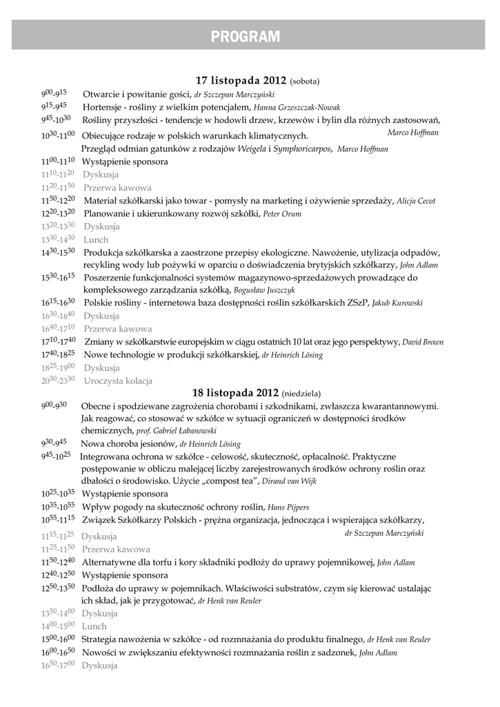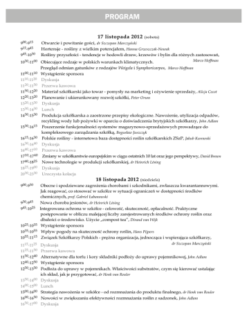 PROGRAM 900-915 915-945 945-1030 17 listopada 2012 (sobota) Otwarcie i powitanie gości, dr Szczepan Marczyński Hortensje - rośliny z wielkim potencjałem, Hanna Grzeszczak-Nowak Rośliny przyszłości - tendencje w hodowli drzew, krzewów i bylin dla różnych zastosowań, 1030-1100 Obiecujące rodzaje w polskich warunkach klimatycznych. 1100-1110 1110-1120 1120-1150 1150-1220 1220-1320 1320-1330 1330-1430 1430-1530 1530-1615 1615-1630 1630-1640 1640-1710 1710-1740 1740-1825 1825-1900 2030-2330 900-930 930-945 945-1025 1025-1035 1035-1055 1055-1115 Marco Hoffman Przegląd odmian gatunków z rodzajów Weigela i Symphoricarpos, Marco Hoffman Wystąpienie sponsora Dyskusja Przerwa kawowa Materiał szkółkarski jako towar - pomysły na marketing i ożywienie sprzedaży, Alicja Cecot Planowanie i ukierunkowany rozwój szkółki, Peter Orum Dyskusja Lunch Produkcja szkółkarska a zaostrzone przepisy ekologiczne. Nawożenie, utylizacja odpadów, recykling wody lub pożywki w oparciu o doświadczenia brytyjskich szkółkarzy, John Adlam Poszerzenie funkcjonalności systemów magazynowo-sprzedażowych prowadzące do kompleksowego zarządzania szkółką, Bogusław Juszczyk Polskie rośliny - internetowa baza dostępności roślin szkółkarskich ZSzP, Jakub Kurowski Dyskusja Przerwa kawowa Zmiany w szkółkarstwie europejskim w ciągu ostatnich 10 lat oraz jego perspektywy, David Brown Nowe technologie w produkcji szkółkarskiej, dr Heinrich Lösing Dyskusja Uroczysta kolacja 18 listopada 2012 (niedziela) Obecne i spodziewane zagrożenia chorobami i szkodnikami, zwłaszcza kwarantannowymi. Jak reagować, co stosować w szkółce w sytuacji ograniczeń w dostępności środków chemicznych, prof. Gabriel Łabanowski Nowa choroba jesionów, dr Heinrich Lösing Integrowana ochrona w szkółce - celowość, skuteczność, opłacalność. Praktyczne postępowanie w obliczu malejącej liczby zarejestrowanych środków ochrony roślin oraz dbałości o środowisko. Użycie „compost tea”, Dirand van Wijk Wystąpienie sponsora Wpływ pogody na skuteczność ochrony roślin, Hans Pijpers Związek Szkółkarzy Polskich - prężna organizacja, jednocząca i wspierająca szkółkarzy, 1115-1125 Dyskusja dr Szczepan Marczyński 1125-1150 Przerwa kawowa 1150-1240 Alternatywne dla torfu i kory składniki podłoży do uprawy pojemnikowej, John Adlam 1240-1250 Wystąpienie sponsora 1250-1350 Podłoża do uprawy w pojemnikach. Właściwości substratów, czym się kierować ustalając ich skład, jak je przygotować, dr Henk van Reuler 1350-1400 Dyskusja 1400-1500 Lunch 1500-1600 Strategia nawożenia w szkółce - od rozmnażania do produktu finalnego, dr Henk van Reuler 1600-1650 Nowości w zwiększaniu efektywności rozmnażania roślin z sadzonek, John Adlam 1650-1700 Dyskusja