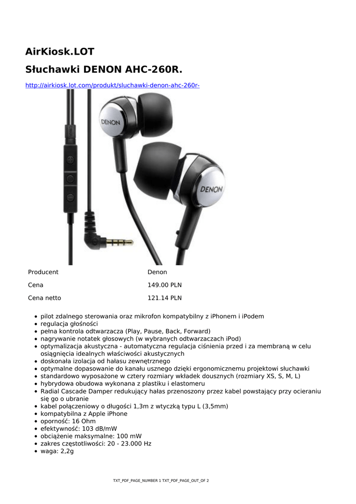 AirKiosk.LOT Słuchawki DENON AHC-260R. http://airkiosk.lot.com/produkt/sluchawki-denon-ahc-260r- Producent Denon Cena 149.00 PLN Cena netto 121.14 PLN pilot zdalnego sterowania oraz mikrofon kompatybilny z iPhonem i iPodem regulacja głośności pełna kontrola odtwarzacza (Play, Pause, Back, Forward) nagrywanie notatek głosowych (w wybranych odtwarzaczach iPod) optymalizacja akustyczna - automatyczna regulacja ciśnienia przed i za membraną w celu osiągnięcia idealnych właściwości akustycznych doskonała izolacja od hałasu zewnętrznego optymalne dopasowanie do kanału usznego dzięki ergonomicznemu projektowi słuchawki standardowo wyposażone w cztery rozmiary wkładek dousznych (rozmiary XS, S, M, L) hybrydowa obudowa wykonana z plastiku i elastomeru Radial Cascade Damper redukujący hałas przenoszony przez kabel powstający przy ocieraniu się go o ubranie kabel połączeniowy o długości 1,3m z wtyczką typu L (3,5mm) kompatybilna z Apple iPhone oporność: 16 Ohm efektywność: 103 dB/mW obciążenie maksymalne: 100 mW zakres częstotliwości: 20 - 23.000 Hz waga: 2,2g TXT_PDF_PAGE_NUMBER 1 TXT_PDF_PAGE_OUT_OF 2 dostępne w kolorze czarnym TXT_PDF_PAGE_NUMBER 2 TXT_PDF_PAGE_OUT_OF 2