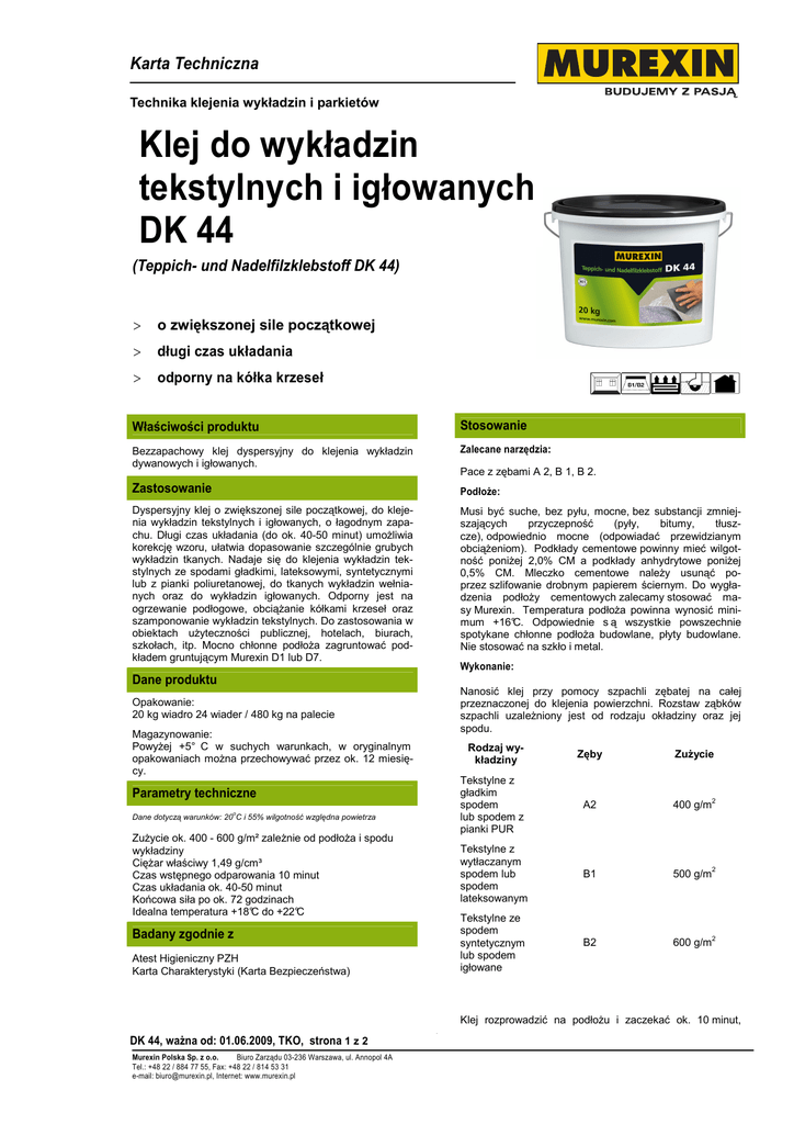 Karta Techniczna Technika klejenia wykładzin i parkietów KLT_DK44.doc Klej do wykładzin tekstylnych i igłowanych DK 44 (Teppich- und Nadelfilzklebstoff DK 44) > o zwiększonej sile początkowej > długi czas układania > odporny na kółka krzeseł Właściwości produktu Stosowanie Bezzapachowy klej dyspersyjny do klejenia wykładzin dywanowych i igłowanych. Zalecane narzędzia: Pace z zębami A 2, B 1, B 2. Zastosowanie PodłoŜe: Dyspersyjny klej o zwiększonej sile początkowej, do klejenia wykładzin tekstylnych i igłowanych, o łagodnym zapachu. Długi czas układania (do ok. 40-50 minut) umoŜliwia korekcję wzoru, ułatwia dopasowanie szczególnie grubych wykładzin tkanych. Nadaje się do klejenia wykładzin tekstylnych ze spodami gładkimi, lateksowymi, syntetycznymi lub z pianki poliuretanowej, do tkanych wykładzin wełnianych oraz do wykładzin igłowanych. Odporny jest na ogrzewanie podłogowe, obciąŜanie kółkami krzeseł oraz szamponowanie wykładzin tekstylnych. Do zastosowania w obiektach uŜyteczności publicznej, hotelach, biurach, szkołach, itp. Mocno chłonne podłoŜa zagruntować podkładem gruntującym Murexin D1 lub D7. Musi być suche, bez pyłu, mocne, bez substancji zmniejszających przyczepność (pyły, bitumy, tłuszcze), odpowiednio mocne (odpowiadać przewidzianym obciąŜeniom). Podkłady cementowe powinny mieć wilgotność poniŜej 2,0% CM a podkłady anhydrytowe poniŜej 0,5% CM. Mleczko cementowe naleŜy usunąć poprzez szlifowanie drobnym papierem ściernym. Do wygładzenia podłoŜy cementowych zalecamy stosować masy Murexin. Temperatura podłoŜa powinna wynosić minimum +16°C. Odpowiednie s ą wszystkie powszechnie spotykane chłonne podłoŜa budowlane, płyty budowlane. Nie stosować na szkło i metal. Wykonanie: Dane produktu Nanosić klej przy pomocy szpachli zębatej na całej przeznaczonej do klejenia powierzchni. Rozstaw ząbków szpachli uzaleŜniony jest od rodzaju okładziny oraz jej spodu. Opakowanie: 20 kg wiadro 24 wiader / 480 kg na palecie Magazynowanie: PowyŜej +5° C w suchych warunkach, w oryginalnym opakowaniach moŜna przechowywać przez ok. 12 miesięcy. Rodzaj wykładziny Parametry techniczne Dane dotyczą warunków: 20oC i 55% wilgotność względna powietrza ZuŜycie ok. 400 - 600 g/m² zaleŜnie od podłoŜa i spodu wykładziny CięŜar właściwy 1,49 g/cm³ Czas wstępnego odparowania 10 minut Czas układania ok. 40-50 minut Końcowa siła po ok. 72 godzinach Idealna temperatura +18°C do +22°C Badany zgodnie z Atest Higieniczny PZH Karta Charakterystyki (Karta Bezpieczeństwa) Zęby ZuŜycie Tekstylne z gładkim spodem lub spodem z pianki PUR A2 400 g/m2 Tekstylne z wytłaczanym spodem lub spodem lateksowanym B1 500 g/m2 Tekstylne ze spodem syntetycznym lub spodem igłowane B2 600 g/m2 Klej rozprowadzić na podłoŜu i zaczekać ok. 10 minut, DK 44, waŜna od: 01.06.2009, TKO, strona 1 z 2 Murexin Polska Sp. z o.o. Biuro Zarządu 03-236 Warszawa, ul. Annopol 4A Tel.: +48 22 / 884 77 55, Fax: +48 22 / 814 53 31 e-mail: [email protected], Internet: www.murexin.pl 1 Karta Techniczna Technika klejenia wykładzin i parkietów KLT_DK44.doc następnie rozłoŜyć wykładzinę w mokry jeszcze klej i dokładnie rozetrzeć na całej powierzchni. Czas układania łącznie z czasem wstępnego odparowania jest ograniczony i wynosi 40-50 min. Wykładzina, która ma być odporna na nacisk krzeseł na kółkach moŜe być obciąŜana najwcześniej po upływie ok. 48 godzin. Perfekcyjny system Gruntowanie: Podkład gruntujący D1 1:3 z wodą Wyrównywanie podłoŜa: Masa samopoziomująca ST12, ST25, NE30 lub OS50 Klejenie: Klej do wykładzin DK44 WaŜne informacje Przestrzegać norm, obowiązujących przepisów oraz zaleceń podanych w niniejszej karcie technicznej! Nie prowadzić prac w temperaturze niŜszej niŜ +5oC. Wysoka wilgotność oraz niskie temperatury mogą być przyczyną wydłuŜenia czasu wiązania. Wysoka temperatura produktu moŜe przyczynić się do przyśpieszenia wiązania. Nie dodawać Ŝadnych obcych materiałów. Bezpieczeństwo i higiena pracy BHP: przestrzegać specyfikacji oraz informacji o stosowaniu, czyszczeniu i utylizacji podanych w Karcie Charakterystyki produktu. Niniejsza karta techniczna bazuje na rozległym doświadczeniu, została stworzona z najlepszej woli, nie jest prawnie wiąŜąca i nie jest ofertą w rozumieniu prawa czy teŜ gwarancją wynikającą z zamówienia lub umowy sprzedaŜy. Dla dobra naszych materiałów dołączamy ją w ramach warunków sprzedaŜy i dostawy. Aby zapobiegać ryzyku popełnienia błędów zawarto równieŜ określone (ograniczone) informacje. Naturalnie nie mogą być tam dokładnie opisane wszystkie dotychczasowe i moŜliwe zastosowania produktu. Zrezygnowano z danych, które dla fachowców są oczywiste. UŜytkownik moŜe w przypadku niejasności przeprowadzić próbę na miejscu budowy na własną odpowiedzialność. Nie jest teŜ zwolniony z obowiązku z fachowej obróbki i stosowania. W momencie wydania nowego opracowania tej karty technicznej, poprzednia wersja traci swoją waŜność. DK 44, waŜna od: 01.06.2009, TKO, strona 2 z 2 Murexin Polska Sp. z o.o. Biuro Zarządu 03-236 Warszawa, ul. Annopol 4A Tel.: +48 22 / 884 77 55, Fax: +48 22 / 814 53 31 e-mail: [email protected], Internet: www.murexin.pl 2
