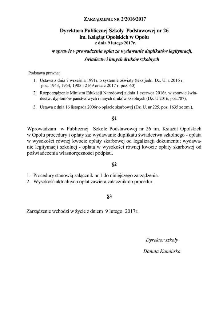 ZARZĄDZENIE NR 2/2016/2017 Dyrektora Publicznej Szkoły Podstawowej nr 26 im. Książąt Opolskich w Opolu z dnia 9 lutego 2017r. w sprawie wprowadzenia opłat za wydawanie duplikatów legitymacji, świadectw i innych druków szkolnych Podstawa prawna: 1. Ustawa z dnia 7 września 1991r. o systemie oświaty (teks jedn. Dz. U. z 2016 r. poz. 1943, 1954, 1985 i 2169 oraz z 2017 r. poz. 60) 2. Rozporządzenie Ministra Edukacji Narodowej z dnia 1 czerwca 2016r. w sprawie świadectw, dyplomów państwowych i innych druków szkolnych (Dz. U.2016, poz.787), 3. Ustawa z dnia 16 listopada 2006r o opłacie skarbowej (Dz. U. nr 225, poz. 1635 ze zm.). §1 Wprowadzam w Publicznej Szkole Podstawowej nr 26 im. Książąt Opolskich w Opolu procedury i opłaty za: wydawanie duplikatu świadectwa szkolnego - opłata w wysokości równej kwocie opłaty skarbowej od legalizacji dokumentu; wydawanie legitymacji szkolnej - opłata w wysokości równej kwocie opłaty skarbowej od poświadczenia własnoręczności podpisu. §2 1. Procedury stanowią załącznik nr 1 do niniejszego zarządzenia. 2. Wysokość aktualnych opłat zawiera załącznik do procedur. §3 Zarządzenie wchodzi w życie z dniem 9 lutego 2017r. Dyrektor szkoły Danuta Kamińska Załącznik nr 1 do Zarządzenia nr 2 /2016/2017 Dyrektora Publicznej Szkoły Podstawowej nr 26 im. Książąt Opolskich w Opolu z dnia 9 lutego 2017 r. PROCEDURY WYDAWANIA DUPLIKATÓW ŚWIADECTW, LEGITYMACJI SZKOLNYCH I INNYCH DRUKÓW SZKOLNYCH Podstawa prawna: 1. Ustawa z dnia 7 września 1991r. o systemie oświaty (teks jedn. Dz. U. z 2016 r. poz. 1943, 1954, 1985 i 2169 oraz z 2017 r. poz. 60) 2. Rozporządzenie Ministra Edukacji Narodowej z dnia 1 czerwca 2016r. w sprawie świadectw, dyplomów państwowych i innych druków szkolnych (Dz. U.2016, poz.787), 3. Ustawa z dnia 16 listopada 2006r o opłacie skarbowej (Dz. U. nr 225, poz. 1635 ze zm.). I. Postanowienia ogólne. 1. Duplikaty bądź też odpisy świadectw szkolnych, legitymacji szkolnych są wydawane na pisemny wniosek skierowany do dyrektora szkoły. 2. Duplikaty i odpisy świadectw szkolnych, legitymacji szkolnych wydawane są odpłatnie. 3. Duplikaty i odpisy mają moc oryginału i mogą być wystawiane ponownie. II. Świadectwa szkolne. 1. W przypadku utraty lub zniszczenia świadectwa szkolnego rodzice ucznia lub pełnoletni absolwent mogą złożyć w sekretariacie szkoły (przesłać listem na adres szkoły) pisemny wniosek skierowany do dyrektora szkoły o wydanie duplikatu z określeniem: -wnioskodawcy, -rodzaju dokumentu (świadectwo ukończenia szkoły, klasy), -roku ukończenia klasy, szkoły; Wzór wniosku stanowi załącznik nr 2 1. Do wniosku należy dołączyć dowód opłaty w wysokości określonej w załączniku do ustawy o opłacie skarbowej. 2. Termin wykonania duplikatu do 7 dni. Jeśli przedłożony wniosek zawiera wymagane informacje, a dokumentacja niezbędna do wystawienia duplikatu znajduje się w szkole. 3. Duplikat wystawia się na druku obowiązującym w okresie wystawienia oryginału lub na formularzu zgodnym z treścią oryginału świadectwa Duplikat zawiera: a. wyraz : Duplikat"- na pierwszej stronie u góry, b. dane zgodne z dokumentacją pedagogiczną, c. pod tekstem należy podać wyrazy "oryginał podpisali" i wymienić nazwiska osób, które oryginał podpisały lub stwierdzić nieczytelność podpisów, d. datę wystawienia duplikatu, e. podpis dyrektora szkoły, f. pieczęć urzędową 4. Jeżeli szkoła nie posiada dokumentacji przebiegu nauczania albo nie jest ona wystarczająca do wystawienia duplikatu, wydaje się zaświadczenie stwierdzające, że wystawienie duplikatu nie jest możliwe. 5. W tym przypadku odtworzenie oryginału świadectwa może nastąpić na podstawie odrębnych przepisów, w drodze postępowania sądowego. 6. Duplikat może zostać odebrany osobiście przez osobę zainteresowaną lub przez inne osoby posiadające pisemne upoważnienie po potwierdzeniu odbioru dokumentu własnoręcznym podpisem lub wysyłany jest pod wskazany we wniosku adres listem poleconym za zwrotnym potwierdzeniem odbioru. 7. Duplikat ma moc oryginału i może być wystawiony ponownie 8. Duplikat może zostać odebrany osobiście przez osobę zainteresowaną lub przez inne osoby posiadające pisemne upoważnienie-za potwierdzeniem odbioru. 9. W przypadku przesłania duplikatu dokumentu pocztą doręczenie następuje listem poleconym za zwrotnym potwierdzeniem odbioru. III. Legitymacje szkolne. 1. W przypadku zniszczenia lub utraty legitymacji szkolnej rodzice ucznia mogą wystąpić do dyrektora szkoły z pisemnym wnioskiem, o wydanie duplikatu legitymacji szkolnej, z podaniem przyczyny ubiegania się o duplikat. Wzór wniosku stanowi załącznik nr 3 2. Do wniosku należy dołączyć: 1) 1 zdjęcie (format: 30 x 42 mm) opisane danymi ucznia: a. imieniem i nazwiskiem, b. datą urodzenia, c. adresem zamieszkania; 2) do wniosku należy dołączyć dowód opłaty w wysokości określonej w załączniku do usta wy o opłacie skarbowej. 3. Termin wykonania duplikatu do 7 dni. Jeżeli przedłożony wniosek zawiera wymagane informacje, a dokumentacja niezbędna do wystawienia duplikatu znajduje się w szkole. IV. Postanowienia końcowe. 1. Procedury powyższe obowiązują wszystkich uczniów i absolwentów. 2. Procedury wchodzą w życie z dniem 13 lutego 2017 r. i obowiązują do czasu ich zmiany. 1) Konto Publicznej Szkoły Podstawowej nr 26 im. Książąt Opolskich w Opolu i aktualne wysokości opłat podaje się w załączniku nr 1 do niniejszych procedur. Załącznik Nr 1 do procedur wydawania duplikatów świadectw, legitymacji szkolnych (...) w Publicznej Szkole Podstawowej nr 26 im. Książąt Opolskich w Opolu I. Od dnia 9 lutego 2017 r. za wydawanie duplikatów lub odpisów świadectw, legitymacji szkolnych w Publicznej Szkole Podstawowej nr 26 im. Książąt Opolskich w Opolu wysokość opłat wynosi: 1. za wydanie duplikatu świadectwa szkolnego: 26,00 zł (opł