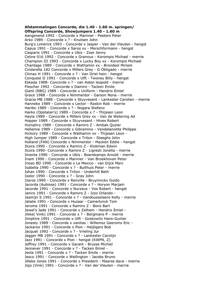 Afstammelingen Concorde, die 1.40 - 1.60 m. springen/ Offspring Concorde, Showjumpers 1.40 - 1.60 m Aangenend 1992 - Concorde x Marinier - Peeters Peter Arko 1989 - Concorde x ? - Knutsen John Burg's Limerick 1993 - Concorde x Jasper - Van der Vleuten - hengst Capua 1991 - Concorde x Saros xx - Merschformann - hengst Casparis 1991 - Concorde x Ubis - Zoer Jenny Celine 016 1992 - Concorde x Grannus - Korompis Michael - merrie Champion III 1993 - Concorde x Lucky Boy xx - Korompis Michael Chantage 1989 - Concorde x Wathamin xx - Brondeel Miriam Cinderella 182 Concorde x Millers Grey - G Obligado - merrie Climax H 1991 - Concorde x ? - Van Driel hein - hengst Conquest II 1991 - Concorde x Ulft - Twoney Billy - hengst Eskada 1988- Concorde x ? - van Asten leopold - merrie Flescher 1992 - Concorde x Damiro - Tacken Emile Giant (RBG) 1989 - Concorde x Uniform - Hendrix Emiel Grace 1988 - Concorde x Nimmerdor - Garson Nona - merrie Gracia MB 1988 - Concorde x Stuyvesant - Lankester Carolien - merrie Hanneke 1989 - Concorde x Lector - Raskin Rob - merrie Haribo 1989 - Concorde x ? - Nogara Stefano Harko (Opstalan's) 1989 - Concorde x ? - Thijssen Leon Hayla 1989 - Concorde x Millers Grey xx - Van de Wetering Ad Hopper 1989 - Concorde x Stuyvesant - Hines Robert Humphry 1989 - Concorde x Ramiro Z - Ambak Quzier Hellemie 1989 - Concorde x Gibramino - Vandelanoitte Philippe Hickory 1989 - Concorde x Wathamin xx - Thijssen Leon High Jumper 1989 - Concorde x Triton - Steeghs John Holland (FAN) Concorde x Nimmerdor - Macken Eddie - hengst Ilcora 1990 - Concorde x Ramiro Z - Klokman Edwin Ilcora 1990- Concorde x Ramiro Z - Ligresti Jonella - merrie Imenta 1990 - Concorde x Ubis - Boerekamps Arnold - merrie Iriam 1990 - Concorde x Marinier - Van Broekhoven Peter Irioso BD 1990 - Concorde x Le Mexico - van Dijck Marc Isabella 1990 - Concorde x ? - Bulthuis Peter - merrie Ishan 1990 - Concorde x Triton - Underhill Beth Isidor 1990 - Concorde x ? - Gray John Izaros 1990 - Concorde x Renville - Bruyninckx Guido Jacorda (Aubiose) 1991 - Concorde x ? - Horyon Marjam Jacorde 1991 - Concorde x Nurzeus - Vos Robert - hengst Janiro 1991 - Concorde x Ramiro Z - Izzo Orlando Jasmijn S 1991 - Concorde x ? - Vandousselaere Kelly - merrie Jatalie 1991 - Concorde x Huzaar - Camerlynck Tom Jerome 1991 - Concorde x Ramiro Z - Bons Bart Jewel's Jade 1991 - Concorde x Zelhem - Hendrix Emiel Jikke( Vink) 1991 - Concorde x ? - Bergmans P - merrie Jimphire 1991 - Concorde x Ulft - Goskowitz Hans-Gunter Jonesty 1989 - Concorde x vanitas - Willemsz Geeroms Eric Jackaroo 1991 - Concorde x Pion - Heijligers Bob Jacquet 1992 - Concorde x ? - Vrieling Jur Jagger MB 1991 - Concorde x ? - Lankester Carolijn Jazz 1991 - Concorde x Pion - hengst (KWPN, Z) Jeffrey 1991 - Concorde x Garant - Brusse Michiel Jennever 1991 - Concorde x ? - Tacken Emiel Jeola 1991 - Concorde x ? - Tacken Emile - merrie Jesco 1991 - Concorde x Wellington - Jacobs Bruno Jilleke Jones 1991 - Concorde x President - Maarse dave - merrie Jojo (Vink) 1991 - Concorde x ? - Van der Vleuten - merrie Jovanni 1991 - Concorde x ? - Van der Vleuten Eric Joyrider (ex. Jambo) 1991 Concorde x Pele - hengst (BWP) Jumbo Jet 1991 - Concorde x Akteur - Van de Pol Henk - hengst Jumper 1991 - Concorde x Ahorn - Meijer Marleen Kafka 1992 - Concorde x ? - Zoer Jenny - hengst Karose 1992 - Concorde x Lucky Boy xx - De Bock Valentijn Kastello 1992 - Concorde x Notaris - Van den Broek Henk - hengst Kathja (Vink) 1992 - Concorde x Sultan - Van der Vleueten E - merrie Kenwi 1992 - Concorde x ? - Coumans Gabriel - merrie Kermie 1992 - Concorde x Werathostenes - Van de Vleuten Eric Kim 1992 - Concorde x Ronald - Hendrix Bart Koncordes 1992 - Concorde x Prince Paradiso - Steeghs Luc Kondor ( ex. Kelvira) 1992 - Concorde x Ramiro Z - Holtus Toon - merrie Konkorde 1992 - Concorde x Joost - Remmen George Koncordy 1992 - Concorde x Renville - Van Looveren Dirk Kordofan 1992 - Concorde x le Mexico - Willemsz geeroms E L'Accorde B 1993 - Concorde x Notaris- Gulliksen geir Ladonis 1993 - Concorde x Akteur - Steeghs Luc Larini 1993 - Concorde x Ulft - Van den Broek henk - hengst Larino 1993 - Concorde x Armstring - Geering Peter - hengst Larone 1993 - Concorde x Farn - Van Asten mathijs - hengst Laroche 1993 - Concorde x Nimmerdor - Brinkman Marco Lanea 1993 - Concorde x Joost - Monari Paolo - merrie Le Concorde 1993 - Concorde x Courville xx - B. Feenstra - hengst Lebora 1993 - Concorde x Irco Polo - Geurts Emiel - merrie Leon VI 1993 - Concorde x Jasper - Lauber Stefan - hengst Lesley 1993 - Concorde x ? - Van Schijndel Rien - merrie Letoile 1993 - Concorde x Nurzeus - Van Groesen Dion - merrie Lift Off 1990 - Concorde x Joost - Stockdale Tim Limbo 1993 - Concorde x Rivaal - hengst (SBS) Namiro van de Zuuthoeve 1990 - Concorde x Ramiro Z- Vergauwen Joris Ncorde 1991 - Concorde x Lord Gotthard - Floren Wilfried (BWP) Oberon van Fiandra 1992 - Concorde x Ramiro Z - Vandoorne Philippe Orion van de Zuuthoeve 1991 - Concorde x Carneval - Vergauwen Joris Orona vh Hollaeken 1991 - Concorde x ? - Peeters Luc Phenomenon 1993 - Concorde x Zeoliet - Ridland Robert Premier des Hayettes 1992 - Concorde x Nimmerdor - Nezer Catherine - hengst Priamos 1992 - Concorde x Gondelier - Bedford Anne hengst (BWP) Principal van Thorneseele 1992 -Concorde x Lys de Darmen-Goodin Bruce - hengst Silver prince 1991 - Concorde x ? - Oeuvray dehlia Suprise PTB (ex. Hilbert) 1989 - Concorde x Farn - La Croix Frank The Megabyte 1994 - Concorde x Ahorn - Baker Charles - hengst Viktor 19912 - Concorde x Bentley - Mathy François jr Grootvader Concorde Kyra 1992 - Aram x Concorde - Wim Smet -merrie Le Gratio 1993 - Gracio x Concorde - hengst Lincoln 1993 - Gracio x Concorde - Holmberg Janet - merrie
