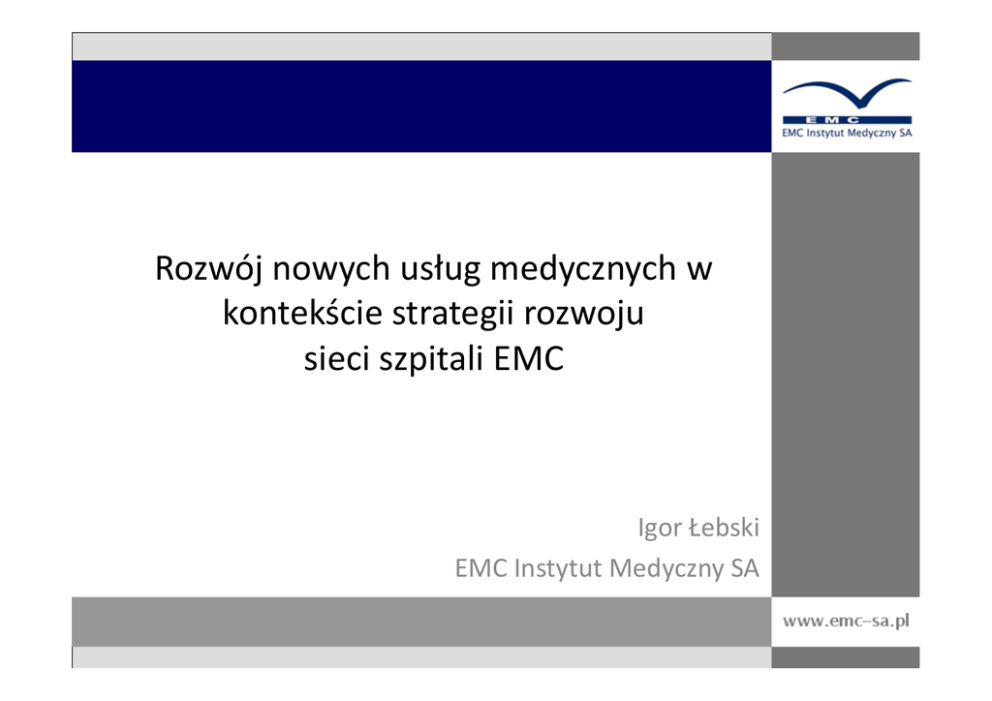 Rozwój nowych usług medycznych w Rozwój nowych usług medycznych w kontekście strategii rozwoju sieci szpitali EMC i i it li EMC Igor Łebski EMC Instytut Medyczny SA Kim jesteśmy Kim jesteśmy • EMC Instytut Medyczny jest największym aktualnie właścicielem prywatnych szpitali i przychodni w Polsce. • Spółka powstała w 2000 roku, a od 2005 roku jest notowana na Warszawskiej Giełdzie Papierów Wartościowych. • Obecnie w sieci EMC funkcjonuje 8 szpitali Ob i i i EMC f k j j 8 i li oraz 16 przychodni h d i specjalistycznych i podstawowej opieki zdrowotnej. • EMC Instytut Medyczny zatrudnia ponad 2100 EMC Instytut Medyczny zatrudnia ponad 2100 osób, osób w tym ponad 1600 pracowników personelu medycznego. • Wysoką jakość usług świadczonych przez EMC potwierdza m.in. Wysoką jakość usług świadczonych przez EMC potwierdza m in wdrożony w jednostkach należących do sieci globalny certyfikat ISO 9001:2008 oraz liczne nagrody, w tym DEKRA AWARD j j y g g p y i czołowe miejsca w krajowych rankingach usług szpitalnych. I Kongres Szpitali Prywatnych, 23 maja 2011 www.emc-sa.pl NASZE JEDNOSTKI Kamień Pomorski Piaseczno Lubin Ś Świebodzice Kowary I Kongres Szpitali Prywatnych, 23 maja 2011 Wrocław Ozimek Ząbkowice Śląskie Katowice www.emc-sa.pl NASZE JEDNOSTKI POLSKA S it l Szpitale EuroMediCare we Wrocławiu Szpital Specjalistyczny z Przychodnią Szpital p św. Rocha w Ozimku koło Opola p Szpital św. Antoniego w Ząbkowicach Śląskich Szpital św. Jerzego w Kamieniu Pomorskim Szpital Mikulicz w Świebodzicach Szpital Bukowiec w Kowarach Szpital Geriatryczny im. Jana Pawła II w Katowicach Szpital św. Anny w Piasecznie Przychodnie Zespół Przychodni Lubmed w Lubinie Przychodnia przy Łowieckiej we Wrocławiu Zespół Przychodni Formica we Wrocławiu IRLANDIA EMC Health Care Ltd. w Dublinie I Kongres Szpitali Prywatnych, 23 maja 2011 www.emc-sa.pl Strategia rozwoju Strategia rozwoju EMC Strategia EMC Strategia EMC EMC Objęcie opieką medyczną 5% populacji Polski do 2015 r Rozbudowa sieci szpitali i przychodni Maksymalizacja synergii medycznej i pozamedycznej w obrębie sieci Maksymalizacja synergii medycznej i pozamedycznej w obrębie sieci Elastyczna odpowiedź na y p trendy demograficzne Długofalowe strategie płatników Oczekiwania pacjentów Oczekiwania pacjentów I Kongres Szpitali Prywatnych, 23 maja 2011 Szkoła Endoskopii EMC Szkoła Endoskopii EMC Cel: l Zwiększenie dostępności do usług medycznych z zakresu ChMI we wszystkich placówkach EMC y p Laparoskopia ‐ Polska vs Europa: 50% vs 80% (LCH: 60% vs 90%, Hsc 3,8% vs 75%) Metody: Transfer know‐how i technologii z ośrodków specjalistycznych do p podstawowych y Współpraca z wybitnymi specjalistami Warsztaty g Travelling consultants Wykorzystanie telemedycyny (transmisje, distant learning) Optymalizacja wykorzystania sprzętu I Kongres Szpitali Prywatnych, 23 maja 2011 Szkoła Endoskopii EMC Szkoła Endoskopii EMC Ośrodki wyspecjalizowane w chirurgii minimalnie inwazyjnej Ośrodki wyspecjalizowane w chirurgii minimalnie inwazyjnej Wrocław – Wrocław – Szpital Specjalistyczny EuroMediCare Szpital Specjalistyczny EuroMediCare chirurgia i endoskopia przewodu pokarmowego; ginekologia, urologia, ortopedia d Piaseczno Piaseczno –– Szpital Św. Anny – chirurgia przewodu pokarmowego, ginekologia Ozimek – Szpital Św. Rocha ‐ chirurgia przewodu pokarmowego Szpitale o profilu podstawowym Ząbkowice Śl. Ś Kamień Pomorski Świebodzice Kowary I Kongres Szpitali Prywatnych, 23 maja 2011 Szkoła Endoskopii EMC Szkoła Endoskopii EMC Efekty: y Wzrost jakości wykonywanych Wzrost jakości wykonywanych operacji MI Wzrost ilości operacji MI vs klasyczne Powstanie regionalnych centrów ChMI – placówki EMC I Kongres Szpitali Prywatnych, 23 maja 2011 Opieka Geriatryczna Opieka Geriatryczna • Osoby 65+ 2008 – 13,5%; 2030 – 23,8% • Specyfika rynku Specyfika rynku – Nierówny dostęp do opieki geriatrycznej • Łóżka: 0,09 vs 2 / 10 000 • Specjaliści: 0,3 vs S j liś i 0 3 5 / 100 000 5 / 100 000 – Słaba wiedza o specyfice i potrzebach osób starszych – Źle definiowane potrzeby medyczne i Ź alokacja środków – Brak know‐how I Kongres Szpitali Prywatnych, 23 maja 2011 Opieka Geriatryczna Opieka Geriatryczna Szpital Geriatryczny w Katowicach Szpital Geriatryczny w Katowicach – l h od d 2008 w strukturach EMC – Pierwszy (1960) i jedyny ośrodek monospecjalistyczny tego typu w Polsce – Opieka medyczna dla pacjentów 65+, p y p j , szkolenie kadr, badania naukowe, współpraca z AM, AWF, Uniwersytetem w Strasbourgu I Kongres Szpitali Prywatnych, 23 maja 2011 Opieka Geriatryczna Opieka Geriatryczna Cel: poprawa jakości usług medycznych dla pacjentów 65+ w placówkach EMC pacjentów 65+ w placówkach EMC Metody: T Transfer wiedzy f i d • Szkolenie ‐ lekarze (specjalizacje), pielęgniarki, rehabilitanci, recepcja • Wdrożenie Całościowej Oceny Geriatrycznej • Nowe usługi (Przegląd po 60‐tce; chirurgia geriatryczna, teleopieka) I Kongres Szpitali Prywatnych, 23 maja 2011 Opieka Geriatryczna Opieka Geriatryczna Efekty: – Zbudowanie unikalnego modelu kompleksowej opieki nad pacjentami 65+ opartego o sieć wieloprofilowych placówek EMC – Wyższa jakość i dostępność usług dla pacjentów 6 65+ w placówkach EMC (opieka ambulatoryjna i l ó k h C( i k b l j i szpitalna) I Kongres Szpitali Prywatnych, 23 maja 2011 Wnioski Dla grupy EMC, obejmującej opieką ok. 1 mln pacjentów, kluczowe jest wdrażanie nowych modeli realizacji usług medycznych, obejmujących całe grupy populacyjne i jak największą ilość placówek EMC wraz z transferem wied wiedzyy i technologii pomięd pomiędzyy nimi, co warunkuje dodatnią synergię g py grupy. I Kongres Szpitali Prywatnych, 23 maja 2011