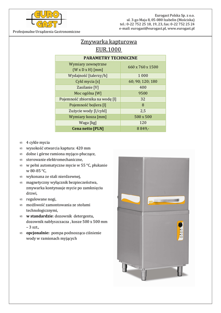 Eurogast Polska Sp. z o.o. ul. 3-go Maja 8, 05-080 Izabelin (Mościska) tel.: 0-22 752 25 18, 19, 23, fax: 0-22 752 25 24 e-mail: [email protected], www.eurogast.pl Profesjonalne Urządzenia Gastronomiczne Zmywarka kapturowa EUR.1000 PARAMETRY TECHNICZNE Wymiary zewnętrzne (W x D x H) [mm] Wydajność [talerzy/h] Cykl mycia [s] Zasilanie [V] Moc ogólna [W] Pojemność zbiornika na wodę [l] Pojemność bojlera [l] Zużycie wody [l/cykl] Wymiary kosza [mm] Waga [kg] Cena netto [PLN] • • • • • • • • • • • 4 cykle mycia wysokość otwarcia kaptura: 420 mm dolne i górne ramiona myjąco-płuczące, sterowanie elektromechaniczne, w pełni automatyczne mycie w 55 °C, płukanie w 80-85 °C, wykonana ze stali nierdzewnej, magnetyczny wyłącznik bezpieczeństwa, zmywarka kontynuuje mycie po zamknięciu drzwi, regulowane nogi, możliwość zamontowania ze stołami technologicznymi, w standardzie: dozownik detergentu, dozownik nabłyszczacza , kosze 500 x 500 mm – 3 szt., opcjonalnie: pompa podnosząca ciśnienie wody w ramionach myjących 660 x 760 x 1500 1 000 60; 90; 120; 180 400 9500 32 8 2,5 500 x 500 120 8 849,-