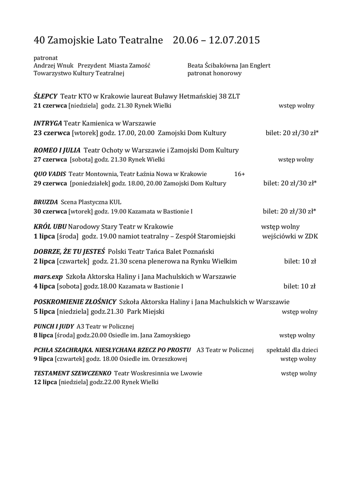 40 Zamojskie Lato Teatralne 20.06 – 12.07.2015 patronat Andrzej Wnuk Prezydent Miasta Zamość Towarzystwo Kultury Teatralnej Beata Ścibakówna Jan Englert patronat honorowy ŚLEPCY Teatr KTO w Krakowie laureat Buławy Hetmańskiej 38 ZLT 21 czerwca [niedziela] godz. 21.30 Rynek Wielki wstęp wolny INTRYGA Teatr Kamienica w Warszawie 23 czerwca [wtorek] godz. 17.00, 20.00 Zamojski Dom Kultury bilet: 20 zł/30 zł* ROMEO I JULIA Teatr Ochoty w Warszawie i Zamojski Dom Kultury 27 czerwca [sobota] godz. 21.30 Rynek Wielki QUO VADIS Teatr Montownia, Teatr Łaźnia Nowa w Krakowie 29 czerwca [poniedziałek] godz. 18.00, 20.00 Zamojski Dom Kultury wstęp wolny 16+ bilet: 20 zł/30 zł* BRUZDA Scena Plastyczna KUL 30 czerwca [wtorek] godz. 19.00 Kazamata w Bastionie I bilet: 20 zł/30 zł* KRÓL UBU Narodowy Stary Teatr w Krakowie 1 lipca [środa] godz. 19.00 namiot teatralny – Zespół Staromiejski wstęp wolny wejściówki w ZDK DOBRZE, ŻE TU JESTEŚ Polski Teatr Tańca Balet Poznański 2 lipca [czwartek] godz. 21.30 scena plenerowa na Rynku Wielkim bilet: 10 zł mars.exp Szkoła Aktorska Haliny i Jana Machulskich w Warszawie 4 lipca [sobota] godz.18.00 Kazamata w Bastionie I bilet: 10 zł POSKROMIENIE ZŁOŚNICY Szkoła Aktorska Haliny i Jana Machulskich w Warszawie 5 lipca [niedziela] godz.21.30 Park Miejski wstęp wolny PUNCH I JUDY A3 Teatr w Policznej 8 lipca [środa] godz.20.00 Osiedle im. Jana Zamoyskiego PCHŁA SZACHRAJKA. NIESŁYCHANA RZECZ PO PROSTU A3 Teatr w Policznej 9 lipca [czwartek] godz. 18.00 Osiedle im. Orzeszkowej TESTAMENT SZEWCZENKO Teatr Woskresinnia we Lwowie 12 lipca [niedziela] godz.22.00 Rynek Wielki wstęp wolny spektakl dla dzieci wstęp wolny wstęp wolny Imprezy towarzyszące MASKA TEATRALNA – podsumowanie konkursu plastycznego 18 czerwca godz. 14.00 BWA Galeria Zamojska ZAMOJSKA ARLEKINADA 2015 20 czerwca godz. 21.00 Rynek Wielki ROMEO I JULIA W ZAMOŚCIU – akcje parateatralne 22 i 24 czerwca godz. 18.00 Rynek Wielki LETNIE SPOTKANIE MUZYCZNO - POETYCKIE „Vis-a-vis” spektakl Piotra „Kuby” Kubowicza 26 czerwca godz.19.00 Corner Pub wstęp wolny PAWEŁ DUDZIŃSKI W ZAMOJSKIEJ ALEI SŁAW 3 lipca godz. 16.00 ul. Grodzka KONCERT PIOSENKI AKTORSKIEJ – Szkoła Aktorska Haliny i Jana Machulskich w Warszawie 3 lipca godz.19.00 Corner Pub 4 lipca godz. 21.00 scena plenerowa na Rynku Wielkim SZUKAMY POLSKIEGO SZEKSPIRA - podsumowanie piętnastej edycji zamojskiej Konkursu Dramaturgicznego na Sztukę Teatralną 4 lipca godz.18.00 Kazamata w Bastionie I CZŁOWIEK I NADCZŁOWIEK retransmisja spektaklu z National Theatre w Londynie 7 lipca godz. 18.30 Centrum Kultury Filmowej bilet: 20/25 zł w CKF TAM I Z POWROTEM – monodram Patryka Pawelca 10 lipca godz. 19.00 Kazamata w Bastionie II MARZENIE NATASZY Teatr Nowy w Lublinie 11 lipca godz. 19.00 Piwnica pod Kameralną ul. Zamenhofa 12 wstęp wolny bilet: 20 zł w Kameralnej Najstarsze afisze i plakaty Zamojskiego Lata Teatralnego – wystawa wirtualna strona internetowa Archiwum Państwowego w Zamościu Początki Zamojskiego Lata Teatralnego wystawa zdjęć Mirosława Chmiela od 20 czerwca Zamojski Dom Kultury Plenerowa wystawa fotograficzna ZAMOJSKIE LATO TEATRALNE 20 czerwca – 12 lipca Zespół Staromiejski Współfinansowanie: Miasto Zamość Wsparcie finansowe: Starostwo Powiatowe w Zamościu Sponsor główny PKP LHS sp. z o.o. Sponsorzy: PKO BP S.A. MULTIMEDIA POLSKA S.A. PGE Dystrybucja S.A. VEOLIA WSCHÓD sp. z o.o. Patronat medialny: Wszystkie anioły i dobre duchy medialne Partnerzy: Spółdzielnia Mieszkaniowa im. Waleriana Łukasińskiego w Zamościu Spółdzielnia Mieszkaniowa im. Jana Zamoyskiego w Zamościu Zamojski Klub Karate Tradycyjnego Centrum Kultury Filmowej STYLOWY BWA Galeria Zamojska Corner Pub Archiwum Państwowe w Zamościu Hotel Mercure Salon Muzyczny Sopran w Zamościu Klub Festiwalowy - Corner Pub Organizator 40 Zamojskiego Lata Teatralnego: Zamojski Dom Kultury, tel. (84) 6392021/22, www.zdk.zamosc.pl *cena biletu: w przedsprzedaży od 1 do 16 czerwca/ od 17 czerwca karnet (oprócz: „Człowiek i nadczłowiek” i „Marzenie Nataszy”) 50 zł bilety i karnety do nabycia w ZDK, ZOIT oraz dwie godziny przed spektaklem więcej informacji na stronie www.zdk.zamosc.pl