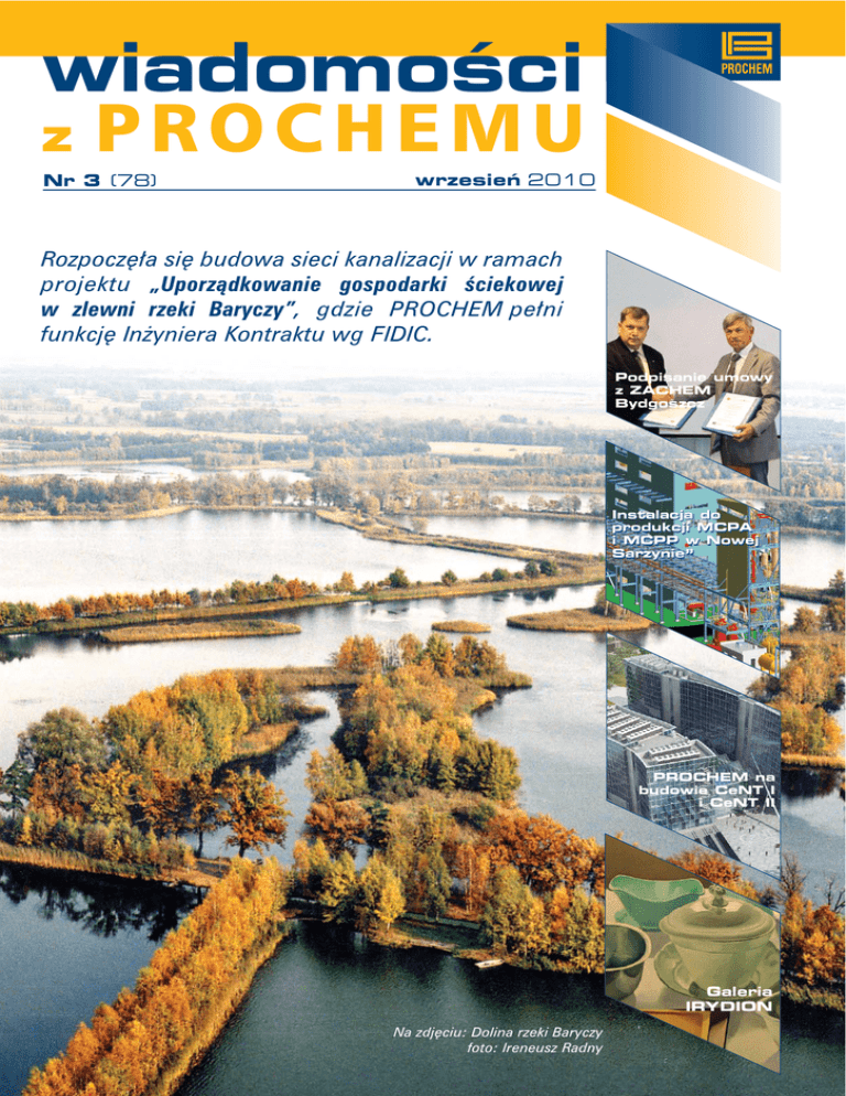 wiadomoÊci z PROCHEMU Nr 3 (78) wrzesieƒ 2010 Rozpocz´∏a si´ budowa sieci kanalizacji w ramach projektu „Uporzàdkowanie gospodarki Êciekowej w zlewni rzeki Baryczy”, gdzie PROCHEM pe∏ni funkcj´ In˝yniera Kontraktu wg FIDIC. Podpisanie umowy z ZACHEM Bydgoszcz Instalacja do produkcji MCPA i MCPP w Nowej Sarzynie” PROCHEM na budowie CeNT I i CeNT II Galeria IRYDION Na zdj´ciu: Dolina rzeki Baryczy foto: Ireneusz Radny wiadomoÊci z PROCHEMU S P I SPIS T R TREÂCI E  C I S wiadomoÊci z PROCHEMU WYDARZENIA 1 Nadzwyczajne Walne Zgromadzenie Teresa Wygryzowska 1 Podpisanie umowy z ZACHEM Bydgoszcz Magda Czekaj 2 Prezes: mgr in˝. Jaros∏aw St´pniewski Redakcja: mgr in˝. Teresa Wygryzowska Rozpocz´cie robót budowlanych w Dolinie Baryczy Teresa Wygryzowska 3 Instalacja do produkcji MCPA i MCPP w Nowej Sarzynie Anna Ptasiewicz-Malinowska 4 Nowe zlecenia dla PROCHEMU Agnieszka Dobies-Majerowska 5 Wydawca: PROCHEM S.A. PROCHEM na budowie CeNT I i CeNT II 01-797 Warszawa ul. Powàzkowska 44c tel.: (0-22) 32 60 100 fax: (0-22) 32 60 101 www.prochem.com.pl Opracowanie: Studio Ancom Marcin Âwiesiulski, Teresa Wygryzowska AKTUALNOÂCI Grupa Kapita∏owa 6 ITEL Sp. z o.o. archiwum ITE 7 PKI PREDOM Sp. z o.o. archiwum PKI PREDOM 7 Informacje Zarzàdu Teresa Wygryzowska GIE¸DA I FINANSE 8 Wyniki finansowe Krzysztof Marczak 8 Na parkiecie Krzysztof Marczak Z ˚YCIA FIRMY 9 Zdzis∏aw Rokita laureatem konkursu IPB „Projektant XX-lecia” Teresa Wygryzowska 9 Pomoc dla powodzian Teresa Wygryzowska 9 Nowi pracownicy 9 Âlub GALERIA IRYDION 10 Malarstwo Tomasza Karabowicza i Daniela Sally archiwum autorów Na ok∏adce: Dolina rzeki Baryczy foto: Ireneusz Radny WYDARZENIA W Y D A R Z E N I A wiadomoÊci z PROCHEMU Nadzwyczajne Walne Zgromadzenie W dniu 24 lipca 2010 r. odby∏o si´ XXIX Nadzwyczajne Walne Zgromadzenie PROCHEM S.A. Zgromadzenie podj´∏o dwie uchwa∏y, reprezentowane by∏o 1.378.091 g∏osami. Na mocy uchwa∏y Nr 1 Adam Parzyde∏ zosta∏ wybrany na cz∏onka Rady Nadzorczej PROCHEM S.A. VII wspólnej kadencji (poni˝ej w skrócie przedstawiamy ˝yciorys nowego cz∏onka). Zgromadzenie przyj´∏o równie˝ do stosowania Zasady ¸adu Korporacyjnego pod nazwà „Dobre Praktyki Spó∏ek Notowanych na GPW”. Adam Parzyde∏ (lat 54) absolwent Wydzia∏u Prawa i Administracji w Warszawie. W swojej karierze zawodowej pracowa∏ m.in. w Biurze Prawnym Komisji Planowania przy Radzie Ministrów i Centralnym Urz´dzie Planowania. Od 1993 roku Êwiadczy us∏ugi prawne prowadzàc indywidualnà kancelari´ adwokackà. Cz∏onek Okr´gowej Izby Adwokackiej w Warszawie (nr 1009) oraz cz∏onek Okr´gowej Izby Radców Prawnych w Warszawie (nr 2252). Ukoƒczy∏ kurs dla kandydatów na cz∏onków Rad Nadzorczych w Spó∏kach Skarbu Paƒstwa. Komplementariusz Kancelarii Adwokacko-Radcowskiej A. Parzyde∏, M. Szum Sp.k. W ramach prac w∏asnych tekst: Teresa Wygryzowska foto: archiwum prywatne lub wspó∏pracy z innymi firmami, Adam Parzyde∏ bra∏ udzia∏ w przekszta∏ceniu w spó∏ki wielu przedsi´biorstw paƒstwowych, opracowa∏ lub uczestniczy∏ w opracowaniu ok. 30 analiz stanu prawnego majàtku przedsi´biorstw przekszta∏canych w spó∏ki prawa handlowego, wspó∏dzia∏a∏ w restrukturyzacji finansowej i tworzeniu struktur holdingowych kilku firm, a tak˝e w procesie przekszta∏cania spó∏ki akcyjnej w spó∏k´ komandytowà. Wspó∏pracowa∏ przy obs∏udze prawnej funduszy inwestycyjnych, a najbardziej istotnym w obecnej dzia∏alnoÊci jest udzia∏ w obs∏udze realizowanego od 2009 roku procesu kompensacji w stosunku do Stoczni Gdynia S.A. i Stoczni Szczeciƒskiej Nowa Sp. z o.o. Pe∏ni∏ funkcje cz∏onka Rad Nadzorczych w wielu firmach, obecnie tylko w PROCHEM S.A. Podpisanie umowy z ZACHEM Bydgoszcz W dniu 28 lipca 2010 r. PROCHEM S.A. podpisa∏ umow´ z Zak∏adami Chemicznymi ZACHEM S.A. - Grupa Chemiczna CIECH, na pe∏nienie roli Generalnego Realizatora Inwestycji dla zadania „Budowa instalacji i wdro˝enie innowacyjnej technologii produkcji epichlorohydryny z gliceryny” realizowanego w Bydgoszczy. tekst: Magda Czekaj foto: Marek Tarka Epichlorohydryna (EPI) jest jednym z podstawowych surowców do produkcji ˝ywic epoksydowych. Inwestycja jest wspó∏finansowana z uzyskanych przez Inwestora Êrodków Unii Europejskiej w ramach dzia∏ania 4.4 Programu Operacyjnego Innowacyjna Gospodarka 2007-2013. Nowa technologia zapewni zmniejszenie emisji zanieczyszczeƒ i zagospodarowanie odpadów. W tej chwili tego typu technologi´ stosuje mniej ni˝ 5% producentów EPI na Êwiecie. Formu∏a wynagrodzenia PROCHEMU jako Generalnego Realizatora Inwestycji obejmuje mar˝´ oraz pokrycie kosztów realizacji przedmiotu umowy, stàd wynagrodzenie b´dzie mo˝liwe do okreÊlenia po ostatecznym rozliczeniu poniesionych kosztów. PROCHEM przewiduje, ˝e b´dzie ono przekracza∏o 10% wartoÊci kapita∏ów w∏asnych. Termin wykonania umowy zosta∏ wyznaczony na 31.12.2011 r. W imieniu PROCHEMU umow´ podpisa∏ Prezes Jaros∏aw St´pniewski (na zdj´ciu po prawej), a ZACHEMU - Prezes Konrad Miko∏ajski (na zdj´ciu po lewej) oraz Lucjan Wójcik Cz∏onek Zarzàdu. 1 wiadomoÊci z PROCHEMU W Y WYDARZENIA A R Z E N I A D Rozpocz´cie robót budowlanych w Dolinie Baryczy W dniu 15 czerwca br. rozpocz´∏a si´ budowa sieci kanalizacji w ramach projektu „Uporzàdkowanie gospodarki Êciekowej w zlewni rzeki Baryczy”. UroczystoÊç wkopania symbolicznej „pierwszej ∏opaty” na placu budowy w Cieszkowie i Radziàdzu poprzedzona zosta∏a konferencjà prasowà, która odby∏a si´ w Miliczu. Organizatorem konferencji by∏ PROCHEM, pe∏niàcy funkcj´ In˝yniera Kontraktu wg FIDIC w tym projekcie. 15 czerwca br. rozpocz´to budow´ sieci kanalizacji w gminach Cieszków oraz ˚migród. W Cieszkowie dokonano oficjalnego przekazania placu budowy przy udziale zamawiajàcego, lokalnych w∏adz oraz wykonawcy - firmy Instalbud Sp. z o.o. z Rz