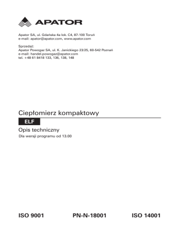 Apator SA, ul. Gdańska 4a lok. C4, 87-100 Toruń e-mail: [email protected], www.apator.com Sprzedaż: Apator Powogaz SA, ul. K. Janickiego 23/25, 60-542 Poznań e-mail: [email protected] tel. +48 61 8418 133, 136, 138, 148 Ciepłomierz kompaktowy ELF Opis techniczny Dla wersji programu od 13.00 ISO 9001 PN-N-18001 ISO 14001 -2- Spis treści 1. Przedmiot opisu........................................................................................................................................4 2. Zgodność z normami i przepisami..........................................................................................................4 3. Budowa, opis działania i podstawowe właściwości...............................................................................4 4. Podstawowe dane techniczne.................................................................................................................6 5. Rodzaje danych........................................................................................................................................8 5.1. Dane aktualne........................................................................................................................................8 5.1.1. Zużycie ciepła.....................................................................................................................................9 5.1.2. Objętość wody...................................................................................................................................9 5.1.3. Temperatury zasilania i powrotu, różnica temperatur......................................................................9 5.1.4. Moc i przepływ...................................................................................................................................9 5.1.5. Wejścia impulsowe.............................................................................................................................9 5.1.6. Kody błędów.....................................................................................................................................10 5.1.7. Czas rzeczywisty i czas pracy...........................................................................................................11 5.2. Dane kalibracyjne, konfiguracyjne i serwisowe.................................................................................11 5.2.1. Dane kalibracyjne i konfiguracyjne dla metrologii..........................................................................11 5.2.2. Dane konfiguracyjne dla użytkownika.............................................................................................11 5.3. Dane archiwizowane...........................................................................................................................12 5.3.1. Rekord cyklu 1 (godzinowy) oraz cyklu 2 (dobowy).......................................................................12 5.3.2. Rekord cykli miesięcznych i rocznych.............................................................................................13 5.3.3. Rekord archiwum stanów awaryjnych............................................................................................14 6. Obsługa ciepłomierza, wyświetlacz LCD...............................................................................................14 6.1.Test metrologiczny...............................................................................................................................16 7. Zdalny odczyt danych............................................................................................................................16 7.1. Interfejsy przewodowe M-Bus oraz interfejsy wejść/wyjść impulsowych........................................17 7.1.1. Schemat podłączenia interfejsów....................................................................................................18 7.1.2. Parametry techniczne interfejsów....................................................................................................19 7.1.3. Opis działania interfejsu komunikacyjnego M-Bus.........................................................................20 7.1.4. Konfiguracja wyjścia impulsowego.................................................................................................21 7.2. Interfejs radiowy..................................................................................................................................21 7.3. Interfejs USB........................................................................................................................................22 8. Transport i instalacja..............................................................................................................................23 8.1. Plombowanie.......................................................................................................................................24 8.2. Zakłócenia elektryczne........................................................................................................................24 9. Gwarancja i serwis.................................................................................................................................24 9.1. Zalecenia po okresie eksploatacji.......................................................................................................25 10. Sposób oznaczania i zamawiania........................................................................................................26 10.1. Zamawianie kompletu ciepłomierza.................................................................................................26 10.2. Zamawianie samych modułów komunikacyjnych...........................................................................27 11. Załączniki.........................................................................................................................................