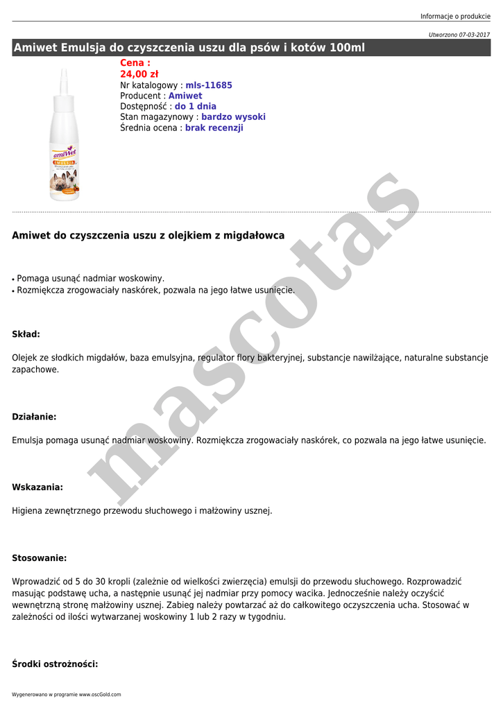 Informacje o produkcie Utworzono 07-03-2017 Amiwet Emulsja do czyszczenia uszu dla psów i kotów 100ml Cena : 24,00 zł ● ● co ta Amiwet do czyszczenia uszu z olejkiem z migdałowca s Nr katalogowy : mls-11685 Producent : Amiwet Dostępność : do 1 dnia Stan magazynowy : bardzo wysoki Średnia ocena : brak recenzji Pomaga usunąć nadmiar woskowiny. Rozmiękcza zrogowaciały naskórek, pozwala na jego łatwe usunięcie. Skład: m as Olejek ze słodkich migdałów, baza emulsyjna, regulator flory bakteryjnej, substancje nawilżające, naturalne substancje zapachowe. Działanie: Emulsja pomaga usunąć nadmiar woskowiny. Rozmiękcza zrogowaciały naskórek, co pozwala na jego łatwe usunięcie. Wskazania: Higiena zewnętrznego przewodu słuchowego i małżowiny usznej. Stosowanie: Wprowadzić od 5 do 30 kropli (zależnie od wielkości zwierzęcia) emulsji do przewodu słuchowego. Rozprowadzić masując podstawę ucha, a następnie usunąć jej nadmiar przy pomocy wacika. Jednocześnie należy oczyścić wewnętrzną stronę małżowiny usznej. Zabieg należy powtarzać aż do całkowitego oczyszczenia ucha. Stosować w zależności od ilości wytwarzanej woskowiny 1 lub 2 razy w tygodniu. Środki ostrożności: Wygenerowano w programie www.oscGold.com m as co ta s Unikać kontaktu z oczami.