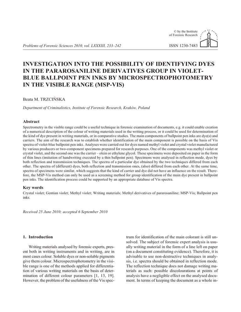 © by the Institute of Forensic Research ISSN 1230-7483 Problems of Forensic Sciences 2010, vol. LXXXIII, 233–242 INVESTIGATION INTO THE POSSIBILITY OF IDENTIFYING DYES IN THE PARAROSANILINE DERIVATIVES GROUP IN VIOLETBLUE BALLPOINT PEN INKS BY MICROSPECTROPHOTOMETRY IN THE VISIBLE RANGE (MSP-VIS) Beata M. TRZCIÑSKA Department of Criminalistics, Institute of Forensic Research, Kraków, Poland Abstract Spectrometry in the visible range could be a useful technique in forensic examination of documents, e.g. it could enable creation of a numerical description of the colour of writing materials used in the writing process, or it could be used for determination of the kind of dye present in writing materials, or in comparative studies. The main components of ballpoint pen inks are dye(s) and carriers. The aim of the research was to establish whether identification of the main component is possible on the basis of Vis spectra of violet-blue ballpoint pen inks. Analyses were carried out for dyes named methyl violet and crystal violet manufactured by various producers or two-component specimens prepared for research purposes. One of the components was methyl violet or crystal violet, and the second one was the carrier – olein or ethylene glycol. These specimens were deposited on paper in the form of thin lines (imitation of handwriting executed by a thin ballpoint pen). Specimens were analysed in reflection mode, dyes by both reflection and transmission techniques. The spectra of a particular dye obtained by the two techniques differed from each other. The spectra of (different) dyes, both reflection and transmission ones, (also) differed from each other. At the same time, spectra of specimens were similar, which suggests that the kind of carrier and dye did not have an influence on the result. Therefore, the MSP-Vis method can only be used as a screening method for group identification of the main dye present in ballpoint pen inks. The identification process could be supported by an appropriate database of Vis spectra. Key words Crystal violet; Gentian violet; Methyl violet; Writing materials; Methyl derivatives of pararosaniline; MSP-Vis; Ballpoint pen inks. Received 25 June 2010; accepted 6 September 2010 1. Introduction Writing materials analysed by forensic experts, present both in writing instruments and in writing, are in most cases colour. Soluble dyes or non-soluble pigments give them colour. Microspectrophotometry in the visible range is one of the methods applied for differentiation of various writing materials on the basis of determination of different colour parameters [1, 13, 19]. However, the problem of the usefulness of the Vis spec- trum for identification of the main colorant is still unsolved. The subject of forensic expert analysis is usually writing material in the form of a line left on paper (on a document constituting evidence). Therefore, it is advisable to use non-destructive techniques in analysis, i.e. spectra should be obtained in reflection mode. The reflection technique does not damage writing materials as such: possible discolourations at points of analysis have a negligible effect on the analysed document. In terms of keeping the document as a whole in- 234 B. M. Trzciñska tact, in many cases an A4 format sheet of paper can be directly placed on a microscope stage, enabling analysis of a selected line of writing. If this is not possible, then, after obtaining permission from the customer, it is necessary to cut out a 3 mm fragment of a line of writing in order to perform analysis. Such (very limited) document damage does not affect other analyses and so this method could also be called a “non-destructive method”. The number of substances used as dye components in writing materials is not large. In production of the most common violet and violet-blue writing materials, the following are amongst the blue colouring compounds used: Victoria Blue B, aniline blue, methyl blue, and methylene blue or methyl violet and crystal violet [6]. The last two are pararosaniline derivatives (Figure 1) which contain four, five or six methyl groups in a particle. Other names used to describe the mentioned derivatives are methyl violet (methyl violet) 2B, 6B and 10B. Pararosaniline and its derivatives with four or five methyl groups can be present both in the form of ions (as chlorides) and in a covalent form (Figure 2). Use of common names or synonyms [17] could cause terminological misunderstandings. Unambiguous definition of a chemical compound is possible by application of rules proposed by the International Union of Pure and Applied Chemistry (IUPAC), which can, however, be complicated. It can also be done by combining the common name with a numerical identifier ascribed to the given chemical compound. Systems of numerical identifiers such as the following are universally applied: CI (Colour Index) – American database of reference dyes compounds and products, CAS (Chemical Abstracts Service) – a database of the American Chemical Society and the CID system (Compound Identification). Some common names and numerical identifiers of methyl derivatives of pararosaniline are presented in Table I. The common name “Gentian violet” should be applied only by pharmacists to pyoktanin obtained from plants and it should not be used as an alternative name for dyes available on the market. Pyoktanin is a mixture of chlorides of penta- and hexamethylpararosaniline [10] (see Table I). + NH2 Cl H 2N H2N NH C C NH2 NH2 + C19H18N3Cl C19H17N3 Pararosaniline chloride: tetramethyl pentamethyl + NH2 [CH3]2N C N[CH3]2 + C23H26N3Cl + NHCH3 [CH3]2N C Cl - Cl - N[CH3]2 _ + C24H28N3Cl _ hexamethyl + [CH3]2N N[CH3]2 C Cl - N[CH3]2 _ + C25H30N3Cl Pararosaniline: tetramethyl pentamethyl NH [CH3]2N C N[CH3]2 C23H25N3 C23H25N3 NCH3 [CH3]2N C N[CH3]2 C24H27N3 C24H27N3 Fig. 2. Ion and covalent forms of methyl derivatives of pararosaniline. The most popular common names of dyes, some synonyms, as we