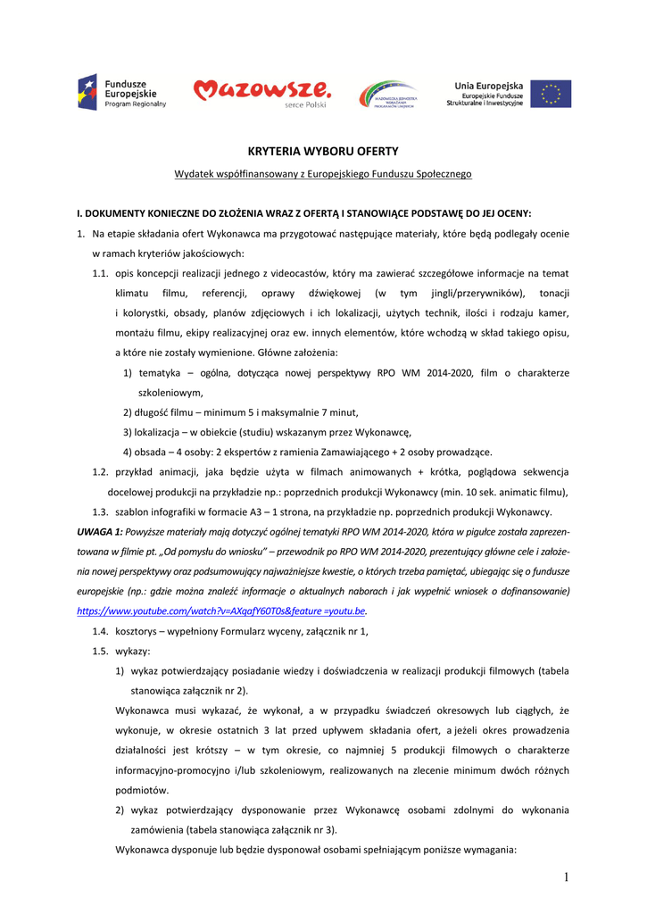 KRYTERIA WYBORU OFERTY Wydatek współfinansowany z Europejskiego Funduszu Społecznego I. DOKUMENTY KONIECZNE DO ZŁOŻENIA WRAZ Z OFERTĄ I STANOWIĄCE PODSTAWĘ DO JEJ OCENY: 1. Na etapie składania ofert Wykonawca ma przygotować następujące materiały, które będą podlegały ocenie w ramach kryteriów jakościowych: 1.1. opis koncepcji realizacji jednego z videocastów, który ma zawierać szczegółowe informacje na temat klimatu filmu, referencji, oprawy dźwiękowej (w tym jingli/przerywników), tonacji i kolorystki, obsady, planów zdjęciowych i ich lokalizacji, użytych technik, ilości i rodzaju kamer, montażu filmu, ekipy realizacyjnej oraz ew. innych elementów, które wchodzą w skład takiego opisu, a które nie zostały wymienione. Główne założenia: 1) tematyka – ogólna, dotycząca nowej perspektywy RPO WM 2014-2020, film o charakterze szkoleniowym, 2) długość filmu – minimum 5 i maksymalnie 7 minut, 3) lokalizacja – w obiekcie (studiu) wskazanym przez Wykonawcę, 4) obsada – 4 osoby: 2 ekspertów z ramienia Zamawiającego + 2 osoby prowadzące. 1.2. przykład animacji, jaka będzie użyta w filmach animowanych + krótka, poglądowa sekwencja docelowej produkcji na przykładzie np.: poprzednich produkcji Wykonawcy (min. 10 sek. animatic filmu), 1.3. szablon infografiki w formacie A3 – 1 strona, na przykładzie np. poprzednich produkcji Wykonawcy. UWAGA 1: Powyższe materiały mają dotyczyć ogólnej tematyki RPO WM 2014-2020, która w pigułce została zaprezentowana w filmie pt. „Od pomysłu do wniosku” – przewodnik po RPO WM 2014-2020, prezentujący główne cele i założenia nowej perspektywy oraz podsumowujący najważniejsze kwestie, o których trzeba pamiętać, ubiegając się o fundusze europejskie (np.: gdzie można znaleźć informacje o aktualnych naborach i jak wypełnić wniosek o dofinansowanie) https://www.youtube.com/watch?v=AXqafY60T0s&feature =youtu.be. 1.4. kosztorys – wypełniony Formularz wyceny, załącznik nr 1, 1.5. wykazy: 1) wykaz potwierdzający posiadanie wiedzy i doświadczenia w realizacji produkcji filmowych (tabela stanowiąca załącznik nr 2). Wykonawca musi wykazać, że wykonał, a w przypadku świadczeń okresowych lub ciągłych, że wykonuje, w okresie ostatnich 3 lat przed upływem składania ofert, a jeżeli okres prowadzenia działalności jest krótszy – w tym okresie, co najmniej 5 produkcji filmowych o charakterze informacyjno-promocyjno i/lub szkoleniowym, realizowanych na zlecenie minimum dwóch różnych podmiotów. 2) wykaz potwierdzający dysponowanie przez Wykonawcę osobami zdolnymi do wykonania zamówienia (tabela stanowiąca załącznik nr 3). Wykonawca dysponuje lub będzie dysponował osobami spełniającym poniższe wymagania: 1 a) ekipa realizacyjna filmów: a. reżyser (1 osoba) odpowiedzialny za całokształt realizacji filmów, czuwający nad przebiegiem prac związanych z nagrywaniem filmów, koordynujący działania ekipy, który w ciągu ostatnich 3 lat był odpowiedzialny za całokształt co najmniej 3 produkcji filmowych i ma ukończone studia na wydziale reżyserskim, b. kierownik produkcji (1 osoba) odpowiedzialny za realizację całego procesu produkcji filmów, tj. organizowanie formalnych warunków dla realizacji produkcji pod kątem ich zgodności z harmonogramem i scenariuszem oraz za koordynację projektu i nadzór nad pracami wszystkich osób zatrudnionych na planie; osoba która w ciągu ostatnich 3 lat była odpowiedzialna za produkcję co najmniej 3 produkcji filmowych i ma ukończone studia wyższe, c. operator drona (1 osoba) posiadający aktualny certyfikat UAVO (operatora bezzałogowego statku powietrznego) wydawany przez Urząd Lotnictwa Cywilnego oraz ew. inne wymagane prawem certyfikaty i pozwolenia adekwatne do rodzaju zamówienia (wykonywanie lotów dronem w obszarze województwa mazowieckiego, w tym miasta stołecznego Warszawy), b) grafik opracowujący infografiki (co najmniej 1 osoba), który w ciągu ostatnich 3 lat przez co najmniej 24 miesiące realizował zadania na stanowisku grafika komputerowego, oraz który wykonywał usługi polegające na opracowaniu graficznym i składzie komputerowym materiałów informacyjnych w postaci co najmniej 3 infografik o charakterze informacyjno-promocyjnym. UWAGA 2: Niespełnienie powyższych wymagań odnośnie doświadczenia i potencjału osobowego określonego przez Zamawiającego skutkuje odrzuceniem oferty. II. SZCZEGÓŁOWY OPIS KRYTERIÓW, KTÓRYMI ZAMAWIAJĄCY BĘDZIE KIEROWAŁ SIĘ PRZY WYBORZE OFERTY WRAZ Z PODANIEM ZNACZENIA TYCH KRYTERIÓW ORAZ OKREŚLENIEM SPOSOBU OCENY OFERT 1. Wykaz kryteriów: W celu wyboru najkorzystniejszej oferty Zamawiający przyjął następujące kryteria, przypisując im odpowiednio wagi procentowe i punktowe: Lp. Kryterium Waga kryterium Maksymalna liczba punktów, jakie może otrzymać oferta za dane kryterium 1. Cena (brutto) 60% 60 2. Jakość 40% 40 2. Opis punktacji w ramach poszczególnych kryteriów: 2.1 Cena – maksymalnie 60 pkt. Punkty w ramach kryterium zostaną obliczone wg następującego wzoru: Liczba punktów oferty ocienianej = Cena oferty najtańszej ----------------------------------- x 60 Cena oferty badanej 2 W przypadku obliczeń prowadzonych w oparciu o powyższy wzór iloraz będzie zaokrąglany do 2 miejsc po przecinku. 2.2. Jakość – maksymalnie 40 pkt. Punkty w ramach kryterium będą przyznawane na podstawie oceny poszczególnych elementów: 2.2.1. Koncepcja realizacji videocastu – maksymalnie 18 pkt. Ocena koncepcji realizacji jednego z videocastów będzie przeprowadzana na podstawie oceny ogólnych założeń dot. produkcji filmu wg modelu SUCCES. Liczba punktów, którą można uzyskać w ramach tego kryterium zostanie obliczona poprzez wyliczenie średniej z zsumowanych ocen przyznanych przez każdego z członków komisji oceniającej nadesłane oferty, zgodnie z poniższą punktacją: Nazwa kryterium Opis kryterium Punktacja 1 Pros