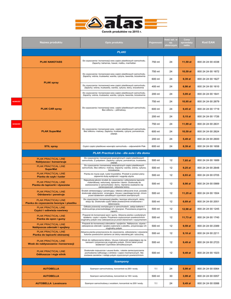 Cennik produktów na 2015 r. Nazwa produktu Pojemność Ilość szt. w op. zbiorczym Cena sprzedaży netto Kod EAN 750 ml 24 11,59 zł 800 24 24 00 4338 750 ml 24 10,59 zł 800 24 24 00 1672 600 ml 24 9,39 zł 800 24 24 00 1627 Do czyszczenia i konserwacji wew.części plastikowych samochodu. Zapachy: wiśnia, truskawka, wanilia, cytryna, leśny, brzoskwinia 400 ml 24 6,98 zł 800 24 24 00 1610 Do czyszczenia i konserwacji wew.części plastikowych samochodu. Zapachy: wiśnia, truskawka, wanilia, cytryna, lawenda, brzoskwinia 200 ml 24 5,09 zł 800 24 24 00 1641 750 ml 24 10,95 zł 800 24 24 00 2679 600 ml 24 9,45 zł 800 24 24 00 1719 200 ml 24 5,15 zł 800 24 24 00 1726 750 ml 24 11,99 zł 800 24 24 00 2631 600 ml 24 10,59 zł 800 24 24 00 2624 200 ml 24 5,49 zł 800 24 24 00 2600 600 ml 24 8,39 zł 800 24 24 00 1658 500 ml 12 7,85 zł 800 24 24 00 1689 500 ml 12 9,25 zł 800 24 24 00 2648 Opis produktu PLAKI PLAK NANOTASS Do czyszczenia i konserwacji wew.części plastikowych samochodu. Zapachy: bahamas, hawaii, malibu, manhattan Do czyszczenia i konserwacji wew.części plastikowych samochodu. Zapachy: wiśnia, truskawka, wanilia, cytryna, lawenda, brzoskwinia PLAK spray NOWOŚĆ PLAK CAR spray Do czyszczenia i konserwacji wew. części plastikowych samochodu. Bez silikonu – półmatowy. NOWOŚĆ PLAK SuperMat STIL spray Do czyszczenia i konserwacji wew. części plastikowych samochodu. Bez silikonu- matowy. Zapachy: truskawka, cytryna, pomarańcza, papaja. Czyści części plastikowe wewnątrz samochodu – odpowiednik Plak PLAK Practical Line - dla auta i dla domu PLAK PRACTICAL LINE SuperMat Do czyszczenia i konserwacji wewnętrznych części plastikowych samochodu. Z połyskiem. Zapachy: cytryna, pomarańcza, truskawka, papaja. Do czyszczenia i konserwacji wewnętrznych części plastikowych samochodu. Bez silikonu- matowy. Zapachy: wanilia, wiśnia, cytryna, brzoskwinia. PLAK PRACTICAL LINE Pianka do szyb i luster Pianka do mycia szyb, luster kryształów. Produkt w postaci piany zapewnia dużą wydajność i wygodę użycia. 500 ml 12 6,93 zł 800 24 24 00 0705 PLAK PRACTICAL LINE Pianka do tapicerki i dywanów Najwyższej jakości środek do czyszczenia i odświeżania tapicerki materiałowej, welurowej, dywanów i tkanin. Doskonały do zastosowania w samochodzie i domu. Opróżnia osadzanie się zanieczyszczeń, odświeża kolory. 500 ml 12 8,98 zł 800 24 24 00 0989 PLAK PRACTICAL LINE Odrdzewia i penetruje Środek odrdzewiający i penetrujący. Ułatwia odkręcanie śrub, posiada doskonałe właściwości smarujące. Usuwa i zapobiega korozji, chroni przed działaniem szkodliwych czynników zewnętrznych. 500 ml 12 11,25 zł 800 24 24 00 1504 500 ml 12 6,69 zł 800 24 24 00 2051 500 ml 12 12,98 zł 800 24 24 00 1245 PLAK PRACTICAL LINE Nabłyszcza i konserwuje PLAK PRACTICAL LINE Czyści i odświeża nawiewy Do czyszczenia i konserwacji plastiku, tworzyw sztucznych, skóry, skayu itp. Doskonale czyści także powierzchnie emaliowane i lakierowane. Odkaża przewody wentylacyjne w samochodach, zabija bakterie i drobnoustroje przeciwdziałając ich rozwojowi. Pozostawia przyjemny zapach. PLAK PRACTICAL LINE Pianka do opon i gumy Preparat do konserwacji opon i gumy. Aktywna pianka o podwójnym działaniu: czyści i ożywia. Przywraca czyszczonym powierzchniom oryginalny połysk oraz zabezpiecza je przed starzeniem i wysychaniem. 500 ml 12 11,73 zł 800 24 24 00 1740 PLAK PRACTICAL LINE Nabłyszcza zderzaki i spojlery Preparat do konserwacji zderzaków i spojlerów. Nabłyszcza, ożywia i zabezpiecza zderzaki i spojlery wykonane z plastiku, przywracając ich oryginalny połysk. 500 ml 12 9,59 zł 800 24 24 00 2389 PLAK PRACTICAL LINE Pianka do tapicerki skórzanej Aktywna pianka przeznaczona do czyszczenia, odświeżania i ożywiania kolorów powierzchni zarówno ze skóry naturalnej jak i sztucznej. 500 ml 12 9,18 zł 800 24 24 00 2211 PLAK PRACTICAL LINE Wosk do nabłyszczania i konserwacji Wosk do nabłyszczania lakieru. Usuwa matowość pojawiająca się na karoserii i przywraca jej oryginalny połysk. Chroni lakier przed działaniem czynników atmosferycznych. 500 ml 12 9,49 zł 800 24 24 00 2723 PLAK PRACTICAL LINE Odtłuszcza i myje silnik Doskonale rozpuszcza i usuwa tłuste, i oleiste zanieczyszczenia pochodzenia naftowego z silników i części mechanicznych. Nie zostawia zacieków i nadaje połysk czyszczonym powierzchniom. 500 ml 12 9,49 zł 800 24 24 00 1023 PLAK PRACTICALl LINE Pianka do czyszczenia tworzyw i plastiku Szampony AUTOBELLA Szampon samochodowy, koncentrat na 200 l wody. 1l 24 5,99 zł 800 24 24 00 0064 AUTOBELLA Szampon samochodowy, koncentrat na 100 l wody. 500 ml 30 3,99 zł 800 24 24 00 0057 AUTOBELLA Lavaincera Szampon samochodowy z woskiem, koncentrat na 200 l wody. 1l 24 9,49 zł 800 24 24 00 0088 Nazwa produktu Opis produktu Pojemność Ilość szt. w op. zbiorczym Cena sprzedaży netto Kod EAN AUTOBELLA Lavaincera Szampon samochodowy z woskiem, koncentrat na 100 l wody. 500 ml 30 6,29 zł 800 24 24 00 0101 BRILLANT Szampon samochodowy, koncentrat. 1l 12 3,19 zł 800 24 24 00 0095 Atomizery VINET Do czyszczenia i konserwacji plastiku, skóry, skayu itp. 750 ml 24 9,59 zł 800 24 24 00 2013 HYDROREP Wosk do nabłyszczania karoserii. 750 ml 24 10,98 zł 800 24 24 00 2747 NETINS Do usuwania owadów z szyb, reflektorów i karoserii samochodowych. 750 ml 24 7,49 zł 800 24 24 00 2112 FORLEGA Czyści obręcze ze stopów lekkich nielakierowanych oraz części wykon. z aluminium. 750 ml 24 8,45 zł 800 24 24 00 1177 LACER Preparat do mycia felg samochodowych. Czyści także felgi aluminiowe lakierowane. 750 ml 24 8,25 zł 800 24 24 00 2891 PNEUBELL Do czyszczenia i konserwacji opon, uszczelek gumowych. 750 ml 24 8,52 zł 800 24 24 00 1764 CANDIVETRO Do mycia szyb, luster. 750 ml 24 6,35 zł 800 24 24 00 0743 DETAP Do czyszczenia tapicerki sam. dywanów, pluszu itp. 750 ml 24 7,59 zł 800 24 24 00 0972 FORCLEAN Odtłuszczacz do części mechanicznych. 