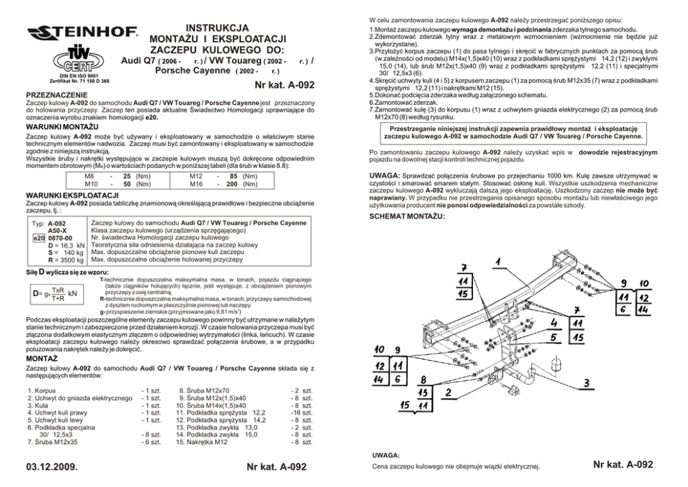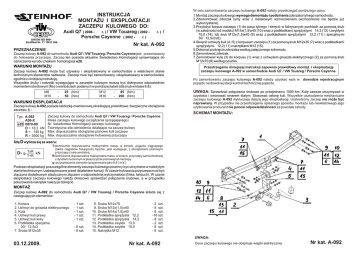 INSTRUKCJA MONTA¯U I EKSPLOATACJI ZACZEPU KULOWEGO DO: Audi Q7 ( 2006 - ® r. ) / VW Touareg ( 2002 Porsche Cayenne ( 2002 - ® r. ) DIN EN ISO 9001 Zertifikat Nr. 71 100 D 366 ® r. ) / Nr kat. A-092 PRZEZNACZENIE Zaczep kulowy A-092 do samochodu Audi Q7 / VW Touareg / Porsche Cayenne jest przeznaczony do holowania przyczepy. Zaczep ten posiada aktualne Œwiadectwo Homologacji uprawniaj¹ce do oznaczenia wyrobu znakiem homologacji e20. WARUNKI MONTA¯U Zaczep kulowy A-092 mo¿e byæ u¿ywany i eksploatowany w samochodzie o w³aœciwym stanie technicznym elementów nadwozia. Zaczep musi byæ zamontowany i eksploatowany w samochodzie zgodnie z niniejsz¹ instrukcj¹. Wszystkie œruby i nakrêtki wystêpuj¹ce w zaczepie kulowym musz¹ byæ dokrêcone odpowiednim momentem obrotowym (Mo) o wartoœciach podanych w poni¿szej tabeli (dla œrub w klasie 8.8): M8 M10 - 25 (Nm) 50 (Nm) M12 M16 - Przestrzeganie niniejszej instrukcji zapewnia prawid³owy monta¿ i eksploatacjê zaczepu kulowego A-092 w samochodzie Audi Q7 / VW Touareg / Porsche Cayenne. Po zamontowaniu zaczepu kulowego A-092 nale¿y uzyskaæ wpis w dowodzie rejestracyjnym pojazdu na dowolnej stacji kontroli technicznej pojazdu. UWAGA: Sprawdzaæ po³¹czenia œrubowe po przejechaniu 1000 km. Kulê zawsze utrzymywaæ w 85 (Nm) 200 (Nm) WARUNKI EKSPLOATACJI Zaczep kulowy A-092 posiada tabliczkê znamionow¹ okreœlaj¹c¹ prawid³owe i bezpieczne obci¹¿enie zaczepu, tj. : Typ: A-092 A50-X e20 0870-00 D = 16,3 kN S = 140 kg R = 3500 kg W celu zamontowania zaczepu kulowego A-092 nale¿y przestrzegaæ poni¿szego opisu: 1.Monta¿ zaczepu kulowego wymaga demonta¿u i podcinania zderzaka tylnego samochodu. 2.Zdemontowaæ zderzak tylny wraz z metalowym wzmocnieniem (wzmocnienie nie bêdzie ju¿ wykorzystane). 3.Przy³o¿yæ korpus zaczepu (1) do pasa tylnego i skrêciæ w fabrycznych punktach za pomoc¹ œrub (w zale¿noœci od modelu) M14x(1,5)x40 (10) wraz z podk³adkami sprê¿ystymi Ø14,2 (12) i zwyk³ymi Ø15,0 (14), lub œrub M12x(1,5)x40 (9) wraz z podk³adkami sprê¿ystymi Ø12,2 (11) i specjalnymi Ø30/Ø12,5x3 (6). 4.Skrêciæ uchwyty kuli (4 i 5) z korpusem zaczepu (1) za pomoc¹ œrub M12x35 (7) wraz z podk³adkami sprê¿ystymi Ø12,2 (11) i nakrêtkami M12 (15). 5.Dokonaæ podciêcia zderzaka wed³ug za³¹czonego schematu. 6.Zamontowaæ zderzak. 7.Zamontowaæ kulê (3) do korpusu (1) wraz z uchwytem gniazda elektrycznego (2) za pomoc¹ œrub M12x70 (8) wed³ug rysunku. Zaczep kulowy do samochodu Audi Q7 / VW Touareg / Porsche Cayenne Klasa zaczepu kulowego (urz¹dzenia sprzêgaj¹cego) Nr. œwiadectwa Homologacji zaczepu kulowego Teoretyczna si³a odniesienia dzia³aj¹ca na zaczep kulowy Max. dopuszczalne obci¹¿enie pionowe kuli zaczepu Max. dopuszczalne obci¹¿enie holowanej przyczepy czystoœci i smarowaæ smarem sta³ym. Stosowaæ os³onê kuli. Wszystkie uszkodzenia mechaniczne zaczepu kulowego A-092 wykluczaj¹ dalsz¹ jego eksploatacjê. Uszkodzony zaczep nie mo¿e byæ naprawiany. W przypadku nie przestrzegania opisanego sposobu monta¿u lub niew³aœciwego jego u¿ytkowania producent nie ponosi odpowiedzialnoœci za powsta³e szkody. SCHEMAT MONTA¯U: Si³ê D wylicza siê ze wzoru: D= gx TxR kN T+R T-technicznie dopuszczalna maksymalna masa, w tonach, pojazdu ci¹gn¹cego (tak¿e ci¹gników holuj¹cych) ³¹cznie, jeœli wystêpuje, z obci¹¿eniem pionowym przyczepy z osiê centraln¹. R-technicznie dopuszczalna maksymalna masa, w tonach, przyczepy samochodowej z dyszlem ruchomym w p³aszczyŸnie pionowej lub naczepy. g- przyspieszenie ziemskie (przyjmowane jako 9,81 m/s2) Podczas eksploatacji poszczególne elementy zaczepu kulowego powinny byæ utrzymane w nale¿ytym stanie technicznym i zabezpieczone przed dzia³aniem korozji. W czasie holowania przyczepa musi byæ z³¹czona dodatkowym elastycznym z³¹czem o odpowiedniej wytrzyma³oœci (linka, ³añcuch). W czasie eksploatacji zaczepu kulowego nale¿y okresowo sprawdzaæ po³¹czenia œrubowe, a w przypadku poluzowania nakrêtek nale¿y je dokrêciæ. MONTA¯ Zaczep kulowy A-092 do samochodu Audi Q7 / VW Touareg / Porsche Cayenne sk³ada siê z nastêpuj¹cych elementów: 1. Korpus 2. Uchwyt do gniazda elektrycznego 3. Kula 4. Uchwyt kuli prawy 5. Uchwyt kuli lewy 6. Podk³adka specjalna Ø30/Ø12,5x3 7. Œruba M12x35 - 1 szt. - 1 szt. - 1 szt. - 1 szt. - 1 szt. - 8 szt. - 6 szt. 8. Œruba M12x70 9. Œruba M12x(1,5)x40 10. Œruba M14x(1,5)x40 11. Podk³adka sprê¿ysta Ø12,2 12. Podk³adka sprê¿ysta Ø14,2 13. Podk³adka zwyk³a Ø13,0 14. Podk³adka zwyk³a Ø15,0 15. Nakrêtka M12 - 2 szt. - 8 szt. - 8 szt. -16 szt. - 8 szt. - 2 szt. - 8 szt. - 8 szt. UWAGA: 03.12.2009. Nr kat. A-092 Cena zaczepu kulowego nie obejmuje wi¹zki elektrycznej. Nr kat. A-092