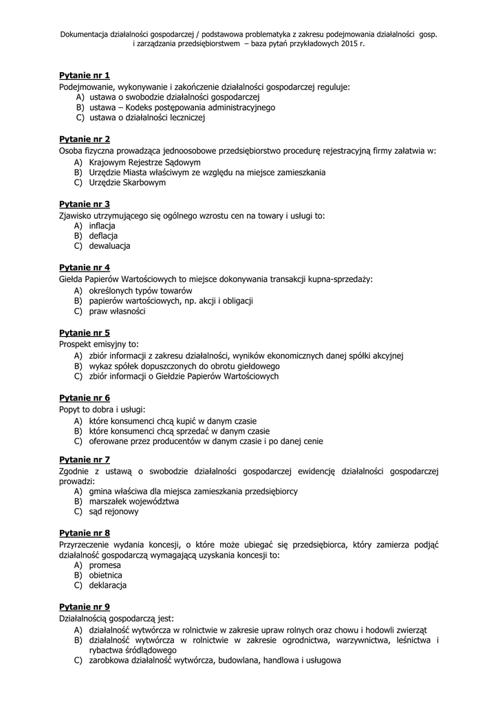 Dokumentacja działalności gospodarczej / podstawowa problematyka z zakresu podejmowania działalności gosp. i zarządzania przedsiębiorstwem – baza pytań przykładowych 2015 r. Pytanie nr 1 Podejmowanie, wykonywanie i zakończenie działalności gospodarczej reguluje: A) ustawa o swobodzie działalności gospodarczej B) ustawa – Kodeks postępowania administracyjnego C) ustawa o działalności leczniczej Pytanie nr 2 Osoba fizyczna prowadząca jednoosobowe przedsiębiorstwo procedurę rejestracyjną firmy załatwia w: A) Krajowym Rejestrze Sądowym B) Urzędzie Miasta właściwym ze względu na miejsce zamieszkania C) Urzędzie Skarbowym Pytanie nr 3 Zjawisko utrzymującego się ogólnego wzrostu cen na towary i usługi to: A) inflacja B) deflacja C) dewaluacja Pytanie nr 4 Giełda Papierów Wartościowych to miejsce dokonywania transakcji kupna-sprzedaży: A) określonych typów towarów B) papierów wartościowych, np. akcji i obligacji C) praw własności Pytanie nr 5 Prospekt emisyjny to: A) zbiór informacji z zakresu działalności, wyników ekonomicznych danej spółki akcyjnej B) wykaz spółek dopuszczonych do obrotu giełdowego C) zbiór informacji o Giełdzie Papierów Wartościowych Pytanie nr 6 Popyt to dobra i usługi: A) które konsumenci chcą kupić w danym czasie B) które konsumenci chcą sprzedać w danym czasie C) oferowane przez producentów w danym czasie i po danej cenie Pytanie nr 7 Zgodnie z ustawą o swobodzie działalności gospodarczej ewidencję działalności gospodarczej prowadzi: A) gmina właściwa dla miejsca zamieszkania przedsiębiorcy B) marszałek województwa C) sąd rejonowy Pytanie nr 8 Przyrzeczenie wydania koncesji, o które może ubiegać się przedsiębiorca, który zamierza podjąć działalność gospodarczą wymagającą uzyskania koncesji to: A) promesa B) obietnica C) deklaracja Pytanie nr 9 Działalnością gospodarczą jest: A) działalność wytwórcza w rolnictwie w zakresie upraw rolnych oraz chowu i hodowli zwierząt B) działalność wytwórcza w rolnictwie w zakresie ogrodnictwa, warzywnictwa, leśnictwa i rybactwa śródlądowego C) zarobkowa działalność wytwórcza, budowlana, handlowa i usługowa Dokumentacja działalności gospodarczej / podstawowa problematyka z zakresu podejmowania działalności gosp. i zarządzania przedsiębiorstwem – baza pytań przykładowych 2015 r. Pytanie nr 10 Co oznacza skrót CEIDG? A) Ewidencję Informacji Publicznej Ministra Gospodarki B) Centralną Ewidencję i Informację o Działalności Gospodarczej C) Krajową Ewidencję Podatników Pytanie nr 11 W myśl ustawy o swobodzie działalności gospodarczej przedsiębiorca może podjąć działalność gospodarczą: A) po uzyskaniu wpisu do rejestru przedsiębiorców w Krajowym Rejestrze Sądowym albo do Ewidencji Działalności Gospodarczej B) po złożeniu wniosku o otwarcie działalności gospodarczej w Urzędzie Skarbowym C) po otrzymaniu zgody od Marszałka Województwa Pytanie nr 12 We wniosku o wpis do CEIDG albo do KRS niezbędne jest: A) określenie kodów PKD B) umieszczenie nadanego przez Urząd Statystyczny numeru REGON C) zawarcie zgłoszenia jako podatnik podatku akcyzowego Pytanie nr 13 Zmiana kodów PKD w CEIDG w przypadku rozszerzenia, zawężenia bądź zgłoszenia zmiany profilu działalności przez przedsiębiorcę odbywa się: A) poprzez złożenie nowego wniosku w celu zarejestrowania działalności gospodarczej w CEIDG B) przez aktualizację danych we wniosku C) nie ma możliwości zmiany kodu wiodącej działalności bądź zmiany kodów pozostałej działalności Pytanie nr 14 Obowiązek posługiwania się kodami PKD dotyczy: A) wyłącznie osób prowadzących jednoosobową działalność gospodarczą (wpis do CEIDG) B) wyłącznie podmiotów objętych obowiązkiem wpisu do Krajowego Rejestru Sądowego (KRS), czyli np. spółek, spółdzielni, fundacji C) zarówno osób prowadzących jednoosobową działalność gospodarczą (wpis do CEIDG) jak i podmiotów objętych obowiązkiem wpisu do Krajowego Rejestru Sądowego (KRS) Pytanie nr 15 Kiedy należy ustalić kod prowadzonej działalności gospodarczej? A) na etapie składania wniosku – należy podać kody PKD podczas jego wypełniania B) po otrzymaniu numeru Regon z Urzędu Statystycznego C) po zakończeniu rejestracji w CEIDG Pytanie nr 16 PKD jest wprowadzona do polskiego prawa: A) rozporządzeniem Rady Ministrów z Działalności B) rozporządzeniem Rady Ministrów z Działalności C) rozporządzeniem Rady Ministrów z Działalności Pytanie nr 17 Opłata za dokonanie wpisu do CEIDG wynosi: A) 200 zł B) 50 zł od każdego wskazanego rodzaju C) wpis do CEIDG jest wolny od opłat 24 grudnia 2007 r. w sprawie Polskiej Klasyfikacji 24 grudnia 2004 r. w sprawie Polskiej Klasyfikacji 24 grudnia 2001 r. w sprawie Polskiej Klasyfikacji działalności gospodarczej Dokumentacja działalności gospodarczej / podstawowa problematyka z zakresu podejmowania działalności gosp. i zarządzania przedsiębiorstwem – baza pytań przykładowych 2015 r. Pytanie nr 18 Potwierdzenie o nadaniu numeru REGON otrzymujemy: A) w Urzędzie Skarbowym B) w Głównym Urzędzie Statystycznym C) w Zakładzie Ubezpieczeń Społecznych Pytanie nr 19 Przedsiębiorca niezatrudniający pracowników może zawiesić wykonywanie działalności gospodarczej maksymalnie na okres: A) 20 dni B) 24 m-cy C) 36 m-cy Pytanie nr 20 Czy dla każdego pracownika zakłada się akta osobowe? A) tak B) nie C) wystarczą zbiorowe akta osobowe Pytanie nr 21 Wniosek o zmianę wpisu w CEIDG należy zgłosić w ciągu: A) 30 dni od dnia kiedy nastąpiła zmiana B) 14 dni od dnia kiedy nastąpiła zmiana C) 7 dni od dnia kiedy nastąpiła zmiana Pytanie nr 22 Przestrzeganie przepisów ustawy o ochronie danych osobowych dotyczy: A) każdego przedsiębiorcy B) tylko przedsiębiorcy zatrudniającego pracowników C) tylko przedsiębiorców wpisanych do Krajowego Rejestru Sądowego Pytanie nr 23 Za małego przedsięb
