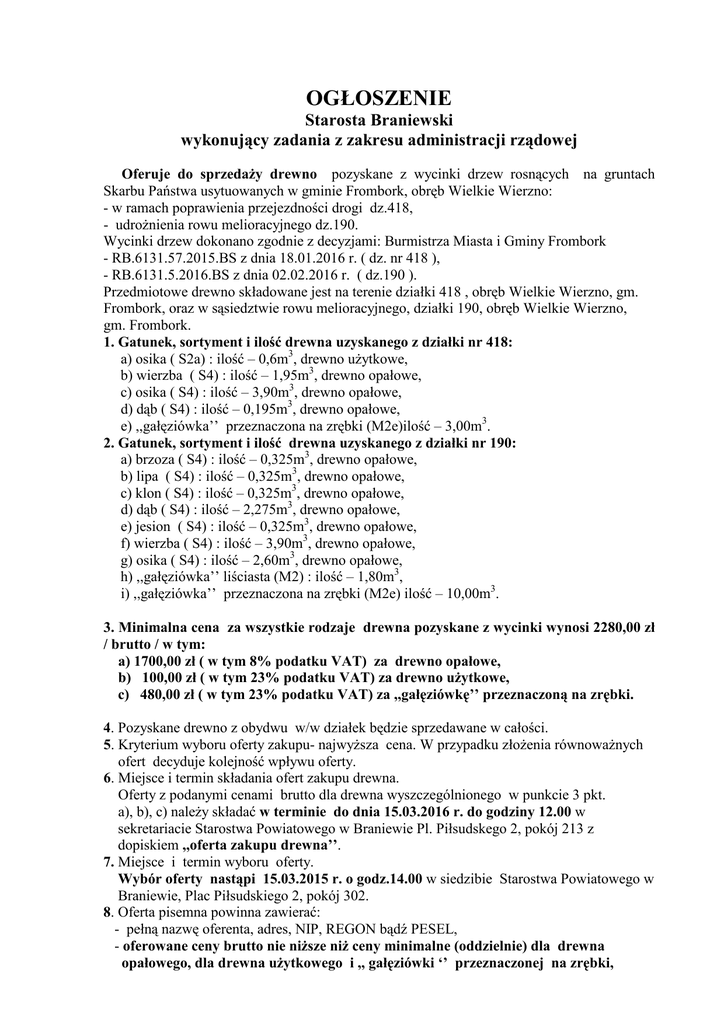 OGŁOSZENIE Starosta Braniewski wykonujący zadania z zakresu administracji rządowej Oferuje do sprzedaży drewno pozyskane z wycinki drzew rosnących na gruntach Skarbu Państwa usytuowanych w gminie Frombork, obręb Wielkie Wierzno: - w ramach poprawienia przejezdności drogi dz.418, - udrożnienia rowu melioracyjnego dz.190. Wycinki drzew dokonano zgodnie z decyzjami: Burmistrza Miasta i Gminy Frombork - RB.6131.57.2015.BS z dnia 18.01.2016 r. ( dz. nr 418 ), - RB.6131.5.2016.BS z dnia 02.02.2016 r. ( dz.190 ). Przedmiotowe drewno składowane jest na terenie działki 418 , obręb Wielkie Wierzno, gm. Frombork, oraz w sąsiedztwie rowu melioracyjnego, działki 190, obręb Wielkie Wierzno, gm. Frombork. 1. Gatunek, sortyment i ilość drewna uzyskanego z działki nr 418: a) osika ( S2a) : ilość – 0,6m3, drewno użytkowe, b) wierzba ( S4) : ilość – 1,95m3, drewno opałowe, c) osika ( S4) : ilość – 3,90m3, drewno opałowe, d) dąb ( S4) : ilość – 0,195m3, drewno opałowe, e) ,,gałęziówka’’ przeznaczona na zrębki (M2e)ilość – 3,00m3. 2. Gatunek, sortyment i ilość drewna uzyskanego z działki nr 190: a) brzoza ( S4) : ilość – 0,325m3, drewno opałowe, b) lipa ( S4) : ilość – 0,325m3, drewno opałowe, c) klon ( S4) : ilość – 0,325m3, drewno opałowe, d) dąb ( S4) : ilość – 2,275m3, drewno opałowe, e) jesion ( S4) : ilość – 0,325m3, drewno opałowe, f) wierzba ( S4) : ilość – 3,90m3, drewno opałowe, g) osika ( S4) : ilość – 2,60m3, drewno opałowe, h) ,,gałęziówka’’ liściasta (M2) : ilość – 1,80m3, i) ,,gałęziówka’’ przeznaczona na zrębki (M2e) ilość – 10,00m3. 3. Minimalna cena za wszystkie rodzaje drewna pozyskane z wycinki wynosi 2280,00 zł / brutto / w tym: a) 1700,00 zł ( w tym 8% podatku VAT) za drewno opałowe, b) 100,00 zł ( w tym 23% podatku VAT) za drewno użytkowe, c) 480,00 zł ( w tym 23% podatku VAT) za ,,gałęziówkę’’ przeznaczoną na zrębki. 4. Pozyskane drewno z obydwu w/w działek będzie sprzedawane w całości. 5. Kryterium wyboru oferty zakupu- najwyższa cena. W przypadku złożenia równoważnych ofert decyduje kolejność wpływu oferty. 6. Miejsce i termin składania ofert zakupu drewna. Oferty z podanymi cenami brutto dla drewna wyszczególnionego w punkcie 3 pkt. a), b), c) należy składać w terminie do dnia 15.03.2016 r. do godziny 12.00 w sekretariacie Starostwa Powiatowego w Braniewie Pl. Piłsudskego 2, pokój 213 z dopiskiem ,,oferta zakupu drewna’’. 7. Miejsce i termin wyboru oferty. Wybór oferty nastąpi 15.03.2015 r. o godz.14.00 w siedzibie Starostwa Powiatowego w Braniewie, Plac Piłsudskiego 2, pokój 302. 8. Oferta pisemna powinna zawierać: - pełną nazwę oferenta, adres, NIP, REGON bądź PESEL, - oferowane ceny brutto nie niższe niż ceny minimalne (oddzielnie) dla drewna opałowego, dla drewna użytkowego i ,, gałęziówki ‘’ przeznaczonej na zrębki, - oświadczenie oferenta, że zapoznał się ze stanem przedmiotu sprzedaży i nie wnosi do niego żadnych zastrzeżeń, - telefon kontaktowy lub adres e-mail. 9. Sprzedaż drewna wybranemu oferentowi nastąpi na podstawie faktury VAT. 10. Termin zapłaty za drewno wynosi 3 dni od daty powiadomienia nabywcy drogą telefoniczną ( e-mail ), na rachunek Starostwa Powiatowego w Braniewie prowadzony w Braniewsko- Pasłęckim Banku Spółdzielczym z siedzibą w Pasłęku, Oddział w Braniewie Nr 37 8313 0009 0030 0009 2000 0330. 11. Nabywca na własny koszt odbierze drewno. 12. Dodatkowe informacje można uzyskać w Wydziale Geodezji, Kartografii i Nieruchomości Starostwa Powiatowego w Braniewie pokój 301, lub pod numerem telefonu tel.55 6440251. Braniewo dnia 10.03.2016r. Starosta Braniewski Leszek Dziąg