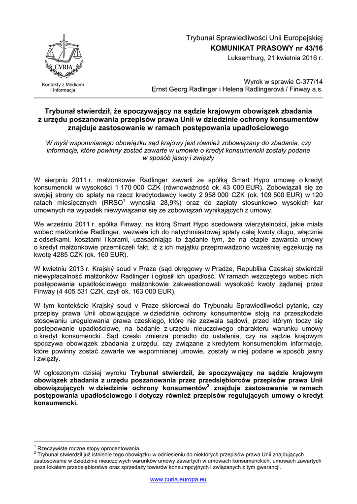 Trybunał Sprawiedliwości Unii Europejskiej KOMUNIKAT PRASOWY nr 43/16 Luksemburg, 21 kwietnia 2016 r. Kontakty z Mediami i Informacja Wyrok w sprawie C-377/14 Ernst Georg Radlinger i Helena Radlingerová / Finway a.s. Trybunał stwierdził, że spoczywający na sądzie krajowym obowiązek zbadania z urzędu poszanowania przepisów prawa Unii w dziedzinie ochrony konsumentów znajduje zastosowanie w ramach postępowania upadłościowego W myśl wspomnianego obowiązku sąd krajowy jest również zobowiązany do zbadania, czy informacje, które powinny zostać zawarte w umowie o kredyt konsumencki zostały podane w sposób jasny i zwięzły W sierpniu 2011 r. małżonkowie Radlinger zawarli ze spółką Smart Hypo umowę o kredyt konsumencki w wysokości 1 170 000 CZK (równoważność ok. 43 000 EUR). Zobowiązali się ze swojej strony do spłaty na rzecz kredytodawcy kwoty 2 958 000 CZK (ok. 109 500 EUR) w 120 ratach miesięcznych (RRSO1 wynosiła 28,9%) oraz do zapłaty stosunkowo wysokich kar umownych na wypadek niewywiązania się ze zobowiązań wynikających z umowy. We wrześniu 2011 r. spółka Finway, na którą Smart Hypo scedowała wierzytelności, jakie miała wobec małżonków Radlinger, wezwała ich do natychmiastowej spłaty całej kwoty długu, włącznie z odsetkami, kosztami i karami, uzasadniając to żądanie tym, że na etapie zawarcia umowy o kredyt małżonkowie przemilczeli fakt, iż z ich majątku przeprowadzono wcześniej egzekucję na kwotę 4285 CZK (ok. 160 EUR). W kwietniu 2013 r. Krajský soud v Praze (sąd okręgowy w Pradze, Republika Czeska) stwierdził niewypłacalność małżonków Radlinger i ogłosił ich upadłość. W ramach wszczętego wobec nich postępowania upadłościowego małżonkowie zakwestionowali wysokość kwoty żądanej przez Finway (4 405 531 CZK, czyli ok. 163 000 EUR). W tym kontekście Krajský soud v Praze skierował do Trybunału Sprawiedliwości pytanie, czy przepisy prawa Unii obowiązujące w dziedzinie ochrony konsumentów stoją na przeszkodzie stosowaniu uregulowania prawa czeskiego, które nie zezwala sądowi, przed którym toczy się postępowanie upadłościowe, na badanie z urzędu nieuczciwego charakteru warunku umowy o kredyt konsumencki. Sąd czeski zmierza ponadto do ustalenia, czy na sądzie krajowym spoczywa obowiązek zbadania z urzędu, czy związane z kredytem konsumenckim informacje, które powinny zostać zawarte we wspomnianej umowie, zostały w niej podane w sposób jasny i zwięzły. W ogłoszonym dzisiaj wyroku Trybunał stwierdził, że spoczywający na sądzie krajowym obowiązek zbadania z urzędu poszanowania przez przedsiębiorców przepisów prawa Unii obowiązujących w dziedzinie ochrony konsumentów2 znajduje zastosowanie w ramach postępowania upadłościowego i dotyczy również przepisów regulujących umowy o kredyt konsumencki. 1 Rzeczywiste roczne stopy oprocentowania. Trybunał stwierdził już istnienie tego obowiązku w odniesieniu do niektórych przepisów prawa Unii znajdujących zastosowanie w dziedzinie nieuczciwych warunków umowy zawartych w umowach konsumenckich, umowach zawartych poza lokalem przedsiębiorstwa oraz sprzedaży towarów konsumpcyjnych i związanych z tym gwarancji. 2 www.curia.europa.eu I tak Trybunał stwierdził, że dyrektywa 93/133 stoi on na przeszkodzie stosowaniu uregulowania prawa czeskiego, które w kontekście postępowania upadłościowego nie zezwala sądowi, przed którym toczy się owo postępowanie, na badanie z urzędu ewentualnie nieuczciwego charakteru warunku zawartego w umowie konsumenckiej, nawet jeśli sąd ten dysponuje niezbędnymi ku temu informacjami na temat stanu prawnego i faktycznego. Ta sama dyrektywa stoi również na przeszkodzie stosowaniu analizowanego uregulowania, które zezwala jedynie na kwestionowanie niektórych rodzajów wierzytelności i to jedynie w oparciu o ograniczoną liczbę zarzutów (przedawnienia lub wygaśnięcia). Ponadto Trybunał podkreślił, że zgodnie z dyrektywą w sprawie umów o kredyt konsumencki 4 sąd krajowy, przed którym zawisł spór dotyczący wierzytelności wywodzonych z umowy o kredyt konsumencki musi również zbadać z urzędu, czy informacje związane z owym kredytem (takie jak np. RRSO), które powinny zostać zawarte w umowie o taki kredyt, zostały podane w sposób jasny i zwięzły. Sad ten jest następnie zobowiązany do wyciągnięcia wszystkich wynikających z prawa krajowego konsekwencji naruszenia takiego obowiązku (przy czym sankcji muszą być skuteczne, proporcjonalne i odstraszające). Ponadto Trybunał uściślił, że zgodnie ze wspomnianą dyrektywą „całkowita kwota kredytu” nie może obejmować żadnych kwot należących do „całkowitego kosztu kredytu”, mianowicie kwot, których przeznaczeniem jest wywiązanie się ze zobowiązań podjętych w ramach owej umowy o kredyt, takich jak koszty administracyjne, odsetki, opłata za udzielenie kredytu czy wszelkie inne typy kosztów, które musi ponieść konsument. Niezgodne z prawem włączenie do całkowitej kwoty kredytu kwot należących do całkowitego kosztu kredytu ponoszonego przez konsumenta powoduje zaniżenie RRSO, których wysokość zależy od całkowitej kwoty kredytu i wpływa w konsekwencji na prawidłowość informacji, które powinny zostać wskazane w umowie. W końcu, jeśli chodzi o badanie nieuczciwego charakteru kar nakładanych na konsumenta, Trybunał stwierdził, że sąd krajowy jest zobowiązany zbadać łączny skutek wszystkich postanowień umowy i, w razie stwierdzenia nieuczciwego charakteru większej liczby warunków, odstąpić od stosowania każdego z warunków uznanych za nieuczciwe (a nie tylko niektórych spośród nich). UWAGA: Odesłanie prejudycjalne pozwala sądom państw członkowskich, w ramach rozpatrywanego przez nie sporu, zwrócić się do Trybunału z pytaniem o wykładnię prawa Unii lub o ocenę ważności aktu Unii. Trybunał nie rozpoznaje sporu krajowego. Do s