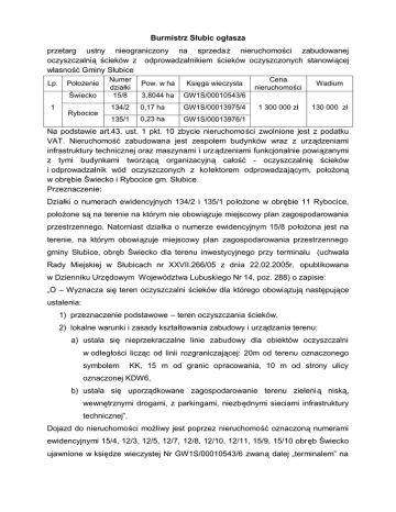 Burmistrz Słubic ogłasza przetarg ustny nieograniczony na sprzedaż nieruchomości zabudowanej oczyszczalnią ścieków z odprowadzalnikiem ścieków oczyszczonych stanowiącej własność Gminy Słubice Lp. Położenie Świecko 1 Rybocice Numer działki 15/8 Pow. w ha Księga wieczysta 3,8044 ha GW1S/00010543/6 134/2 0,17 ha GW1S/00013975/4 135/1 0,23 ha GW1S/00013976/1 Cena nieruchomości Wadium 1 300 000 zł 130 000 zł Na podstawie art.43. ust. 1 pkt. 10 zbycie nieruchomości zwolnione jest z podatku VAT. Nieruchomość zabudowana jest zespołem budynków wraz z urządzeniami infrastruktury technicznej oraz maszynami i urządzeniami funkcjonalnie powiązanymi z tymi budynkami tworzącą organizacyjną całość - oczyszczalnię ścieków i odprowadzalnik wód oczyszczonych z kolektorem odprowadzającym, położoną w obrębie Świecko i Rybocice gm. Słubice. Przeznaczenie: Działki o numerach ewidencyjnych 134/2 i 135/1 położone w obrębie 11 Rybocice, położone są na terenie na którym nie obowiązuje miejscowy plan zagospodarowania przestrzennego. Natomiast działka o numerze ewidencyjnym 15/8 położona jest na terenie, na którym obowiązuje miejscowy plan zagospodarowania przestrzennego gminy Słubice, obręb Świecko dla terenu inwestycyjnego przy terminalu (uchwała Rady Miejskiej w Słubicach nr XXVII.266/05 z dnia 22.02.2005r. opublikowana w Dzienniku Urzędowym Województwa Lubuskiego Nr 14, poz. 288) o zapisie: „O – Wyznacza się teren oczyszczalni ścieków dla którego obowiązują następujące ustalenia: 1) przeznaczenie podstawowe – teren oczyszczania ścieków, 2) lokalne warunki i zasady kształtowania zabudowy i urządzania terenu: a) ustala się nieprzekraczalne linie zabudowy dla obiektów oczyszczalni w odległości licząc od linii rozgraniczającej: 20m od terenu oznaczonego symbolem KK, 15 m od granic opracowania, 10 m od strony ulicy oznaczonej KDW6, b) ustala się uporządkowane zagospodarowanie terenu zieleni ą niską, wewnętrznymi drogami, z parkingami, niezbędnymi sieciami infrastruktury technicznej”. Dojazd do nieruchomości możliwy jest poprzez nieruchomość oznaczoną numerami ewidencyjnymi 15/4, 12/3, 12/5, 12/7, 12/8, 12/10, 12/11, 15/9, 15/10 obręb Świecko ujawnione w księdze wieczystej Nr GW1S/00010543/6 zwaną dalej „terminalem” na której ustanowiona jest bezpłatna służebność drogowa, polegająca na prawie nieodpłatnego przejazdu, przewozu i przechodu - bez możliwości parkowania – w celu obsługi oczyszczalni. Ponadto na nieruchomości zwanej terminalem ustanowiona jest nieodpłatna służebność na rzecz każdoczesnego właściciela nieruchomości nr 15/8 polegająca na prawie korzystania w oznaczonym zakresie: pobieranie energii elektrycznej, pobieranie wody pitnej w ilo ści 2m3 na dobę, oraz pobieranie wody technologicznej w ilości niezbędnej do oczyszczania ścieków na poziomie 430 m3 na dobę. Obciążenie nieruchomości: Na działce oznaczonej numerem ewidencyjnym 15/8 ustanowiona jest nieodp łatna służebność gruntowa, na rzecz każdoczesnego właściciela nieruchomości oznaczonej numerami ewidencyjnymi działek 15/4, 12/3, 12/5, 12/7, 12/8, 12/10, 12/11, 15/9, 15/10 obręb Świecko, ujawnionej w księdze wieczystej Nr GW1S/00010543/6 zwanej dalej „terminalem” polegająca na prawie korzystanie w oznaczonym zakresie z nieruchomości, to jest: odbioru, oczyszczania 3 i odprowadzenia od nieruchomości terminala do 230 m na dobę ścieków socjalno – bytowych, odbioru wód opadowych z terenów nieruchomo ści terminala do zbiorników retencyjno – sedymentacyjnych na oczyszczalni, odbioru ścieków chemicznych i oczyszczenia z sektorów chemicznych nieruchomości terminala , nieodpłatnego dostępu do wodociągu wody pitnej i studni pomiarowej oraz studni hydroforowej oraz udostępnienie energii elektrycznej na potrzeby obsługi hydroforu wody pitnej. Przetarg odbędzie się w dniu 29 marca 2012r. o godz. 1200 w sali konferencyjnej (II piętro) Urzędu Miejskiego w Słubicach. Warunkiem przystąpienia do przetargu jest wniesienie w pieniądzu wadium, które należy wpłacić na konto Urzędu Miejskiego w Słubicach prowadzone przez PKO BP S.A. Nr 27 1020 2036 0000 0602 0044 0966 w takim terminie, aby najpó źniej w dniu 26 marca 2012r. wymagana kwota znajdowała się na koncie Urzędu Miejskiego w Słubicach. Osoby przystępujące do przetargu muszą przedłożyć komisji przetargowej w dniu przetargu o godz. 1145 dowód wpłaty wadium, dowód tożsamości, a firmy lub spółki dodatkowo wypis z odpowiedniego rejestru lub ewidencji działalności gospodarczej wraz z ważnymi pełnomocnictwami – wydane nie później niż 3 miesiące przed datą przetargu. Wadium wpłacone przez uczestnika przetargu, który przetarg wygra, zostanie zaliczone na poczet ceny nabycia nieruchomości. Pozostałym uczestnikom przetargu wadium zostanie zwrócone niezwłocznie, przelewem na podane konto bankowe, po pisemnej dyspozycji wpłacającego. O terminie i miejscu zawarcia umowy notarialnej osoba ustalona jako nabywca nieruchomości zostanie zawiadomiona najpóźniej w ciągu 21 dni od dnia rozstrzygnięcia przetargu. Jeżeli osoba ustalona jako nabywca nieruchomości nie przystąpi bez usprawiedliwienia do zawarcia umowy w miejscu i terminie podanym w zawiadomieniu Gmina Słubice może odstąpić od zawarcia umowy, a wpłacone wadium nie podlega zwrotowi. Koszty notarialne i sądowe ponosi nabywca. Nabycie nieruchomości przez cudzoziemca w rozumieniu ustawy z dnia 24 marca 1920r. o nabywaniu nieruchomości przez cudzoziemców (Dz.U. z 2004r. Nr 167 poz. 1758 ze zm.) wymaga uzyskania zezwolenia Ministra Spraw Wewnętrznych i Administracji. W przypadku nie uzyskania zezwolenia przed zawarciem aktu notarialnego, wpłacone wadium przepada na rzecz Gminy Słubice. Przetarg może być odwołany z uzasadnionych przyczyn. Dodatkowych informacji można uzyskać bezpośrednio w siedzibie Urzędu Miejskiego w Słu
