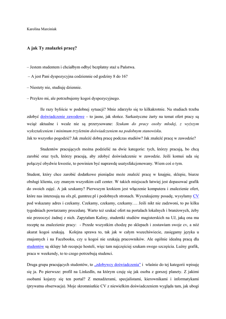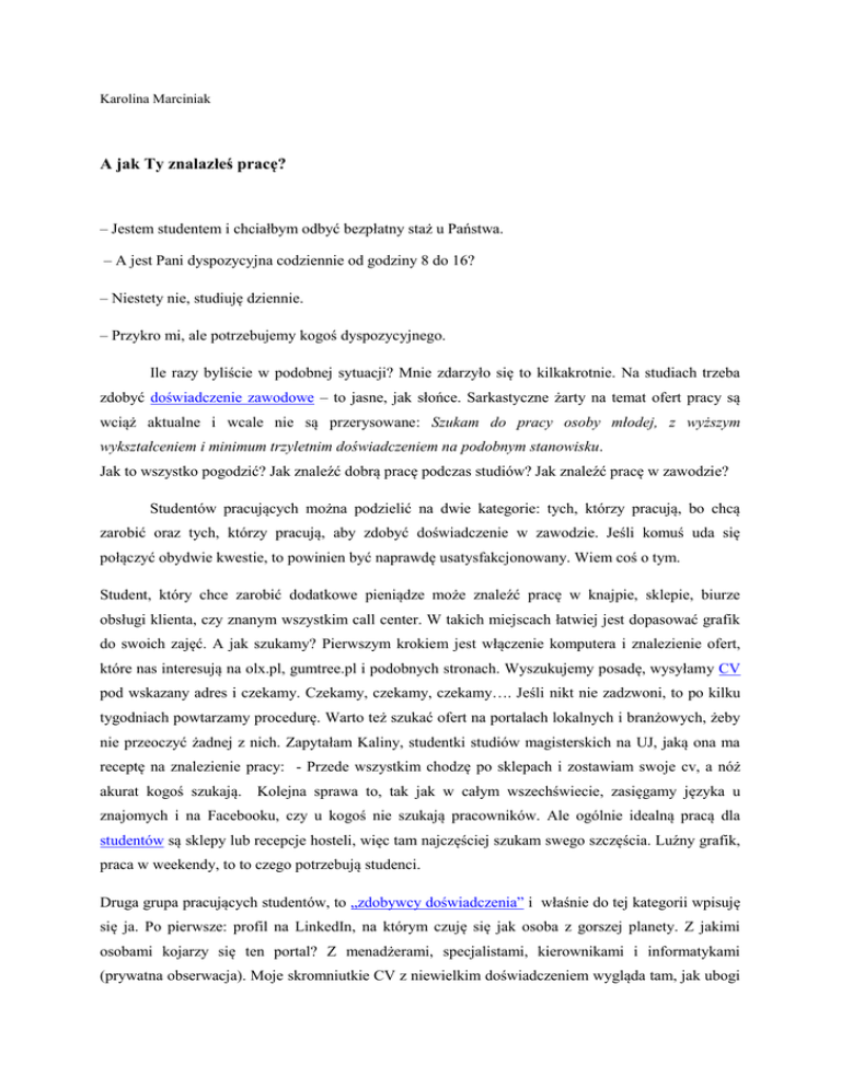 Karolina Marciniak A jak Ty znalazłeś pracę? – Jestem studentem i chciałbym odbyć bezpłatny staż u Państwa. – A jest Pani dyspozycyjna codziennie od godziny 8 do 16? – Niestety nie, studiuję dziennie. – Przykro mi, ale potrzebujemy kogoś dyspozycyjnego. Ile razy byliście w podobnej sytuacji? Mnie zdarzyło się to kilkakrotnie. Na studiach trzeba zdobyć doświadczenie zawodowe – to jasne, jak słońce. Sarkastyczne żarty na temat ofert pracy są wciąż aktualne i wcale nie są przerysowane: Szukam do pracy osoby młodej, z wyższym wykształceniem i minimum trzyletnim doświadczeniem na podobnym stanowisku. Jak to wszystko pogodzić? Jak znaleźć dobrą pracę podczas studiów? Jak znaleźć pracę w zawodzie? Studentów pracujących można podzielić na dwie kategorie: tych, którzy pracują, bo chcą zarobić oraz tych, którzy pracują, aby zdobyć doświadczenie w zawodzie. Jeśli komuś uda się połączyć obydwie kwestie, to powinien być naprawdę usatysfakcjonowany. Wiem coś o tym. Student, który chce zarobić dodatkowe pieniądze może znaleźć pracę w knajpie, sklepie, biurze obsługi klienta, czy znanym wszystkim call center. W takich miejscach łatwiej jest dopasować grafik do swoich zajęć. A jak szukamy? Pierwszym krokiem jest włączenie komputera i znalezienie ofert, które nas interesują na olx.pl, gumtree.pl i podobnych stronach. Wyszukujemy posadę, wysyłamy CV pod wskazany adres i czekamy. Czekamy, czekamy, czekamy…. Jeśli nikt nie zadzwoni, to po kilku tygodniach powtarzamy procedurę. Warto też szukać ofert na portalach lokalnych i branżowych, żeby nie przeoczyć żadnej z nich. Zapytałam Kaliny, studentki studiów magisterskich na UJ, jaką ona ma receptę na znalezienie pracy: - Przede wszystkim chodzę po sklepach i zostawiam swoje cv, a nóż akurat kogoś szukają. Kolejna sprawa to, tak jak w całym wszechświecie, zasięgamy języka u znajomych i na Facebooku, czy u kogoś nie szukają pracowników. Ale ogólnie idealną pracą dla studentów są sklepy lub recepcje hosteli, więc tam najczęściej szukam swego szczęścia. Luźny grafik, praca w weekendy, to to czego potrzebują studenci. Druga grupa pracujących studentów, to „zdobywcy doświadczenia” i właśnie do tej kategorii wpisuję się ja. Po pierwsze: profil na LinkedIn, na którym czuję się jak osoba z gorszej planety. Z jakimi osobami kojarzy się ten portal? Z menadżerami, specjalistami, kierownikami i informatykami (prywatna obserwacja). Moje skromniutkie CV z niewielkim doświadczeniem wygląda tam, jak ubogi krewny. Bardziej sprzyjającą platformą jest BaseConnect, którą poznałam tylko dlatego, że dała mi pracę w swoich szeregach. Teraz, wraz z załogą, robimy wszystko, żeby inni też poznali BaseConnect. Portal dla studentów z aspiracjami (można nazwać to reklamą). Ale zanim trafiłam do BaseConnect… szukałam, jak każdy z nas – pracuj.pl i OLX. Mogę śmiało powiedzieć, ze wysyłałam CV hurtowo – szukałam w dziennikarstwie, marketingu i Human resources. Niektórzy pracodawcy dzwonili, ale oczekiwali ode mnie pracy od 8 do 16. Codziennie. Warto zaznaczyć, że szukałam głównie bezpłatnych staży. Ale w końcu się udało! Piszę, rekrutuję, sama wybieram godziny pracy, a moje CV robi się coraz bogatsze. Jeśli nie masz doświadczenia w wymarzonym zawodzie, to nie dostaniesz pracy na wysokim stanowisku i nie od razu będziesz zarabiał krocie. A podobno młodzi ludzie myślą w taki sposób. Pewne jest jedno: bez stażu się nie obejdzie. I rada jest jedna: praktykuj i zbieraj doświadczenie podczas studiów, bo później rodzice nie będą chcieli Cię utrzymywać. A teraz wszyscy wyłączamy seriale i zaczynamy szukać pracy. Powodzenia! And how you found a job? - I am a student and I would like to take a free probation. - Are you disposition every day from 8 to 16? - Unfortunately, I am studying a day. - I'm sorry, but we need someone disposable. How many times you have been in a similar situation? It happened to me several times. On study, you have to gain work experience - it's clear as day. Sarcastic jokes about job offers are current and are not exaggerated: Looking for a young person to work with a university degree and a minimum of three years experience in a similar position. How accommodate this? How to find a good job while studying? How to find work in the profession? Students' work can be divided into two categories: those who work, because they want to earn and those who are working to gain experience in the profession. If someone manages to combine both issues, it should be really satisfied. I know something about it. A student who wants to earn extra money could find a job in a pub, shop, office, customer service, whether known to all call center. In such places it is easier to adjust graphics to their classes. And as we look for? The first step is to turn on the computer and find listings that interest us at olx.pl, gumtree.pl and similar sites. We are searching for a job, send your CV to the address indicated and wait. We are waiting, waiting, waiting .... If no one calls, after a few weeks, we repeat the procedure. It should also look for deals at local and industry-specific networks, so as not to miss any of them. I asked Kalina graduate student at the Jagiellonian University, which she has a prescription for finding work: - First of all, I go shopping and leave my CV and the just someone looking for. Another issue is, as in the whole universe, the scope of language with friends and on Facebook, or somebody not looking for employees. But overall an ideal job for students are shops or hostels reception, so there frequently looking their luck. A loose timetable, work on weekends, that's what the students need. The second group of working students, the "conqueror of experience" and I included to this category. Firstly profile on LinkedIn, where I feel like a person with inferior planet. With wha