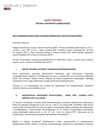 ALERT PRAWNY (Prawo zamówień publicznych) dot. nowelizacji ustawy Prawo zamówień publicznych z dnia 29 sierpnia 2014 r. Szanowni Państwo, Kolejna nowelizacja ustawy z dnia 29 stycznia 2004 r. Prawo zamówień publicznych (tj. Dz. U. z 2013 r., poz. 907 ze zm. – dalej „ustawa PZP”) wkrótce zacznie obowiązywać. W dniu 29 sierpnia 2014 r. Sejm uchwalił ustawę o zmianie ustawy PZP, która została podpisana przez Prezydenta RP w dniu 16 września 2014 r. W dniu 18 września nowelizację opublikowano w Dzienniku Ustaw, a zatem nowe przepisy wejdą w życie z dniem 19 października 2014 r. I. BĘDZIE TRUDNIEJ ZASTRZEC TAJEMNICĘ PRZEDSIĘBIORSTWA Jeżeli wykonawca zastrzegł jakiekolwiek informacje jako stanowiące tajemnicę przedsiębiorstwa, zgodnie ze zmienionym art. 8 ust. 3 ustawy PZP, już w momencie składania oferty lub wniosku, będzie musiał załączyć do oferty wyjaśnienia wykazujące, dlaczego zastrzeżone przez niego informacje są jego tajemnicą przedsiębiorstwa. Oznacza to, że zamawiający nie wezwie już wykonawcy do przedstawienia wyjaśnień odnośnie tajemnicy przedsiębiorstwa. II. MODYFIKACJA PRZESŁANEK WYKLUCZENIA – ZNIKA TZW. „CZARNA LISTA” PREZESA UZP I LEX ALPINE W ramach nowelizacji usunięto dwie kontrowersyjne przesłanki wykluczenia wykonawcy, który nie wykonał zamówienia tj. art. 24 ust. 1 pkt 1 i 1a ustawy PZP. W efekcie znika słynna „czarna lista” Prezesa UZP oraz tzw. lex Alpine, czyli przepis dający podstawę do wykluczenia z postępowania u konkretnego zamawiającego. W to miejsce ustawodawca wprowadza nową przesłankę wykluczenia, tj. art. 24 ust. 2 pkt 2a ustawy PZP, odnoszącą się do zawinionego, „poważnego naruszenia obowiązków zawodowych”. Będzie to jednak przesłanka fakultatywna, której zastosowanie w postępowaniu każdorazowo będzie zależeć od decyzji zamawiającego, wskazanej w specyfikacji istotnych warunków zamówienia lub w ogłoszeniu o zamówieniu. Zamawiający nie wykluczy wykonawcy, który udowodni, że podjął odpowiednie działania mające zapobiec niewykonaniu zamówienia oraz naprawił zamawiającemu szkodę. W praktyce, wykonawca powinien gromadzić wszelkie dokumenty, które pozwolą mu w przyszłości uniknąć zarzutu nierzetelnego wykonania umowy i tym samym, wykluczenia na podstawie omawianej przesłanki. III. ZMIANY W ZASADACH UDOSTĘPNIANIA POTENCJAŁU Wykonawcy uzyskają możliwość powoływania się w postępowaniu także na zdolności ekonomiczne podmiotu trzeciego, na przykład polisę OC, sprawozdania finansowe, czy wielkość średniorocznego zatrudnienia. Przypominamy, że dotychczas dopuszczalne było „pożyczanie” zdolności finansowych, czyli np. wysokości posiadanych środków finansowych lub zdolności kredytowej. Jednak zgodnie z nowymi przepisami, podmiot udostępniający zasoby ponosić będzie solidarną odpowiedzialność z wykonawcą za szkodę, jaką poniósł zamawiający wskutek nieudostępnienia zasobów. Oznacza to, że nowelizacja w praktyce zlikwiduje (albo drastycznie ograniczy) instytucję korzystania z zasobów podmiotu trzeciego przy wykazywaniu spełniania warunków udziału w postępowaniu. Po nowelizacji, zasada solidarnej odpowiedzialności podmiotu udostępniającego zasoby będzie się odnosić do każdego „rodzaju” zasobu, którego udostępnienie jest możliwe wg ustawy PZP, czyli np. referencji, potencjału technicznego, osób zdolnych do wykonania zamówienia, zdolności finansowych i także ekonomicznych. Solidarna odpowiedzialność oznacza bowiem odpowiedzialność całym majątkiem. Zatem podmiot użyczający potencjał, stanie się majątkowym gwarantem wykonania zamówienia, na tych samych warunkach co wykonawca. Ustawodawca nie określił też, kto będzie „rozsądzał” kiedy do szkody zamawiającego doszło „wskutek nieudostępnienia zasobów”, a kiedy z innych przyczyn. Trudno domyślać się skąd zamawiający będzie miał taką wiedzę. Zatem w praktyce, w razie poniesienia szkody, można zakładać, że zamawiający będą pozywać zarówno wykonawcę, jak i podmiot, który miał udostępnić potencjał. IV. ZAMAWIAJĄCY MOŻE ZAŻĄDAĆ UMOWY O PRACĘ Zamawiający może określić w opisie przedmiotu zamówienia dodatkowe warunki związane z realizacją zamówienia mające na celu wsparcie ważnych celów społecznych. Nowelizacja umożliwiła zamawiającym wskazywanie wymogu zatrudnienia na podstawie umowy o pracę osób wykonujących czynności w trakcie realizacji zamówienia na roboty budowlane i usługi (nie dotyczy dostaw). Zamawiający może nałożyć tego rodzaju obowiązek zarówno na wykonawcę, jak i podwykonawcę, o ile jest to uzasadnione przedmiotem lub charakterem tych czynności. 2 V. ZATRZYMANIE WADIUM – TYLKO GDY OFERTA MOGŁA BYĆ UZNANA ZA NAJKORZYSTNIEJSZĄ Dodatkowo, zgodnie z nowym brzmieniem art. 46 ust. 4a ustawy PZP, zamawiający nie będzie mógł zatrzymać wadium wszystkim wykonawcom, którzy nie uzupełnili wymaganych dokumentów, ale tylko temu, którego oferta mogła zostać uznana za najkorzystniejszą. Przepis budzi jednak wątpliwości, czy jeżeli analogiczna sytuacja (brak przedstawienia właściwych dokumentów) będzie dotyczyła wykonawcy, który złoży drugą w kolejności ofertę, to zamawiający również jemu zatrzyma wadium. W tym wypadku brak załączenia dokumentów uniemożliwi wybór oferty najkorzystniejszej. Wydaje się, że dopiero praktyka zamawiających oraz orzecznictwo Krajowej Izby Odwoławczej wskażą sposób interpretacji ww. przepisu. W praktyce jednak wykonawcy np. z 4 czy 6 pozycji nie będą już zmuszani do czasochłonnego i często kosztownego uzupełniania ofert, tylko po to, aby nie dać sobie zabrać wadium. VI. ZMIANY WOKÓŁ ZARZUTU RAŻĄCO NISKIEJ CENY Ustawodawca wprowadza znaczne zmiany w zakresie badania oferty pod kątem rażąco niskiej ceny. Na gruncie zmienionego art. 90 ustawy PZP, gdy cena oferty wydaje się rażąco nisk