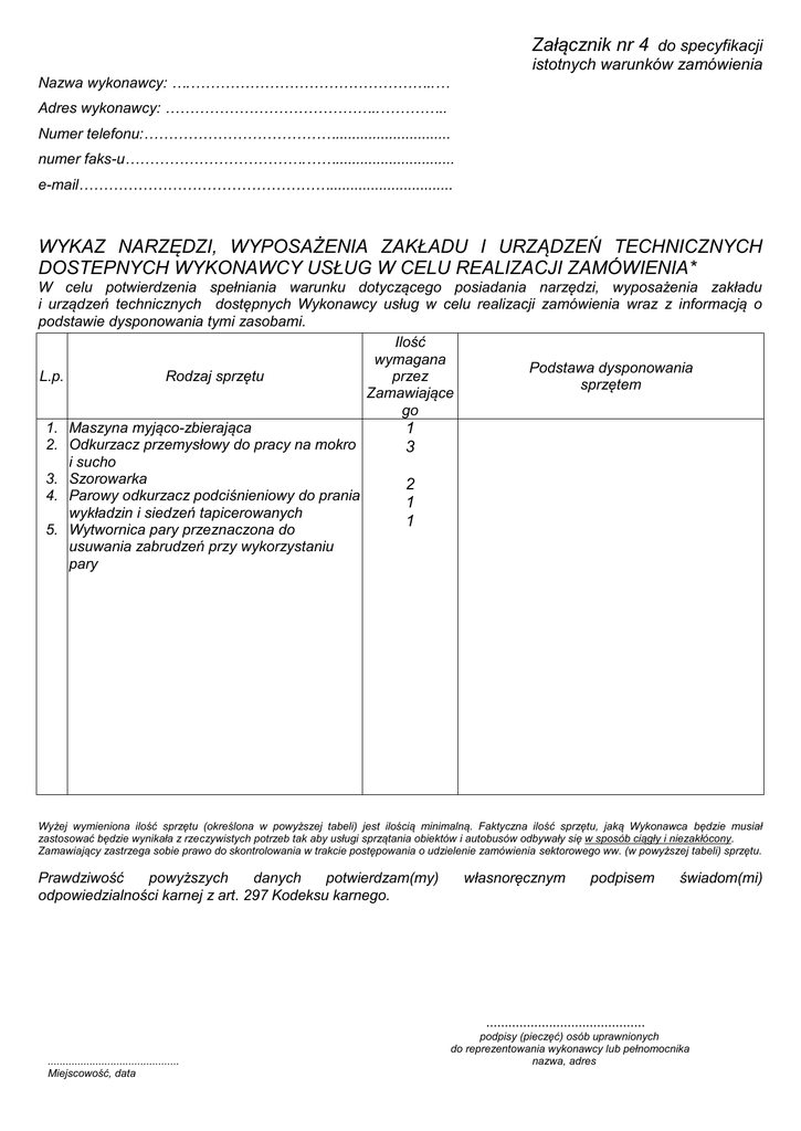 Załącznik nr 4 do specyfikacji istotnych warunków zamówienia Nazwa wykonawcy: ….…………………………………………..… Adres wykonawcy: ……………………………………..………….. Numer telefonu:…………………………………............................ numer faks-u……………………………….……............................. e-mail…………………………………………….............................. WYKAZ NARZĘDZI, WYPOSAŻENIA ZAKŁADU I URZĄDZEŃ TECHNICZNYCH DOSTEPNYCH WYKONAWCY USŁUG W CELU REALIZACJI ZAMÓWIENIA* W celu potwierdzenia spełniania warunku dotyczącego posiadania narzędzi, wyposażenia zakładu i urządzeń technicznych dostępnych Wykonawcy usług w celu realizacji zamówienia wraz z informacją o podstawie dysponowania tymi zasobami. Ilość wymagana Podstawa dysponowania L.p. Rodzaj sprzętu przez sprzętem Zamawiające go 1. Maszyna myjąco-zbierająca 1 2. Odkurzacz przemysłowy do pracy na mokro 3 i sucho 3. Szorowarka 2 4. Parowy odkurzacz podciśnieniowy do prania 1 wykładzin i siedzeń tapicerowanych 1 5. Wytwornica pary przeznaczona do usuwania zabrudzeń przy wykorzystaniu pary Wyżej wymieniona ilość sprzętu (określona w powyższej tabeli) jest ilością minimalną. Faktyczna ilość sprzętu, jaką Wykonawca będzie musiał zastosować będzie wynikała z rzeczywistych potrzeb tak aby usługi sprzątania obiektów i autobusów odbywały się w sposób ciągły i niezakłócony. Zamawiający zastrzega sobie prawo do skontrolowania w trakcie postępowania o udzielenie zamówienia sektorowego ww. (w powyższej tabeli) sprzętu. Prawdziwość powyższych danych potwierdzam(my) odpowiedzialności karnej z art. 297 Kodeksu karnego. własnoręcznym podpisem świadom(mi) ........................................... ............................................ Miejscowość, data podpisy (pieczęć) osób uprawnionych do reprezentowania wykonawcy lub pełnomocnika nazwa, adres