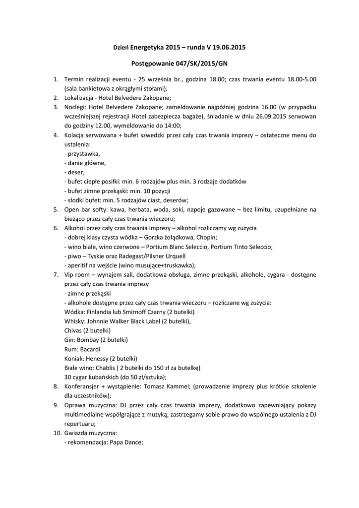 Dzień Energetyka 2015 – runda V 19.06.2015 Postępowanie 047/SK/2015/GN 1. Termin realizacji eventu - 25 września br., godzina 18.00; czas trwania eventu 18.00-5.00 (sala bankietowa z okrągłymi stołami); 2. Lokalizacja - Hotel Belvedere Zakopane; 3. Noclegi: Hotel Belvedere Zakopane; zameldowanie najpóźniej godzina 16.00 (w przypadku wcześniejszej rejestracji Hotel zabezpiecza bagaże), śniadanie w dniu 26.09.2015 serwowan do godziny 12.00, wymeldowanie do 14:00; 4. Kolacja serwowana + bufet szwedzki przez cały czas trwania imprezy – ostateczne menu do ustalenia: - przystawka, - danie główne, - deser; - bufet ciepłe posiłki: min. 6 rodzajów plus min. 3 rodzaje dodatków - bufet zimne przekąski: min. 10 pozycji - słodki bufet: min. 5 rodzajów ciast, deserów; 5. Open bar softy: kawa, herbata, woda, soki, napoje gazowane – bez limitu, uzupełniane na bieżąco przez cały czas trwania wieczoru; 6. Alkohol przez cały czas trwania imprezy – alkohol rozliczamy wg zużycia - dobrej klasy czysta wódka – Gorzka żołądkowa, Chopin; - wino białe, wino czerwone – Portium Blanc Seleccio, Portium Tinto Seleccio; - piwo – Tyskie oraz Radegast/Pilsner Urquell - aperitif na wejście (wino musujące+truskawka); 7. Vip room – wynajem sali, dodatkowa obsługa, zimne przekąski, alkohole, cygara - dostępne przez cały czas trwania imprezy - zimne przekąski - alkohole dostępne przez cały czas trwania wieczoru – rozliczane wg zużycia: Wódka: Finlandia lub Smirnoff Czarny (2 butelki) Whisky: Johnnie Walker Black Label (2 butelki), Chivas (2 butelki) Gin: Bombay (2 butelki) Rum: Bacardi Koniak: Henessy (2 butelki) Białe wino: Chablis ( 2 butelki do 150 zł za butelkę) 30 cygar kubańskich (do 50 zł/sztuka); 8. Konferansjer + wystąpienie: Tomasz Kammel; (prowadzenie imprezy plus krótkie szkolenie dla uczestników); 9. Oprawa muzyczna: DJ przez cały czas trwania imprezy, dodatkowo zapewniający pokazy multimedialne współgrające z muzyką; zastrzegamy sobie prawo do wspólnego ustalenia z DJ repertuaru; 10. Gwiazda muzyczna: - rekomendacja: Papa Dance; 11. 12. 13. 14. 15. 16. 17. 18. 19. 20. - prośba o alternatywne trzy propozycje artystów muzycznych, których wystąpienie mieści się budżecie max. 40 000 zł (podany budżet zakłada całość wszelkich ewentualnych kosztów tzn. honorarium, dojazd, zakwaterowanie, wyżywienie, rider techniczny etc.); Zespół coverowy: - rekomendacja: Modesta Pastiche; - prośba o trzy alternatywne propozycje wzorowane na powyższym, rekomendowanym zespole; Dodatkowa alternatywna atrakcja dodatkowa: - pokaz iluzji – rekomendacja: Maciej Pol; Kosze podarunkowe w kwocie do 150 zł – rekomendowana zawartość: dobrej klasy czysta wódka, nalewka/wino, dwa rodzaje kawy, herbata, wyroby czekoladowe, dobrej jakości produkty mięsne; Transport dla uczestników eventu na trasie Skawina-Zakopane/Zakopane Skawina, KrakówZakopane/Zakopane-Kraków, Chorzów-Zakopane/Zakopane-Kraków; Parking dla autobusów oraz aut prywatnych; Przygotowanie i wydruk zaproszeń; Obsługa fotograficzna i filmowa; W cenie należy uwzględnić oprawę, technikę i wizję (montaż, demontaż, obsługa, transport)– scena, nagłośnienie i oświetlenie sceny, nagłośnienie i oświetlenie sali oraz wejścia do sali, ekrany i projektory multimedialne, realizacja wizji, oświetlenie wejścia do hotelu, gobo, garderoby dla artystów; Dekoracje kwiatowe na stolikach oraz w sali; Ubezpieczeni NNW