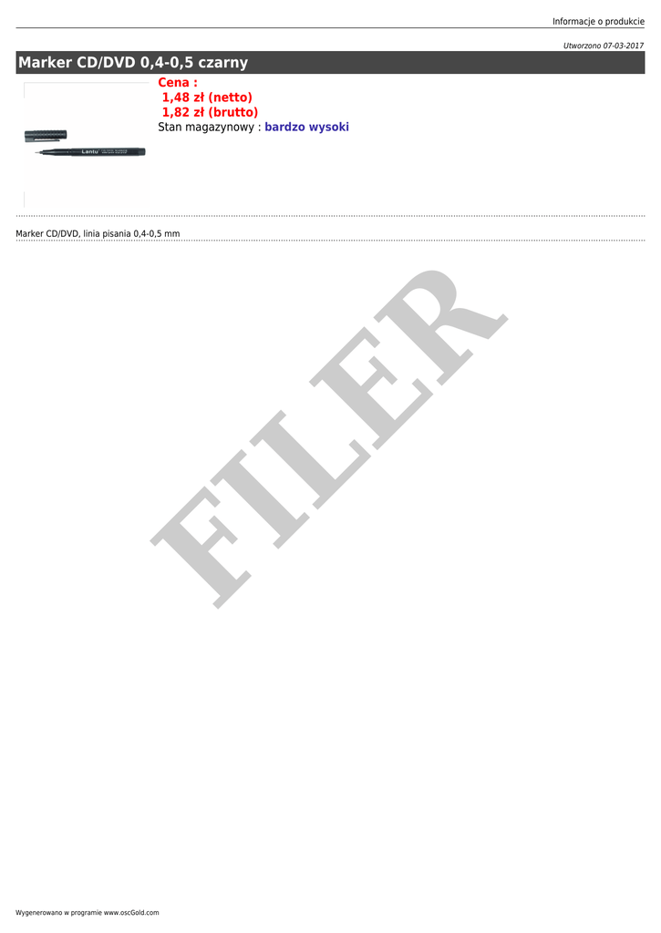 Informacje o produkcie Utworzono 07-03-2017 Marker CD/DVD 0,4-0,5 czarny Cena : 1,48 zł (netto) 1,82 zł (brutto) Stan magazynowy : bardzo wysoki FI LE R Marker CD/DVD, linia pisania 0,4-0,5 mm Wygenerowano w programie www.oscGold.com