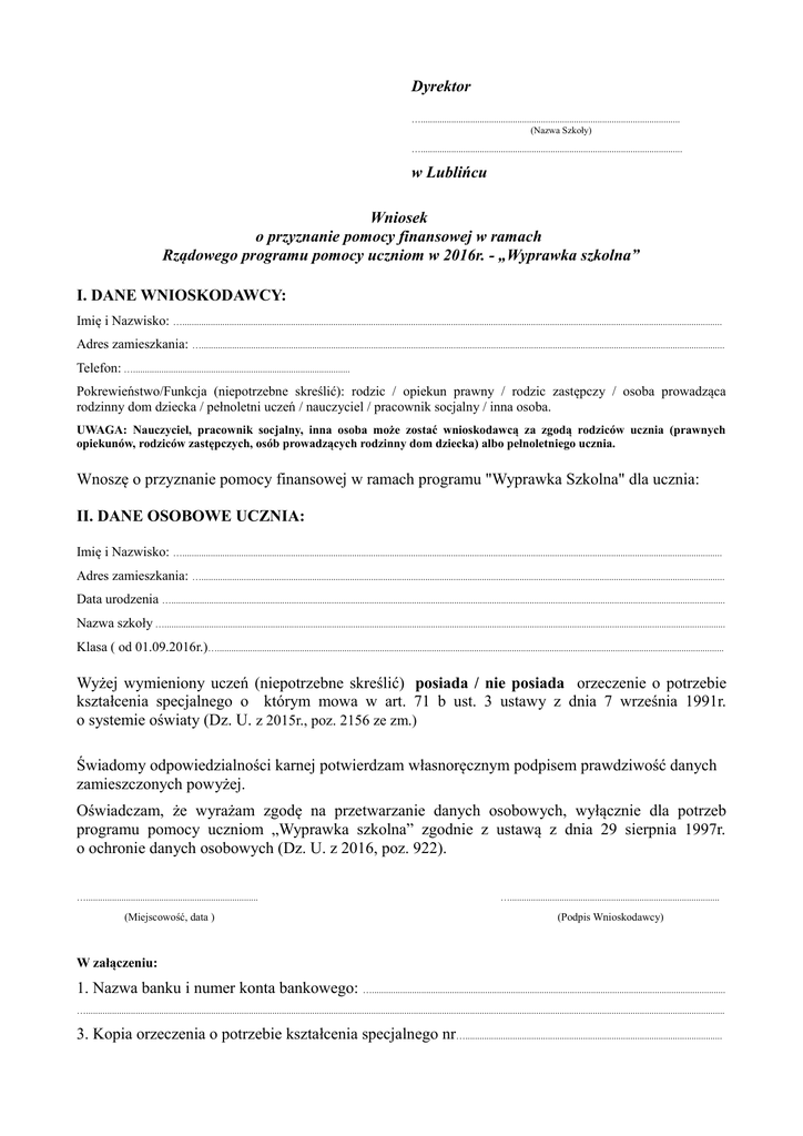 Dyrektor ….............................................................................................................. (Nazwa Szkoły) …............................................................................................................... w Lublińcu Wniosek o przyznanie pomocy finansowej w ramach Rządowego programu pomocy uczniom w 2016r. - „Wyprawka szkolna” I. DANE WNIOSKODAWCY: Imię i Nazwisko: …..................................................................................................................................................................................................................................... Adres zamieszkania: ….............................................................................................................................................................................................................................. Telefon: …............................................................................................ Pokrewieństwo/Funkcja (niepotrzebne skreślić): rodzic / opiekun prawny / rodzic zastępczy / osoba prowadząca rodzinny dom dziecka / pełnoletni uczeń / nauczyciel / pracownik socjalny / inna osoba. UWAGA: Nauczyciel, pracownik socjalny, inna osoba może zostać wnioskodawcą za zgodą rodziców ucznia (prawnych opiekunów, rodziców zastępczych, osób prowadzących rodzinny dom dziecka) albo pełnoletniego ucznia. Wnoszę o przyznanie pomocy finansowej w ramach programu "Wyprawka Szkolna" dla ucznia: II. DANE OSOBOWE UCZNIA: Imię i Nazwisko: …..................................................................................................................................................................................................................................... Adres zamieszkania: ….............................................................................................................................................................................................................................. Data urodzenia …........................................................................................................................................................................................................................................... Nazwa szkoły ….............................................................................................................................................................................................................................................. Klasa ( od 01.09.2016r.)…....................................................................................................................................................................................................................... Wyżej wymieniony uczeń (niepotrzebne skreślić) posiada / nie posiada orzeczenie o potrzebie kształcenia specjalnego o którym mowa w art. 71 b ust. 3 ustawy z dnia 7 września 1991r. o systemie oświaty (Dz. U. z 2015r., poz. 2156 ze zm.) Świadomy odpowiedzialności karnej potwierdzam własnoręcznym podpisem prawdziwość danych zamieszczonych powyżej. Oświadczam, że wyrażam zgodę na przetwarzanie danych osobowych, wyłącznie dla potrzeb programu pomocy uczniom „Wyprawka szkolna” zgodnie z ustawą z dnia 29 sierpnia 1997r. o ochronie danych osobowych (Dz. U. z 2016, poz. 922). …......................................................................... …......................................................................................... (Miejscowość, data ) (Podpis Wnioskodawcy) W załączeniu: 1. Nazwa banku i numer konta bankowego: …...................................................................................................................................................... …............................................................................................................................................................................................................................................................................... 3. Kopia orzeczenia o potrzebie kształcenia specjalnego nr….............................................................................................................