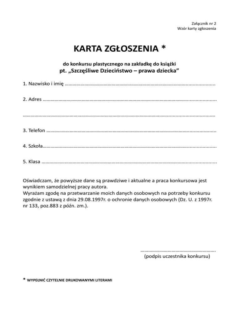Załącznik nr 2 Wzór karty zgłoszenia KARTA ZGŁOSZENIA * do konkursu plastycznego na zakładkę do książki pt. „Szczęśliwe Dzieciństwo – prawa dziecka” 1. Nazwisko i imię …………………………………………………………………………………..................... 2. Adres …………………………………………………………………………………………………..................... ………………………………………………………………………………………………….................................. 3. Telefon ………………………………………………………………………………………………..................... 4. Szkoła…………………………………………………………………………………………………..................... 5. Klasa …………………………………………………………………………………………………...................... Oświadczam, że powyższe dane są prawdziwe i aktualne a praca konkursowa jest wynikiem samodzielnej pracy autora. Wyrażam zgodę na przetwarzanie moich danych osobowych na potrzeby konkursu zgodnie z ustawą z dnia 29.08.1997r. o ochronie danych osobowych (Dz. U. z 1997r. nr 133, poz.883 z późn. zm.). …………………………………………………. (podpis uczestnika konkursu) * WYPEŁNIĆ CZYTELNIE DRUKOWANYMI LITERAMI