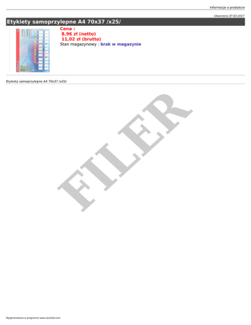 Informacje o produkcie Utworzono 07-03-2017 Etykiety samoprzylepne A4 70x37 /x25/ Cena : 8,96 zł (netto) 11,02 zł (brutto) Stan magazynowy : brak w magazynie FI LE R Etykiety samoprzylepne A4 70x37 /x25/ Wygenerowano w programie www.oscGold.com