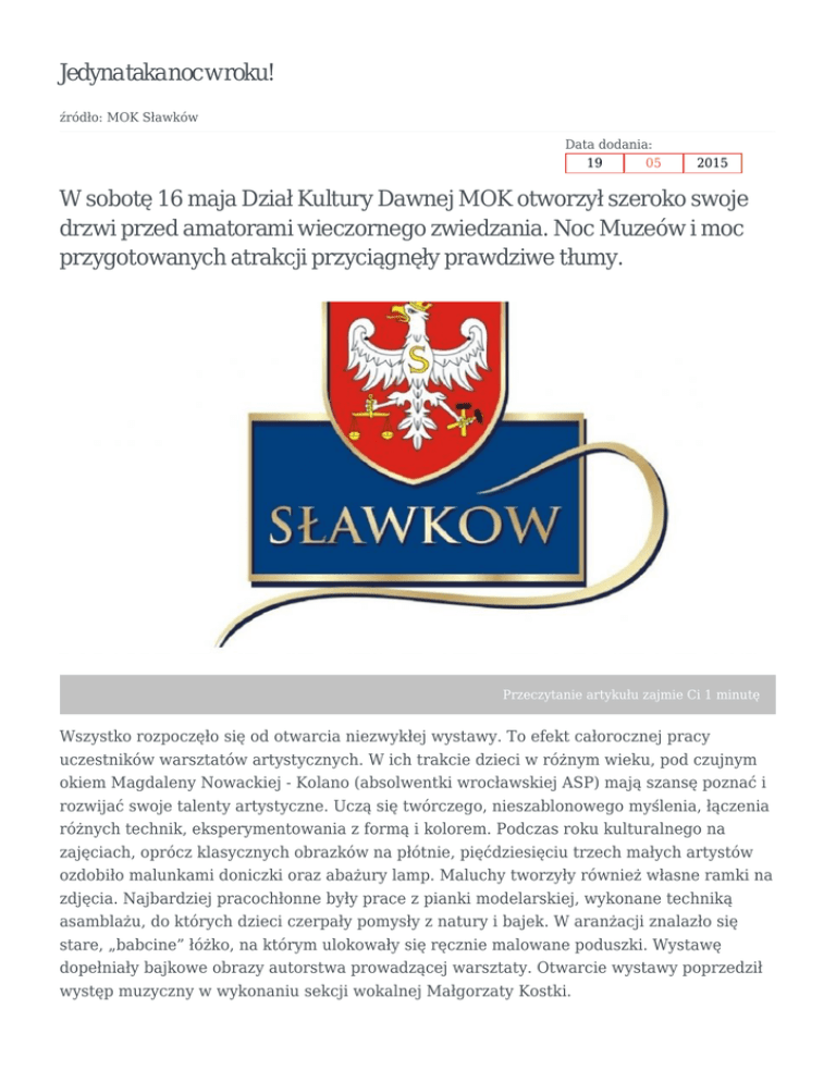 Jedynatakanocwroku! źródło: MOK Sławków Data dodania: 19 05 2015 W sobotę 16 maja Dział Kultury Dawnej MOK otworzył szeroko swoje drzwi przed amatorami wieczornego zwiedzania. Noc Muzeów i moc przygotowanych atrakcji przyciągnęły prawdziwe tłumy. Przeczytanie artykułu zajmie Ci 1 minutę Wszystko rozpoczęło się od otwarcia niezwykłej wystawy. To efekt całorocznej pracy uczestników warsztatów artystycznych. W ich trakcie dzieci w różnym wieku, pod czujnym okiem Magdaleny Nowackiej - Kolano (absolwentki wrocławskiej ASP) mają szansę poznać i rozwijać swoje talenty artystyczne. Uczą się twórczego, nieszablonowego myślenia, łączenia różnych technik, eksperymentowania z formą i kolorem. Podczas roku kulturalnego na zajęciach, oprócz klasycznych obrazków na płótnie, pięćdziesięciu trzech małych artystów ozdobiło malunkami doniczki oraz abażury lamp. Maluchy tworzyły również własne ramki na zdjęcia. Najbardziej pracochłonne były prace z pianki modelarskiej, wykonane techniką asamblażu, do których dzieci czerpały pomysły z natury i bajek. W aranżacji znalazło się stare, „babcine” łóżko, na którym ulokowały się ręcznie malowane poduszki. Wystawę dopełniały bajkowe obrazy autorstwa prowadzącej warsztaty. Otwarcie wystawy poprzedził występ muzyczny w wykonaniu sekcji wokalnej Małgorzaty Kostki. Organizatorzy składają podziękowania sponsorom imprezy: burmistrzowi Rafałowi Adamczykowi, radnemu Rady Miejskiej Michałowi Malinowskiemu, mecenasowi Rafałowi Kolano i Agencji Reklamowej Plastfirm. Więcej na stronie internetowej Działu Kultury Dawnej MOK -KLIKNIJ D R U KUJ D RUKUJ DO PDF http://www.slawkow.pl/print.php?pdf=true&unique=jedyna-taka-noc-w-roku