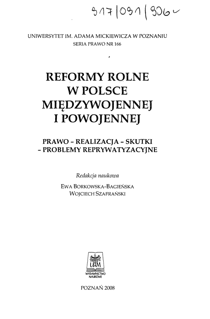 UNIWERSYTET IM. ADAMA MICKIEWICZA W POZNANIU SERIA PRAWO NR 166 REFORMY ROLNE W POLSCE MIĘDZYWOJENNEJ I POWOJENNEJ PRAWO - REALIZACJA - SKUTKI PROBLEMY REPRYWATYZACYJNE Redakcja naukowa EWA BORKOWSKA-BAGIEŃSKA WOJCIECH SZAFRAŃSKI WYDAWNICTWO NAUKOWE POZNAŃ 2008 Spis treści Przedmowa EWA BORKOWSKA-BAGIEŃSKA, WOJCIECH SZAFRAŃSKI 7 MAKSYMILIAN STANULEWICZ Reforma rolna jako próba regulacji stosunków agrarnych w Polsce. Koncepcje i próby ich realizacji latach 1918-1944 11 ANETA SUCHOŃ, MACIEJ KOWALCZYK Analiza przepisów dekretu PKWN z 6 września 1944 r. o przeprowadzeniu reformy rolnej wraz z późniejszymi zmianami oraz innych aktów prawnych na podstawie których nastąpiło przejęcie nieruchomości ziemskich i lasów 63 ANETA SUCHOŃ Ekonomiczne aspekty reformy rolnej i osadnictwa 139 MACIEJ KOWALCZYK Przestępstwa przeciwko reformie rolnej 155 ANETA SUCHOŃ Możliwość nabycia przez byłych właścicieli oraz ich spadkobierców nieruchomości wchodzących w skład Zasobu Własności Rolnej Skarbu Państwa 177 ANETA SUCHOŃ Prawo do rekompensaty z tytułu pozostawienia nieruchomości poza obecnymi granicami Rzeczypospolitej Polskiej ALICJA JAGIELSKA . 185 . Reforma rolna na tle orzecznictwa Naczebiego Sądu Administracyjnego - zagadnienia wybrane '. 191 WOJCIECH SZAFRAŃSKI, ALICJA JAGIELSKA Dotychczasowe koncepcje przeprowadzenia reprywatyzacji w Polsce 209 WOJCIECH SZAFRAŃSKI Projekt ustawy o rekompensatach za przejęte przez państiuo nieruchomości oraz niektóre inne składniki mienia. Próba oceny- kierunki zmian 221 WOJCIECH SZAFRAŃSKI Problematyka rzeczy zabytkowych w projekcie ustmuy o rekompensatach za przejęte przez państwo nieruchomości oraz niektóre inne składniki mienia 235