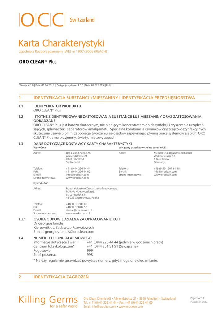 Karta Charakterystyki zgodnie z Rozporządzeniem (WE) nr 1907/2006 (REACH) ORO CLEAN® Plus Wersja: 4.1.0 | Data: 01.06.2015 || Zastępuje wydanie: 4.0.0 | Data: 01.02.2015 || Polski 1 IDENTYFIKACJA SUBSTANCJI/MIESZANINY I IDENTYFIKACJA PRZEDSIĘBIORSTWA 1.1 IDENTYFIKATOR PRODUKTU ORO CLEAN® Plus 1.2 ISTOTNE ZIDENTYFIKOWANE ZASTOSOWANIA SUBSTANCJI LUB MIESZANINY ORAZ ZASTOSOWANIA ODRADZANE ORO CLEAN® Plus jest bardzo skutecznym, nie pieniącym koncentratem do dezynfekcji i czyszczenia urządzeń ssących, spluwaczek i separatorów amalgamatu. Specjalna kombinacja czynników czyszcząco–dezynfekcyjnych skutecznie usuwa biofilm, zapobiega tworzeniu się osadów zapewniając płynną pracę systemów ssących. ORO CLEAN® Plus ma przyjemny, świeży, miętowy zapach. 1.3 DANE DOTYCZĄCE DOSTAWCY KARTY CHARAKTERYSTYKI Wytwórca Wyłączny przedstawiciel na terenie UE: Adres: Oro Clean Chemie AG Allmendstrasse 21 8320 Fehraltorf Switzerland Adres: Medical OCC Deutschland GmbH Wickhofstrasse 12 13467 Berlin Germany Telefon: Faks: E-mail: Strona internetowa: +41 (0)44 226 44 44 +41 (0)44 226 44 00 info@oroclean.com www.oroclean.com Telefon: E-mail: Strona internetowa: +49 (0)30 1207 61 18 info@oroclean.com www.oroclean.com Dystrybutor Adres: Przedsiębiorstwo Zaopatrzenia Medycznego MARKU M.Krawczyk sp.j. ul. Loretańska 31 42-226 Częstochowa, Polska Telefon: Faks: E-mail: Strona internetowa: +48 34 367 00 00 +48 34 368 82 50 [email protected] www.marku.com.pl 1.3.1 OSOBA ODPOWIEDZIALNA ZA OPRACOWANIE KCH Dr Georgios Ionidis Kierownik ds. Badawczo-Rozwojowych E-mail: georgios.ionidis@oroclean.com 1.4 NUMER TELEFONU ALARMOWEGO Informacje dotyczące awarii: +41 (0)44 226 44 44 (jedynie w godzinach pracy) Centrum toksykologiczne*: +41 (0)44 251 51 51 (Szwajcaria) Pogotowie: 999 Straż pożarna: 998 * Należy regularnie sprawdzać powyższe numery, gdyż mogą one ulec zmianie. 2 IDENTYFIKACJA ZAGROŻEŃ Killing Germs for a safer world Oro Clean Chemie AG • Allmendstrasse 21 • 8320 Fehraltorf • Switzerland Tel. + 41 (0) 44 226 44 44 • Fax: +41 (0) 44 226 44 00 Email: [email protected] • www.oroclean.com Page 1 of 13 PL3D8EB46A9C Karta Charakterystyki zgodnie z Rozporządzeniem (WE) nr 1907/2006 (REACH) ORO CLEAN® Plus Wersja: 4.1.0 | Data: 01.06.2015 || Zastępuje wydanie: 4.0.0 | Data: 01.02.2015 || Polski 2.1 KLASYFIKACJA SUBSTANCJI LUB MIESZANINY 2.1.1 KLASYFIKACJA ZGODNIE Z ROZPORZĄDZENIEM (WE) NR 1272/2008 KLASY I KATEGORIE ZAGROŻEŃ ZWROTY WSKAZUJĄCE RODZAJ ZAGROŻENIA PROCEDURA KLASYFIKACJI Skin Corr. 1C H314 Powoduje poważne oparzenia Na podstawie danych z testów. skóry oraz uszkodzenia oczu. Eye Dam. 1 H318 Powoduje poważne uszkodze Zharmonizowana (prawna) klasyfikacja. nie oczu. Aquatic Acute 1 H400 Działa bardzo toksycznie na or Zharmonizowana (prawna) klasyfikacja. ganizmy wodne. Aquatic Chronic 2 H411 Działa toksycznie na organizmy Zharmonizowana (prawna) klasyfikacja. wodne, powodując długotrwałe skutki. 2.2 ELEMENTY OZNAKOWANIA 2.2.1 OZNACZENIE MIESZANINY ZGODNIE Z ROZPORZĄDZENIEM (WE) NR 1272/2008 Piktogramy oznaczające zagrożenia Hasło ostrzegawcze: Niebezpieczeństwo Zwroty wskazujące rodzaj zagrożenia H314 Powoduje poważne oparzenia skóry oraz uszkodzenia oczu. H410 Działa bardzo toksycznie na organizmy wodne, powodując długotrwałe skutki. Killing Germs for a safer world Oro Clean Chemie AG • Allmendstrasse 21 • 8320 Fehraltorf • Switzerland Tel. + 41 (0) 44 226 44 44 • Fax: +41 (0) 44 226 44 00 Email: [email protected] • www.oroclean.com Page 2 of 13 PL3D8EB46A9C Karta Charakterystyki zgodnie z Rozporządzeniem (WE) nr 1907/2006 (REACH) ORO CLEAN® Plus Wersja: 4.1.0 | Data: 01.06.2015 || Zastępuje wydanie: 4.0.0 | Data: 01.02.2015 || Polski Zwroty wskazujące środki ostrożności: P280.1 Stosować rękawice ochronne, odzież ochronną oraz ochronę oczu. P301+P330+P331 W PRZYPADKU POŁKNIĘCIA: wypłukać usta. NIE wywoływać wymiotów. P303+P361+P353 W PRZYPADKU KONTATKU ZE SKÓRĄ (lub z włosami): Natychmiast usunąć/zdjąć całą zanieczyszczoną odzież. Spłukać skórę pod strumieniem wody/prysznicem. P305+P351+P338 W PRZYPADKU DOSTANIA SIĘ DO OCZU: Ostrożnie płukać wodą przez kilka minut. Wyjąć soczewki kontaktowe, jeżeli są założone i można je łatwo usunąć. Nadal płukać. P391 Zebrać wyciek. P501.1 Zawartość/pojemnik usunąć zgodnie z odpowiednimi przepisami. Uzupełniające informacje o zagrożeniach (UE): – No supplementary labelling requirements according to Regulation (EC) 1272/2008. 2.3 INNE ZAGROŻENIA Niniejsza mieszanina nie należy do kategorii PBT lub vPvB zgodnie z REACH, aneks XIII. 3 SKŁAD / INFORMACJA O SKŁADNIKACH 3.1 SUBSTANCJE Niniejszy produkt jest mieszaniną (patrz część 3.2). 3.2 MIESZANINY 3.2.1 NIEBEZPIECZNE SKŁADNIKI KLASYFIKACJA ZGODNIE Z ROZPORZĄDZENIEM (WE) NR 1272/2008 Nazwa Numer CAS Numer EINECS Numer in deksu Numer REACH Kategorie zagrożeń Chlorek benzylo-C12-18-alk ilodimetylowy 68424-85-1 270-325-2 n.a. Propan-2-ol 67-63-0 200-661-7 05-2115874530-460000 Acute Tox. 4, Skin Corr. H302, H314, 1B, Aquatic Acute 1, H400, H410 Aquatic Chronic 1 5% - < 15% 603-117-00- 05-2115478264-410 0000 Flam. Liq. 2, Eye Irrit. 2, H225, H319, STOT SE 3 H336 2.5% - < 5% 3.2.2 INFORMACJE DODATKOWE Pełen tekst wymienionych zwrotów R i H podano w części 16 . 4 ŚRODKI PIERWSZEJ POMOCY 4.1 OPIS ŚRODKÓW PIERWSZEJ POMOCY Killing Germs for a safer world Oro Clean Chemie AG • Allmendstrasse 21 • 8320 Fehraltorf • Switzerland Tel. + 41 (0) 44 226 44 44 • Fax: +41 (0) 44 226 44 00 Email: [email protected] • www.oroclean.com Zwroty wskazujące rodzaj zagrożeni Stężenie Page 3 of 13 PL3D8EB46A9C Karta Charakterystyki zgodnie z Rozporządzeniem (WE) nr 1907/2006 (REACH) ORO CLEAN® Plus Wersja: 4.1.0 | Data: 01.06.2015 || Zastępuje wydanie: 4.0.0 | Data: 01.02.2015 || Polski 4.1.1 ZALECENIA OGÓLNE Zapewnić środki ochrony. Stosować odpowiednie środki ochrony os