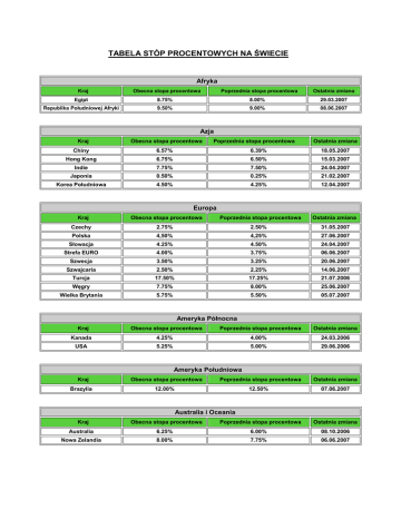 TABELA STÓP PROCENTOWYCH NA ŚWIECIE Afryka Kraj Obecna stopa procentowa Poprzednia stopa procentowa Ostatnia zmiana Egipt 8.75% 8.00% 29.03.2007 Republika Południowej Afryki 9.50% 9.00% 08.06.2007 Azja Kraj Obecna stopa procentowa Poprzednia stopa procentowa Ostatnia zmiana Chiny 6.57% 6.39% 18.05.2007 Hong Kong 6.75% 6.50% 15.03.2007 Indie 7.75% 7.50% 24.04.2007 Japonia 0.50% 0.25% 21.02.2007 Korea Południowa 4.50% 4.25% 12.04.2007 Europa Kraj Obecna stopa procentowa Poprzednia stopa procentowa Ostatnia zmiana Czechy 2.75% 2.50% 31.05.2007 Polska 4,50% 4,25% 27.06.2007 Słowacja 4.25% 4.50% 24.04.2007 Strefa EURO 4.00% 3.75% 06.06.2007 Szwecja 3.50% 3.25% 20.06.2007 Szwajcaria 2.50% 2.25% 14.06.2007 Turcja 17.50% 17.25% 21.07.2006 Węgry 7.75% 8.00% 25.06.2007 Wielka Brytania 5.75% 5.50% 05.07.2007 Ameryka Północna Kraj Obecna stopa procentowa Poprzednia stopa procentowa Ostatnia zmiana Kanada 4.25% 4.00% 24.03.2006 USA 5.25% 5.00% 29.06.2006 Ameryka Południowa Kraj Brazylia Obecna stopa procentowa Poprzednia stopa procentowa 12.00% 12.50% Ostatnia zmiana 07.06.2007 Australia i Oceania Kraj Obecna stopa procentowa Poprzednia stopa procentowa Ostatnia zmiana Australia 6.25% 6.00% 08.10.2006 Nowa Zelandia 8.00% 7.75% 06.06.2007