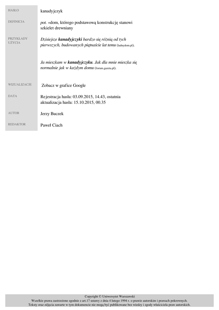 HASŁO kanadyjczyk DEFINICJA pot. «dom, którego podstawową konstrukcję stanowi szkielet drewniany» PRZYKŁADY UŻYCIA Dzisiejsze kanadyjczyki bardzo się różnią od tych pierwszych, budowanych piętnaście lat temu (ladnydom.pl). Ja mieszkam w kanadyjczyku. Jak dla mnie mieszka się normalnie jak w każdym domu (forum.gazeta.pl). WIZUALIZACJE Zobacz w grafice Google DATA Rejestracja hasła: 03.09.2015, 14.43, ostatnia aktualizacja hasła: 15.10.2015, 00.35 AUTOR Jerzy Buczek REDAKTOR Paweł Ciach Copyright © Uniwersytet Warszawski Wszelkie prawa zastrzeżone zgodnie z art.17 ustawy z dnia 4 lutego 1994 r. o prawie autorskim i prawach pokrewnych. Teksty oraz zdjęcia zawarte w tym dokumencie nie mogą być publikowane bez wiedzy i zgody właściciela praw autorskich. Powered by TCPDF (www.tcpdf.org)