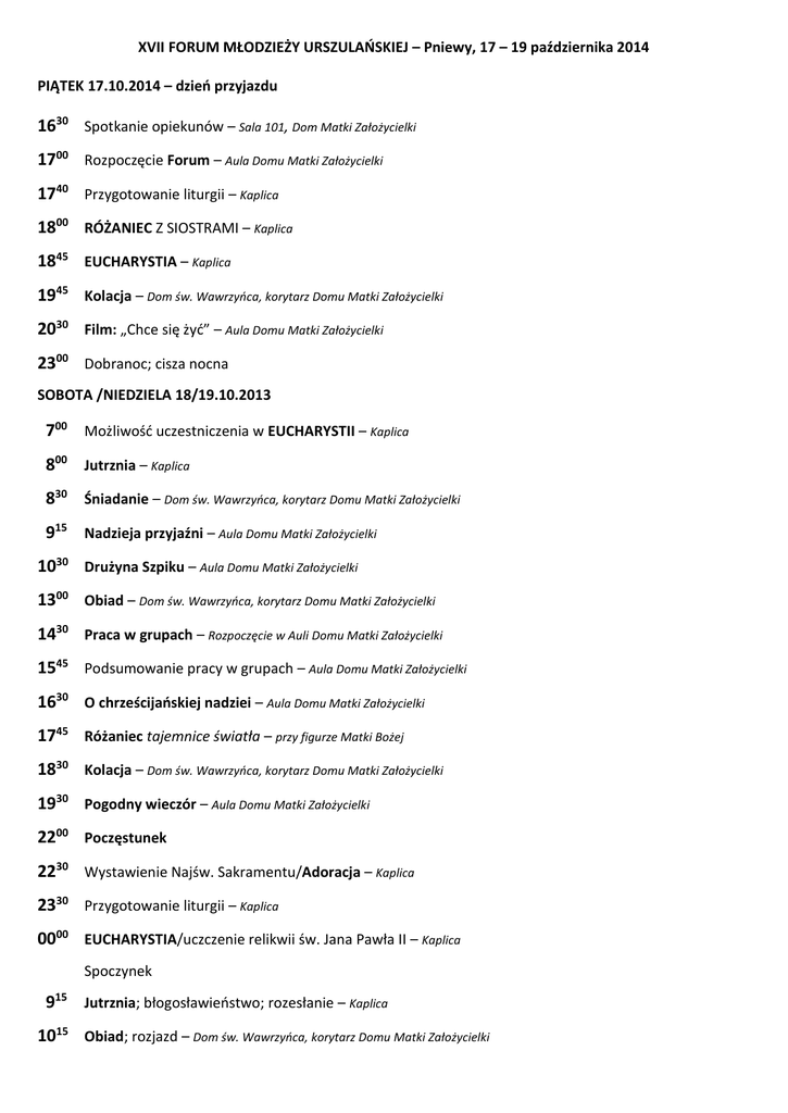 XVII FORUM MŁODZIEŻY URSZULAŃSKIEJ – Pniewy, 17 – 19 października 2014 PIĄTEK 17.10.2014 – dzień przyjazdu 1630 Spotkanie opiekunów – Sala 101, Dom Matki Założycielki 1700 Rozpoczęcie Forum – Aula Domu Matki Założycielki 1740 Przygotowanie liturgii – Kaplica 1800 RÓŻANIEC Z SIOSTRAMI – Kaplica 1845 EUCHARYSTIA – Kaplica 1945 Kolacja – Dom św. Wawrzyńca, korytarz Domu Matki Założycielki 2030 Film: „Chce się żyć” – Aula Domu Matki Założycielki 2300 Dobranoc; cisza nocna SOBOTA /NIEDZIELA 18/19.10.2013 700 Możliwość uczestniczenia w EUCHARYSTII – Kaplica 800 Jutrznia – Kaplica 830 Śniadanie – Dom św. Wawrzyńca, korytarz Domu Matki Założycielki 915 Nadzieja przyjaźni – Aula Domu Matki Założycielki 1030 Drużyna Szpiku – Aula Domu Matki Założycielki 1300 Obiad – Dom św. Wawrzyńca, korytarz Domu Matki Założycielki 1430 Praca w grupach – Rozpoczęcie w Auli Domu Matki Założycielki 1545 Podsumowanie pracy w grupach – Aula Domu Matki Założycielki 1630 O chrześcijańskiej nadziei – Aula Domu Matki Założycielki 1745 Różaniec tajemnice światła – przy figurze Matki Bożej 1830 Kolacja – Dom św. Wawrzyńca, korytarz Domu Matki Założycielki 1930 Pogodny wieczór – Aula Domu Matki Założycielki 2200 Poczęstunek 2230 Wystawienie Najśw. Sakramentu/Adoracja – Kaplica 2330 Przygotowanie liturgii – Kaplica 0000 EUCHARYSTIA/uczczenie relikwii św. Jana Pawła II – Kaplica Spoczynek 915 Jutrznia; błogosławieństwo; rozesłanie – Kaplica 1015 Obiad; rozjazd – Dom św. Wawrzyńca, korytarz Domu Matki Założycielki na FORUM zapraszamy młodzież od III klasy gimnazjum; przyjazd w piątek do godz. 1600; należy zabrać śpiwór i karimatę; każda grupa ma 5 minut do zagospodarowania na pogodnym wieczorze; będzie możliwość skorzystania z sakramentu pojednania, dobrze byłoby jednak przystąpić do spowiedzi przed przyjazdem do Pniew w swoich miejscach zamieszkania; koszt uczestnictwa – 55 zł; liczba miejsc ograniczona; o przyjęciu grupy decyduje kolejność zgłoszeń; szczegółowe informacje i zgłoszenia do 11 października 2014: s. Danuta Sakowicz ul. Św. Urszuli Ledóchowskiej 1 62-045 PNIEWY tel.: 61 293 82 26 507-700-323 e-mail: [email protected]