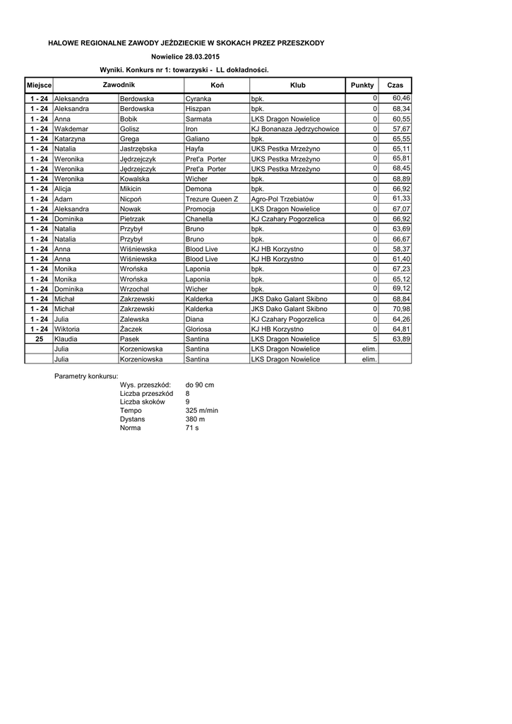 HALOWE REGIONALNE ZAWODY JEŹDZIECKIE W SKOKACH PRZEZ PRZESZKODY Nowielice 28.03.2015 Wyniki. Konkurs nr 1: towarzyski - LL dokładności. Zawodnik Miejsce 1 - 24 1 - 24 1 - 24 1 - 24 1 - 24 1 - 24 1 - 24 1 - 24 1 - 24 1 - 24 1 - 24 1 - 24 1 - 24 1 - 24 1 - 24 1 - 24 1 - 24 1 - 24 1 - 24 1 - 24 1 - 24 1 - 24 1 - 24 1 - 24 25 Aleksandra Aleksandra Anna Wakdemar Katarzyna Natalia Weronika Weronika Weronika Alicja Adam Aleksandra Dominika Natalia Natalia Anna Anna Monika Monika Dominika Michał Michał Julia Wiktoria Klaudia Julia Julia Koń Berdowska Berdowska Bobik Golisz Grega Jastrzębska Jędrzejczyk Jędrzejczyk Kowalska Mikicin Nicpoń Nowak Pietrzak Przybył Przybył Wiśniewska Wiśniewska Wrońska Wrońska Wrzochal Zakrzewski Zakrzewski Zalewska Żaczek Pasek Korzeniowska Korzeniowska Cyranka Hiszpan Sarmata Iron Galiano Hayfa Pret'a Porter Pret'a Porter Wicher Demona Trezure Queen Z Promocja Chanella Bruno Bruno Blood Live Blood Live Laponia Laponia Wicher Kalderka Kalderka Diana Gloriosa Santina Santina Santina Wys. przeszkód: Liczba przeszkód Liczba skoków Tempo Dystans Norma do 90 cm 8 9 325 m/min 380 m 71 s Parametry konkursu: Klub bpk. bpk. LKS Dragon Nowielice KJ Bonanaza Jędrzychowice bpk. UKS Pestka Mrzeżyno UKS Pestka Mrzeżyno UKS Pestka Mrzeżyno bpk. bpk. Agro-Pol Trzebiatów LKS Dragon Nowielice KJ Czahary Pogorzelica bpk. bpk. KJ HB Korzystno KJ HB Korzystno bpk. bpk. bpk. JKS Dako Galant Skibno JKS Dako Galant Skibno KJ Czahary Pogorzelica KJ HB Korzystno LKS Dragon Nowielice LKS Dragon Nowielice LKS Dragon Nowielice Punkty Czas 0 60,46 0 0 0 0 0 0 0 68,34 60,55 57,67 65,55 65,11 65,81 68,45 0 0 0 68,89 66,92 61,33 0 0 0 0 0 0 0 0 0 67,07 66,92 63,69 66,67 58,37 61,40 67,23 65,12 69,12 0 0 0 0 5 elim. elim. 68,84 70,98 64,26 64,81 63,89 Wyniki. Konkurs nr 2 towarzyski: Kl. L, dokładności z trafieniem w normę czasu. Zawodnik Miejsce 1 2 3 4 5 6 7 8 9 10 11 12 13 14 15 16 17 19 20 21 22 25 Koń Klub Aleksandra Wakdemar Katarzyna Michał Julia Aleksandra Magdalena Paweł Filip Kazimierz Anna Jan Aleksandra Monika Paulina Adam Wiktoria Julia Natalia Aleksandra Hanna Dominika Wiktoria Alicja Filip Dominika Nowak Golisz Grega Zakrzewski Zalewska Berdowska Tabiś Spisak Lewicki Dmiterczuk Elbl Bobik Nowak Wrońska Polonis Nicpoń Żaczek Zalewska Jastrzębska Berdowska Szymańska Pietrzak Żaczek Mikicin Babiak Pietrzak Katarzyna Julia Aleksandra Kazimierz Dominika Wiktoria Natalia Grega Zalewska Nowak Dmiterczuk Pietrzak Żaczek Jastrzębska Czandra LKS Dragon Nowielice Iron KJ Bonanaza Jędrzychowice Galiano bpk. Selene JKS Dako Galant Skibno Bella Donna KJ Czahary Pogorzelica Hiszpan bpk. Dekwador M KJ Derby Budzistowo Elise Grey JKS Dako-Galant Skibno All Inclusive KJ Czahary Pogorzelica Rotmistrz UKJ Capri Białokury Agadir KJ Koński Gaj Tanowo Onasis LKS Dragon Nowielice Promocja LKS Dragon Nowielice Laponia bpk. Celesta bpk. Trezure Queen Z Agro-Pol Trzebiatów Gloriosa KJ HB Korzystno Diana KJ Czahary Pogorzelica Hayfa UKS Pestka Mrzeżyno Cyranka bpk. Waterllo bpk. Chanella KJ Czahary Pogorzelica Blood Live KJ HB Korzystno Demona bpk. Szogun bpk. Raya KJ Czahary Pogorzelica Drugie przejazdy Galiano bpk. Bella Donna KJ Czahary Pogorzelica Czandra LKS Dragon Nowielice Rotmistrz UKJ Capri Białokury Raya KJ Czahary Pogorzelica Gloriosa KJ HB Korzystno Hayfa UKS Pestka Mrzeżyno Wys. przeszkód: Liczba przeszkód Liczba skoków Tempo Dystans Norma do 100 cm 8 9 325 m/min 380 m 71 s Parametry konkursu: Punkty Czas Różnica 0 0 0 0 0 0 0 0 0 0 1 1 1 1 1 1 1 2 2 2 2 3 71,25 71,43 71,96 72,17 74,44 65,52 76,55 76,97 77,99 81,18 68,84 73,68 75,38 76,28 65,09 81,33 60,18 72,02 83,75 90,61 97,67 68,64 elim. elim. elim. elim. 0,25 0,43 0,96 1,17 3,44 5,48 5,55 5,97 6,99 10,18 2,16 2,68 4,38 5,28 5,91 10,33 10,82 1,02 12,75 19,61 26,67 2,36 0 0 0 0 2 3 72,31 72,97 68,98 77,60 65,12 79,98 elim. 1,31 1,97 2,02 6,60 5,88 8,98 Wyniki. Konkurs nr 3: Kl. P dwufazowy. Zawodnik Miejsce 1 2 3 4 5 6 7 8 9 10 - 14 10 - 14 10 - 14 10 - 14 10 - 14 15 - 16 15 - 16 Jan Kamil Adam Jan Marta Jan Jacek Filip Maciej Filip Karolina Adam Adam Paweł Kamil Magdalena Filip Kazimierz Jacek Koń Klub Bobik Kuryło Nicpoń Bobik Telak Bobik Bobik Lewicki Żołądkiewicz Babiak Cesarczyk Nicpoń Nicpoń Spisak Kuryło Tabiś Babiak Dmiterczuk Bobik Czabra Nautylius Platon Onasis Gimball Sarmata Apiano Subiekt Ikar Cantina M Idalis Reasy Easy Courtny Love Elise Grey Jura Dekwador M Szogun L Capri Loxley LKS Dragon Nowielice LKS Dragon Nowielice Agro-Pol Trzebiatów LKS Dragon Nowielice bpk. LKS Dragon Nowielice LKS Dragon Nowielice KJ Czahary Pogorzelica KJ Bonin bpk. KJ Elcon Szczecin Agro-Pol Trzebiatów Agro-Pol Trzebiatów JKS Dako-Galant Skibno LKS Dragon Nowielice KJ Derby Budzistowo bpk. UKJ Capri Białokury LKS Dragon Nowielice Wys. przeszkód: Liczba przeszkód Liczba skoków Tempo Dystans Norma I faza do 110 cm 7 8 325 m/min 340 m 63 s II faza do 110 cm 4 4 325 m/min 190 m 36 s Parametry konkursu: Punkty I fazy Czas I fazy Punkty II fazy Czas II fazy 0 0 0 0 0 0 56,88 53,54 59,31 56,03 50,63 56,25 0 0 0 0 4 5 24,55 24,76 29,10 32,49 29,64 36,86 0 0 0 4 4 54,62 55,75 56,19 elim. 51,25 58,00 5 8 37,97 51,66 4 4 4 8 8 61,60 61,54 57,53 59,28 57,94 elim. elim. rez. Wyniki. Konkurs nr 4: Kl. N, zwykły. Zawodnik Miejsce Koń Klub 1 2 3 4 5 6 7 Jan Jacek Jacek Adam Karolina Filip Kamil Bobik Bobik Bobik Nicpoń Cesarczyk Babiak Kuryło Czabra Apiano L Capri Courtny Love Idalis Cantina M Jura LKS Dragon Nowielice LKS Dragon Nowielice UKJ Capri Białokury Agro-Pol Trzebiatów KJ Elcon Szczecin bpk. LKS Dragon Nowielice 8 9 10 11 13 Maciej Kamil Adam Jan Adam Filip Jacek Marta Żołądkiewicz Kuryło Nicpoń Bobik Nicpoń Lewicki Bobik Telak Ikar Nautylius Platon Chaco Amicor Reasy Easy Subiekt Loxley Gimball KJ Bonin LKS Dragon Nowielice Agro-Pol Trzebiatów LKS Dragon Nowielice Agro-Pol Trzebiatów KJ Czahary Pogorzelica LKS Dragon Nowielice bpk. Wys. przeszkód: Liczba przeszkód Liczba sk
