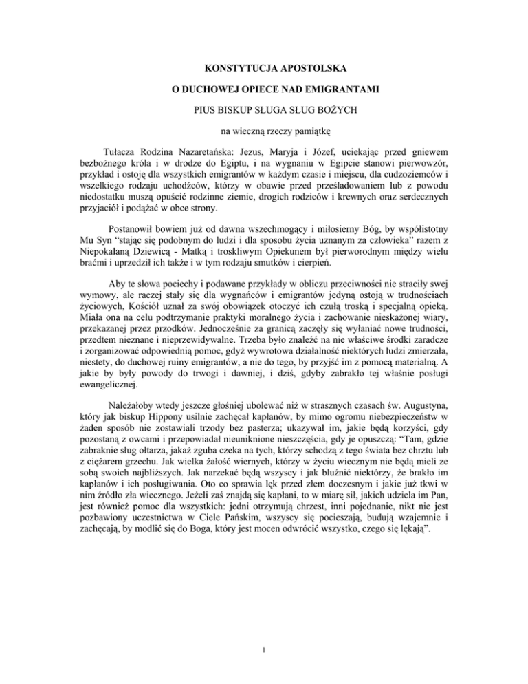 KONSTYTUCJA APOSTOLSKA O DUCHOWEJ OPIECE NAD EMIGRANTAMI PIUS BISKUP SŁUGA SŁUG BOŻYCH na wieczną rzeczy pamiątkę Tułacza Rodzina Nazaretańska: Jezus, Maryja i Józef, uciekając przed gniewem bezbożnego króla i w drodze do Egiptu, i na wygnaniu w Egipcie stanowi pierwowzór, przykład i ostoję dla wszystkich emigrantów w każdym czasie i miejscu, dla cudzoziemców i wszelkiego rodzaju uchodźców, którzy w obawie przed prześladowaniem lub z powodu niedostatku muszą opuścić rodzinne ziemie, drogich rodziców i krewnych oraz serdecznych przyjaciół i podążać w obce strony. Postanowił bowiem już od dawna wszechmogący i miłosierny Bóg, by współistotny Mu Syn “stając się podobnym do ludzi i dla sposobu życia uznanym za człowieka” razem z Niepokalaną Dziewicą - Matką i troskliwym Opiekunem był pierworodnym między wielu braćmi i uprzedził ich także i w tym rodzaju smutków i cierpień. Aby te słowa pociechy i podawane przykłady w obliczu przeciwności nie straciły swej wymowy, ale raczej stały się dla wygnańców i emigrantów jedyną ostoją w trudnościach życiowych, Kościół uznał za swój obowiązek otoczyć ich czułą troską i specjalną opieką. Miała ona na celu podtrzymanie praktyki moralnego życia i zachowanie nieskażonej wiary, przekazanej przez przodków. Jednocześnie za granicą zaczęły się wyłaniać nowe trudności, przedtem nieznane i nieprzewidywalne. Trzeba było znaleźć na nie właściwe środki zaradcze i zorganizować odpowiednią pomoc, gdyż wywrotowa działalność niektórych ludzi zmierzała, niestety, do duchowej ruiny emigrantów, a nie do tego, by przyjść im z pomocą materialną. A jakie by były powody do trwogi i dawniej, i dziś, gdyby zabrakło tej właśnie posługi ewangelicznej. Należałoby wtedy jeszcze głośniej ubolewać niż w strasznych czasach św. Augustyna, który jak biskup Hippony usilnie zachęcał kapłanów, by mimo ogromu niebezpieczeństw w żaden sposób nie zostawiali trzody bez pasterza; ukazywał im, jakie będą korzyści, gdy pozostaną z owcami i przepowiadał nieuniknione nieszczęścia, gdy je opuszczą: “Tam, gdzie zabraknie sług ołtarza, jakaż zguba czeka na tych, którzy schodzą z tego świata bez chrztu lub z ciężarem grzechu. Jak wielka żałość wiernych, którzy w życiu wiecznym nie będą mieli ze sobą swoich najbliższych. Jak narzekać będą wszyscy i jak bluźnić niektórzy, że brakło im kapłanów i ich posługiwania. Oto co sprawia lęk przed złem doczesnym i jakie już tkwi w nim źródło zła wiecznego. Jeżeli zaś znajdą się kapłani, to w miarę sił, jakich udziela im Pan, jest również pomoc dla wszystkich: jedni otrzymują chrzest, inni pojednanie, nikt nie jest pozbawiony uczestnictwa w Ciele Pańskim, wszyscy się pocieszają, budują wzajemnie i zachęcają, by modlić się do Boga, który jest mocen odwrócić wszystko, czego się lękają”. 1 Część I MACIERZYŃSKA OPIEKA KOŚCIOŁA NAD EMIGRANTAMI Kościół święty, jak Matka, kierując się żarliwą miłością dusz, starał się wypełnić zadanie powszechnego planu zbawczego, powierzonego Mu przez Chrystusa. Prowadził więc duszpasterstwo również nad cudzoziemcami, przybyszami, wygnańcami i wszystkimi emigrantami. Czynił to za pośrednictwem kapłanów, którzy gorliwie umacniali w wierze wyznawców Chrystusa węzłami miłości przez rozdawanie łaski charyzmatów i głoszenie słowa Bożego. Miło jest więc przytoczyć zasługi Kościoła w tej dziedzinie; krótko jednak wspomnimy o dawnych wiekach, szerzej zaś omówimy czasy nam najbliższe. Najpierw przypomnimy zdarzenie z życia św. Ambrożego, sławnego Pasterza Mediolańskiego i słowa, jakie wypowiedział po klęsce cesarza Walensa pod Hadrianopolem, gdy celem wykupu jeńców uprowadzonych do niewoli nie szczędził nawet naczyń kościelnych, byle tylko uchronić biedaków od szkód materialnych i wyrwać ich z niebezpieczeństw, które jeszcze bardziej zagrażały życiu duchowemu: “Któż mógłby być tak niemiłosierny - powiada św. Ambroży - tak okrutny, nieczuły, żeby nie podobało mu się wykupywanie ludzi od śmierci, niewiast od gorszego niż śmierć zhańbienia przez barbarzyńców, ratowanie młodzieńców i chłopców, a nawet dzieci od zarazy bałwochwalstwa, którym kalały swe dusze z obawy przed śmiercią. Jakkolwiek dokonaliśmy tego nie bez pewnej słuszności, to wobec ludu postąpiliśmy w ten sposób, że przyznaliśmy się do tego i oświadczyliśmy, iż należało raczej dusze Panu zachować niż złoto”. Chwałą też okryte są gorliwe zabiegi biskupów i kapłanów, którzy mieszkańcom nowych krajów wraz z łaską wiary przyswajali zasady współżycia ludzkiego, a niecywilizowanych najeźdźców, pozyskanych jednocześnie dla religii chrześcijańskiej i dla kultury, usiłowali przyzwyczaić do współżycia z tubylcami. Z wdzięcznością wspominamy również sławne zakony, powołane do wykupu niewolników; ich członkowie, płonąc miłością Chrystusową, nie wahali się znieść niemało cierpień dla uwięzionych braci, byle tylko dla wielu z nich uzyskać wolność, a innym móc przynajmniej przynieść pociechę. Po odkryciu zaś nowych obszarów na drugiej półkuli nie brakło kapłanów Chrystusowych, którzy udawali się tam w ślad za kolonizatorami. Pełni gorliwości czuwali oni nad tym, by ci nie porzucali obyczajów chrześcijańskich i nie unosili się pychą z powodu zdobyczy terytorialnych. Pracując jako misjonarze, głosili Ewangelię ludności tubylczej nie znającej jeszcze wcale światła Bożego i uczyli jednocześnie, że tych ludzi należy uważać za braci. Nie można też pominąć milczeniem tego, że gdy wbrew zasadom etyki zabierano Murzynów z ich domów i wystawiano na sprzedaż publiczną w portach Ameryki, Europy, przedstawiciele Kościoła dokładali starań, by ratować ich z krytycznej sytuacji i pozyskać Chrystusow