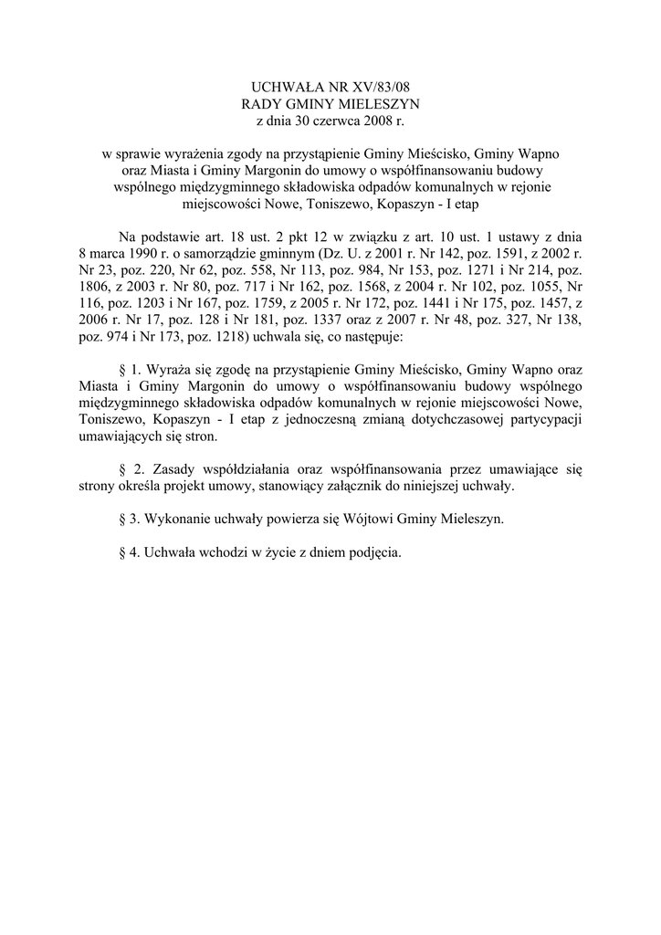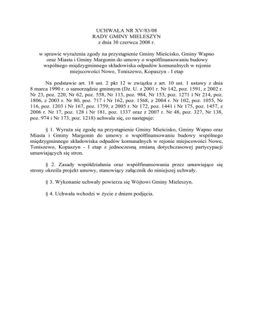 UCHWAŁA NR XV/83/08 RADY GMINY MIELESZYN z dnia 30 czerwca 2008 r. w sprawie wyrażenia zgody na przystąpienie Gminy Mieścisko, Gminy Wapno oraz Miasta i Gminy Margonin do umowy o współfinansowaniu budowy wspólnego międzygminnego składowiska odpadów komunalnych w rejonie miejscowości Nowe, Toniszewo, Kopaszyn - I etap Na podstawie art. 18 ust. 2 pkt 12 w związku z art. 10 ust. 1 ustawy z dnia 8 marca 1990 r. o samorządzie gminnym (Dz. U. z 2001 r. Nr 142, poz. 1591, z 2002 r. Nr 23, poz. 220, Nr 62, poz. 558, Nr 113, poz. 984, Nr 153, poz. 1271 i Nr 214, poz. 1806, z 2003 r. Nr 80, poz. 717 i Nr 162, poz. 1568, z 2004 r. Nr 102, poz. 1055, Nr 116, poz. 1203 i Nr 167, poz. 1759, z 2005 r. Nr 172, poz. 1441 i Nr 175, poz. 1457, z 2006 r. Nr 17, poz. 128 i Nr 181, poz. 1337 oraz z 2007 r. Nr 48, poz. 327, Nr 138, poz. 974 i Nr 173, poz. 1218) uchwala się, co następuje: § 1. Wyraża się zgodę na przystąpienie Gminy Mieścisko, Gminy Wapno oraz Miasta i Gminy Margonin do umowy o współfinansowaniu budowy wspólnego międzygminnego składowiska odpadów komunalnych w rejonie miejscowości Nowe, Toniszewo, Kopaszyn - I etap z jednoczesną zmianą dotychczasowej partycypacji umawiających się stron. § 2. Zasady współdziałania oraz współfinansowania przez umawiające się strony określa projekt umowy, stanowiący załącznik do niniejszej uchwały. § 3. Wykonanie uchwały powierza się Wójtowi Gminy Mieleszyn. § 4. Uchwała wchodzi w życie z dniem podjęcia. Załącznik do uchwały Nr XV/83/08 Rady Gminy Mieleszyn z dnia 30 czerwca 2008 r. UMOWA zawarta w dniu .... .......... 2008 r. pomiędzy Gminą Miejską Wągrowiec, Gminą Wągrowiec, Miastem i Gminą Skoki, Gminą Mieleszyn, Miastem i Gminą Szamocin, Gminą Chodzież, Gminą Miejską Chodzież, Gminą Budzyń oraz Gminą Mieścisko, Gminą Wapno, Miastem i Gminą Margonin w sprawie współfinansowania przez Gminę Mieścisko, Gminę Wapno i Miasto i Gminę Margonin budowy wspólnego międzygminnego składowiska odpadów komunalnych w rejonie miejscowości NoweToniszewo-Kopaszyn - I etap. Gmina Miejska Wągrowiec reprezentowana przez Burmistrza Miasta Wągrowiec w osobie Stanisława Wilczyńskiego Gmina Miejska Chodzież reprezentowana przez Burmistrza Miasta Chodzież w osobie Jacka Gursza Gmina Wągrowiec reprezentowana przez Wójta Gminy Wągrowiec w osobie Przemysława Majchrzaka Miasto i Gmina Skoki reprezentowane przez Burmistrza Miasta i Gminy Skoki w osobie Tadeusza Kłosa Gmina Mieleszyn reprezentowana przez Wójta Gminy Mieleszyn w osobie Janusza Kamińskiego Miasto i Gmina Szamocin reprezentowana przez Burmistrza Miasta i Gminy Szamocin w osobie Eugeniusza Kucnera Gmina Chodzież reprezentowana przez Wójta Gminy w osobie Zbigniewa Salwy Gmina Budzyń reprezentowana przez Wójta Gminy w osobie Marcina Sokołowskiego Gmina Mieścisko reprezentowana przez Wójta Gminy Mieścisko w osobie Andrzeja Banaszyńskiego Gmina Wapno reprezentowana przez Wójta Gminy Wapno w osobie Andrzeja Bąka Miasto i Gmina Margonin reprezentowana przez Burmistrza Miasta i Gminy Margonin w osobie Leszka Łochowicza postanawiają, co następuje: § 1 Gmina Miejska Wągrowiec, Gmina Miejska Chodzież, Gmina Wągrowiec, Miasto i Gmina Skoki, Gmina Mieleszyn, Miasto i Gmina Szamocin, Gmina Chodzież i Gmina Budzyń wyrażają zgodę na współfinansowanie, poprzez zwrot w 2008 r. przez Gminę Mieścisko, Gminę Wapno oraz Miasto i Gminę Margonin (w latach 2008 – 2010) poniesionych kosztów budowy wspólnego międzygminnego składowiska stałych odpadów komunalnych w rejonie Nowe-Toniszewo–Kopaszyn – I etap oddanego do użytku 30 czerwca 2000 roku. §2 W zamian za zwrot poniesionych kosztów, o którym mowa w § 1 Gmina Miejska Wągrowiec, Gmina Miejska Chodzież, Gmina Wągrowiec, Miasto i Gmina Skoki, Gmina Mieleszyn, Miasto i Gmina Szamocin, Gmina Chodzież i Gmina Budzyń zapewniają Gminie Mieścisko, Gminie Wapno oraz Miastu i Gminie Margonin: 1. prawo składowania, segregacji i utylizacji odpadów do czasu zakończenia eksploatacji składowiska 2. wysokość opłat za składowanie stałych odpadów komunalnych na poziomie stosowanym dla wszystkich osób fizycznych i prawnych składających odpady na tym składowisku. §3 1. Gmina Mieścisko zobowiązuje się do zabezpieczenia kwoty 104.057,00 zł w budżecie na 2008 rok i dokonania jej wpłaty w terminie do 30.06.2008 r. - rachunek rozliczeniowy inwestora wiodącego dla inwestycji tj. Gminy Miejskiej Wągrowiec: Bank Zachodni WBK 1 Oddział w Wągrowcu, nr 62 1090 1317 0000 0001 0595 3792. 2. Gmina Wapno zobowiązuje się do zabezpieczenia kwoty 5.145,00 zł w budżecie na 2008 rok i dokonania jej wpłaty w terminie do 30.06.2008 r. - na rachunek rozliczeniowy inwestora wiodącego dla inwestycji tj. Gminy Miejskiej Wągrowiec: Bank Zachodni WBK 1 Oddział w Wągrowcu, nr 62 1090 1317 0000 0001 0595 3792. 3. Miasto i Gmina Margonin zobowiązuje się do zabezpieczenia kwoty 106.800,00 zł w budżecie na 2008-2010 rok i dokonania wpłaty w trzech ratach: w terminie do 30.06.2008 r. – 35 600,00 zł, w terminie do 30.06.2009 r. – 35 600,00 zł oraz do dnia 30.06.2010 r. pozostałej kwoty – 35 600,00 zł, na rachunek rozliczeniowy inwestora wiodącego dla inwestycji tj. Gminy Miejskiej Wągrowiec: Bank Zachodni WBK 1 Oddział w Wągrowcu, nr 62 1090 1317 0000 0001 0595 3792. §4 W sprawach nie unormowanych w niniejszej umowie mają zastosowanie przepisy Kodeksu Cywilnego. §5 Wszelkie spory wynikłe na tle realizacji niniejszej umowy strony mogą poddać pod rozstrzygnięcie właściwego organu orzekającego. §6 Niniejsza umowa obowiązuje z dniem podpisania. §7 Umowę niniejszą sporządzono w 24 jednobrzmiących egzemplarzach z tego po 2 egzemplarze dla każdej ze stron i 2 egzemplarze dla Międzygminnego Składowiska Odpadów Komunalnych Spółka z o.o. w Wągrowcu. UZASADNIENIE do uchwały Nr XV/83/08 Rady Gminy Mieleszyn z dnia 30 czerwca 2008 r. Gmina Miej