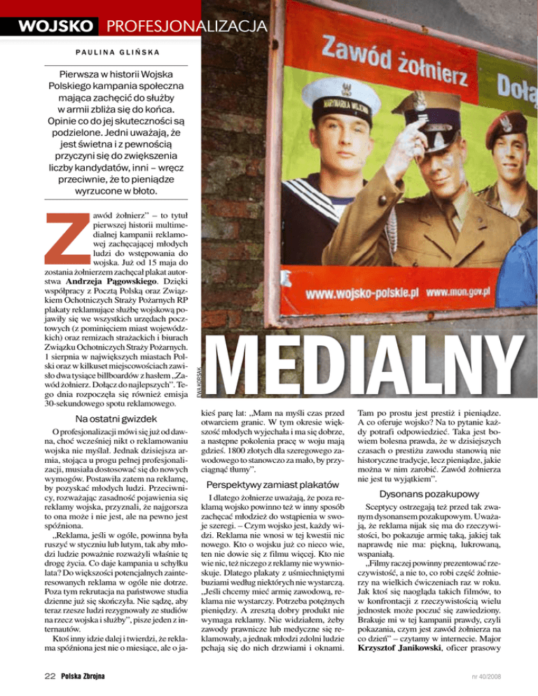 WOJSKO PROFESJONALIZACJA PAULINA GLIŃSKA Pierwsza w historii Wojska Polskiego kampania społeczna mająca zachęcić do służby w armii zbliża się do końca. Opinie co do jej skuteczności są podzielone. Jedni uważają, że jest świetna i z pewnością przyczyni się do zwiększenia liczby kandydatów, inni – wręcz przeciwnie, że to pieniądze wyrzucone w błoto. Na ostatni gwizdek O profesjonalizacji mówi się już od dawna, choć wcześniej nikt o reklamowaniu wojska nie myślał. Jednak dzisiejsza armia, stojąca u progu pełnej profesjonalizacji, musiała dostosować się do nowych wymogów. Postawiła zatem na reklamę, by pozyskać młodych ludzi. Przeciwnicy, rozważając zasadność pojawienia się reklamy wojska, przyznali, że najgorsza to ona może i nie jest, ale na pewno jest spóźniona. „Reklama, jeśli w ogóle, powinna była ruszyć w styczniu lub lutym, tak aby młodzi ludzie poważnie rozważyli właśnie tę drogę życia. Co daje kampania u schyłku lata? Do większości potencjalnych zainteresowanych reklama w ogóle nie dotrze. Poza tym rekrutacja na państwowe studia dzienne już się skończyła. Nie sądzę, aby teraz rzesze ludzi rezygnowały ze studiów na rzecz wojska i służby”, pisze jeden z internautów. Ktoś inny idzie dalej i twierdzi, że reklama spóźniona jest nie o miesiące, ale o ja22 Polska Zbrojna MEDIALNY EWA KORSAK awód żołnierz” – to tytuł pierwszej historii multimedialnej kampanii reklamowej zachęcającej młodych ludzi do wstępowania do wojska. Już od 15 maja do zostania żołnierzem zachęcał plakat autorstwa Andrzeja Pągowskiego. Dzięki współpracy z Pocztą Polską oraz Związkiem Ochotniczych Straży Pożarnych RP plakaty reklamujące służbę wojskową pojawiły się we wszystkich urzędach pocztowych (z pominięciem miast wojewódzkich) oraz remizach strażackich i biurach Związku Ochotniczych Straży Pożarnych. 1 sierpnia w największych miastach Polski oraz w kilkuset miejscowościach zawisło dwa tysiące billboardów z hasłem „Zawód żołnierz. Dołącz do najlepszych”. Tego dnia rozpoczęła się również emisja 30-sekundowego spotu reklamowego. kieś parę lat: „Mam na myśli czas przed otwarciem granic. W tym okresie większość młodych wyjechała i ma się dobrze, a następne pokolenia pracę w woju mają gdzieś. 1800 złotych dla szeregowego zawodowego to stanowczo za mało, by przyciągnąć tłumy”. Perspektywy zamiast plakatów I dlatego żołnierze uważają, że poza reklamą wojsko powinno też w inny sposób zachęcać młodzież do wstąpienia w swoje szeregi. – Czym wojsko jest, każdy widzi. Reklama nie wnosi w tej kwestii nic nowego. Kto o wojsku już co nieco wie, ten nie dowie się z filmu więcej. Kto nie wie nic, też niczego z reklamy nie wywnioskuje. Dlatego plakaty z uśmiechniętymi buziami według niektórych nie wystarczą. „Jeśli chcemy mieć armię zawodową, reklama nie wystarczy. Potrzeba potężnych pieniędzy. A zresztą dobry produkt nie wymaga reklamy. Nie widziałem, żeby zawody prawnicze lub medyczne się reklamowały, a jednak młodzi zdolni ludzie pchają się do nich drzwiami i oknami. Tam po prostu jest prestiż i pieniądze. A co oferuje wojsko? Na to pytanie każdy potrafi odpowiedzieć. Taka jest bowiem bolesna prawda, że w dzisiejszych czasach o prestiżu zawodu stanowią nie historyczne tradycje, lecz pieniądze, jakie można w nim zarobić. Zawód żołnierza nie jest tu wyjątkiem”. Dysonans pozakupowy Sceptycy ostrzegają też przed tak zwanym dysonansem pozakupowym. Uważają, że reklama nijak się ma do rzeczywistości, bo pokazuje armię taką, jakiej tak naprawdę nie ma: piękną, lukrowaną, wspaniałą. „Filmy raczej powinny prezentować rzeczywistość, a nie to, co robi część żołnierzy na wielkich ćwiczeniach raz w roku. Jak ktoś się naogląda takich filmów, to w konfrontacji z rzeczywistością wielu jednostek może poczuć się zawiedziony. Brakuje mi w tej kampanii prawdy, czyli pokazania, czym jest zawód żołnierza na co dzień” – czytamy w internecie. Major Krzysztof Janikowski, oficer prasowy nr 40/2008 | | | | | | | | | | | US DOD ZAPIS FORUM NA CELOWNIKU WOJSKO PORADY PO SŁUŻBIE HISTORIA MILITARIA ŚWIAT PRASA KULISY TO I OWO MILIONY NA PROMOCJĘ W USA wojsko wydaje miliony dolarów na akcje promocyjne – wie bowiem, że stały napływ rekrutów to podstawa funkcjonowania zawodowych sił zbrojnych. woczesność, stabilizacja i prestiż. Tym, co mogłoby zainteresować młodych ludzi, a o czym reklama nawet nie wspomina, jest fakt, że aby dostać się do wojska, nie trzeba mieć żadnego doświadczenia. WABIK Wojewódzkiego Sztabu Wojskowego w Krakowie, przyznaje, że zdarzają się kandydaci, którzy do służby wojskowej podchodzą z niedowierzaniem. „Wynika to pewnie z przeświadczenia, że do wojska bardzo trudno się dostać, że trzeba mieć jakieś wyjątkowe zdolności i być supermanem. Częściowy brak zaufania do akcji promocyjnej bierze się także z nieufności ludzi do różnego rodzaju kampanii reklamowych. Tam zwykle przedstawia się wszystko w samych superlatywach, ale zawsze jest jakieś drugie dno. Tak samo ludzie podchodzą do wojskowej kampanii reklamowej – szukają haczyka”. Zwolennicy bronią jednak tej formy reklamy, którą przedstawia 30-sekundowy spot emitowany w telewizji. „To w założeniu ma być promowanie zawodu – reklama. Proszę o przykład jednej reklamy, która oparta jest na innej podstawie niż ukazanie czegoś w sposób maksymalnie atrakcyjny dla docelowego odbiorcy. Reklama bowiem już z samego założenia ma zachęcać, a nie odwrotnie. Trudno, by znalazły się w niej informanr 40/2008 CZY REKLAMA SKUSI? „Profesjonalna armia – o jej sile decydują wyjątkowi ludzie. Każdego dnia lepsi i bardziej doświadczeni. Zawsze potrzebni. Honor, wyzwanie, braterstwo. Rób to, co kochasz. Żyj z pasją. Zawód żołnierz. Dołącz do najlepszyc