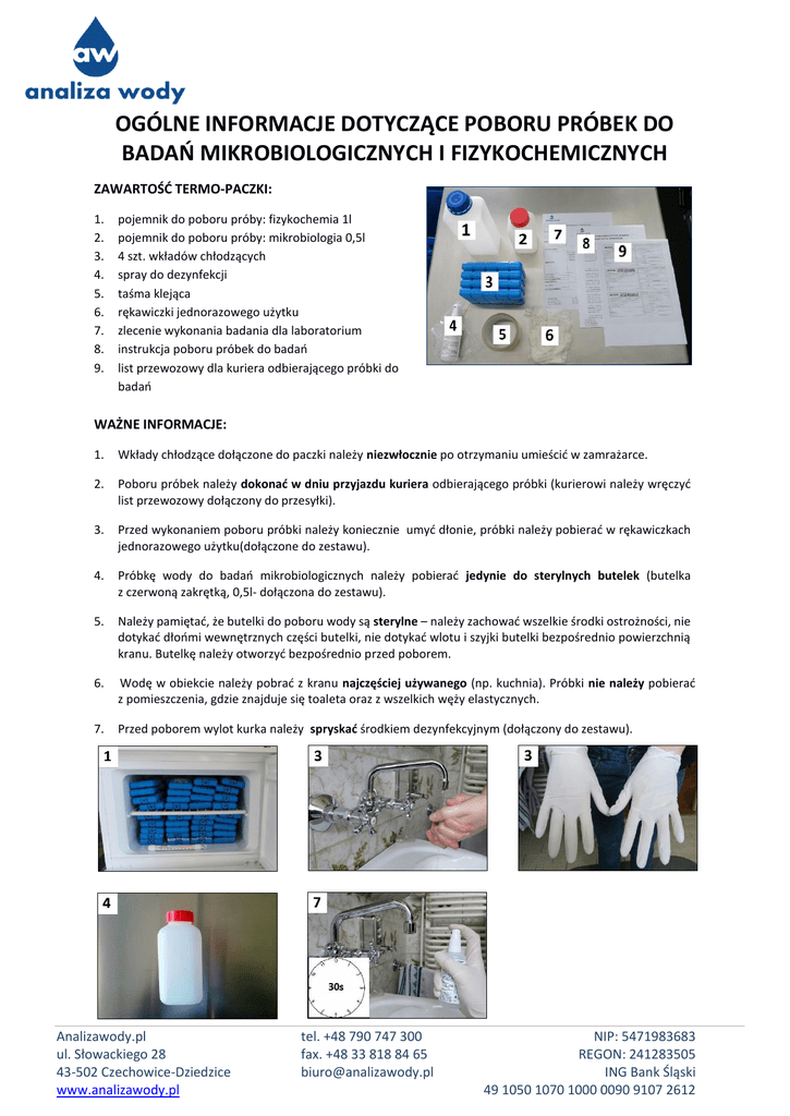 OGÓLNE INFORMACJE DOTYCZĄCE POBORU PRÓBEK DO BADAŃ MIKROBIOLOGICZNYCH I FIZYKOCHEMICZNYCH ZAWARTOŚĆ TERMO-PACZKI: 1. 2. 3. 4. 5. 6. 7. 8. 9. pojemnik do poboru próby: fizykochemia 1l pojemnik do poboru próby: mikrobiologia 0,5l 4 szt. wkładów chłodzących spray do dezynfekcji taśma klejąca rękawiczki jednorazowego użytku zlecenie wykonania badania dla laboratorium instrukcja poboru próbek do badań list przewozowy dla kuriera odbierającego próbki do badań WAŻNE INFORMACJE: 1. Wkłady chłodzące dołączone do paczki należy niezwłocznie po otrzymaniu umieścić w zamrażarce. 2. Poboru próbek należy dokonać w dniu przyjazdu kuriera odbierającego próbki (kurierowi należy wręczyć list przewozowy dołączony do przesyłki). 3. Przed wykonaniem poboru próbki należy koniecznie umyć dłonie, próbki należy pobierać w rękawiczkach jednorazowego użytku(dołączone do zestawu). 4. Próbkę wody do badań mikrobiologicznych należy pobierać jedynie do sterylnych butelek (butelka z czerwoną zakrętką, 0,5l- dołączona do zestawu). 5. Należy pamiętać, że butelki do poboru wody są sterylne – należy zachować wszelkie środki ostrożności, nie dotykać dłońmi wewnętrznych części butelki, nie dotykać wlotu i szyjki butelki bezpośrednio powierzchnią kranu. Butelkę należy otworzyć bezpośrednio przed poborem. 6. Wodę w obiekcie należy pobrać z kranu najczęściej używanego (np. kuchnia). Próbki nie należy pobierać z pomieszczenia, gdzie znajduje się toaleta oraz z wszelkich węży elastycznych. 7. Przed poborem wylot kurka należy spryskać środkiem dezynfekcyjnym (dołączony do zestawu). Analizawody.pl ul. Słowackiego 28 43-502 Czechowice-Dziedzice www.analizawody.pl tel. +48 790 747 300 fax. +48 33 818 84 65 [email protected] NIP: 5471983683 REGON: 241283505 ING Bank Śląski 49 1050 1070 1000 0090 9107 2612 POBIERANIE PRÓBEK WODY DO BADAŃ MIKROBIOLOGICZNYCH (butelka z czerwoną zakrętką 0,5l) 1. Przygotuj wszystkie potrzebne rzeczy do poboru próbki. (termo-paczka, rękawiczki, środek dezynfekcyjny, butelkę, wkłady chłodzące). 2. Odpuść zimną wodę z kranu przez ok 5 minut średnim strumieniem wody, tak aby woda nie była zbyt wzburzona i nie powodowała zrywania zanieczyszczeń z rury. 3. Końcówkę kranu spryskaj środkiem dezynfekcyjnym, odczekaj 30 sekund. 4. Odpuść wodę z kranu przez ok 2 minuty. 5. Odkręć butelkę i podłóż pod kran. Napełnij ją powolnym strumieniem do około 4/5 objętości (ok 400ml) i niezwłocznie zamknij. 6. Opisz próbkę(dane miejsca poboru: adres, miejsce skąd została pobrana próbka np. kuchnia). 7. Umieść próbkę w termo-paczce wraz z zamrożonymi wkładami chłodzącymi oraz środkiem dezynfekcyjnym. 8. Kurierowi odbierającemu próbki do badań wręcz list przewozowy dołączony do termo-paczki. Analizawody.pl ul. Słowackiego 28 43-502 Czechowice-Dziedzice www.analizawody.pl tel. +48 790 747 300 fax. +48 33 818 84 65 [email protected] NIP: 5471983683 REGON: 241283505 ING Bank Śląski 49 1050 1070 1000 0090 9107 2612 POBÓR PRÓBY DO BADAŃ FIZYKOCHEMICZNYCH ( butelka z niebieską lub zieloną zakrętką, 1l) Uwaga: Pobór próbki do badania fizykochemicznego należy dokonać po poborze próby do badania mikrobiologicznego. 1. Butelkę przed poborem minimum 2 krotnie napełnij wodą i opróżnij. 2. Po wypłukaniu butelkę napełnij spokojnym strumieniem wody, tak aby woda sięgała do samej góry butelki i delikatnie się wylewała. Butelkę szczelnie zakręć (zapobiegnie to wylaniu się próbki wody podczas transportu). W butelce nie powinno być żadnych pęcherzyków powietrza. 3. Butelki należy podpisać (dane miejsca poboru: adres, miejsce skąd została pobrana próbka np. kuchnia). 4. Umieść butelkę z próbką wody w termo-paczce. 5. W termo-paczce umieść wkłady chłodzące, środek dezynfekcyjny oraz zlecenie badania, karton zaklej taśmą. 6. Kurierowi odbierającemu próbki do badań wręcz list przewozowy dołączony do termo-paczki. W razie pytań proszę o kontakt pod numerem 790 747 300 Z poważaniem mgr Łukasz Zyskowski Analizawody.pl ul. Słowackiego 28 43-502 Czechowice-Dziedzice www.analizawody.pl tel. +48 790 747 300 fax. +48 33 818 84 65 [email protected] NIP: 5471983683 REGON: 241283505 ING Bank Śląski 49 1050 1070 1000 0090 9107 2612