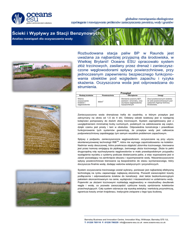Ścieki i Wypływy ze Stacji Benzynowych Analiza rozwiązań dla oczyszczania wody Rozbudowana stacja paliw BP w Raunds jest uważana za najbardziej przyjazną dla środowiska, w Wielkiej Brytanii! Oceans ESU opracowało system złóż trzcinowych, zasilany przez drenaż i zanieczyszczone węglowodorami spływy powierzchniowe, przy jednoczesnym zapewnieniu bezpiecznego funkcjonowania obiektów pod względem zapachu i ryzyka skażenia. Oczyszczona woda jest odprowadzana do strumienia. Przegląd Rodzaj ścieków Wtórne oczyszczanie ścieków i węglowodorów Powierzchnia 900m2 Obciążenie Obniżenie poziomu BZT, zawiesin i amoniaku, oraz usunięcie węglowodorów ropopochdnych Uwagi Zrzut przetworzonych ścieków do wód powierzchniowych pod nadzorem Agencji Ochrony Środowiska. Zanieczyszczona woda drenażowa trafia do osadnika, w którym przepływ jest zatrzymany na okres od 1,5 do 4 dni. Odstany odciek ściekowy jest w następnej kolejności pompowany do dwóch złoży trzcinowych. System zaprojektowany jest z uwzględnieniem minimalnej liczby ruchomych, podatnych na zablokowanie się części, dzięki czemu jest prosty i tani w obsłudze. Odpowiednia konstrukcja i prawidłowe funkcjonowanie tych systemów gwarantują, że przepływ wody jest całkowicie podpowierzchniowy zapobiegając tym samym wszelkim problemom zapachowym. Spływy z podjazdu, zanieczyszczone węglowodorami, oczyszczane są przy użyciu skonteneryzowanej technologii RIBTM, która nie wymaga zapotrzebowania na kolektor. Nadmiar wody deszczowej, która przekracza objętość zbiornika trzcinowego, kierowana jest przez komorę omijającą do płytkiego, żwirowego złoża trzcinowego. Złoże to pełni drugorzędną rolę wychwytywania węglowodorów w mało prawdopodobnym przypadku wystąpienia wycieku z cysterny podczas dostarczania paliw, a więc wyposażone jest w zawór pozwalający na zamknięcie obszaru i wypompowanie wody. Niezanieczyszczone spływy powierzchniowe kierowane są bezpośrednio do stawu wyrównawczego, który doczyszcza finalnie wodę, dodając walorów estetycznych i przyrodniczych. System oczyszczania trzcinowego został wybrany, ponieważ jest najbardziej efektywną technologią na rynku zapewniając najlepszą ekonomię. Pozwolił zaoszczędzić koszty podłączenia i odprowadzania ścieków do kanalizacji. Jest także bezkonkurencyjnym pakietem skoncentrowanym na cenie, wydajności i niezawodności w uzdatnianiu wody. Pojemniki ze złożami trzcinowymi rozkładają węglowodory w nieszkodliwy dwutlenek węgla i wodę, co pozwala zaoszczędzić cykliczne koszty opróżniania kolektorów przechwytujących. Cały system odznacza się wysoką estetyką i wartością przyrodniczą, ogranicza koszty zmian krajobrazu, tradycyjnie związane z tego typu budową. Barnsley Business and Innovation Centre, Innovation Way, Wilthorpe, Barnsley S75 1JL. T: 01226 785116 F: 01226 786229 [email protected] www.oceans-esu.co.uk