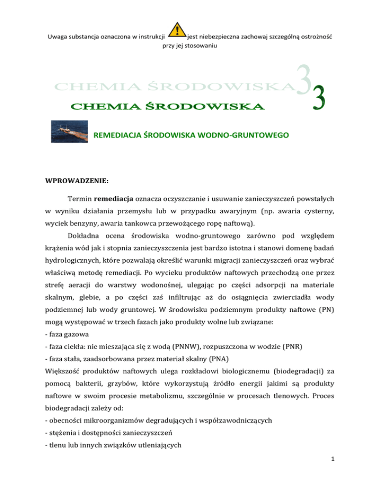 Uwaga substancja oznaczona w instrukcji jest niebezpieczna zachowaj szczególną ostrożność przy jej stosowaniu REMEDIACJA ŚRODOWISKA WODNO-GRUNTOWEGO WPROWADZENIE: Termin remediacja oznacza oczyszczanie i usuwanie zanieczyszczeń powstałych w wyniku działania przemysłu lub w przypadku awaryjnym (np. awaria cysterny, wyciek benzyny, awaria tankowca przewożącego ropę naftową). Dokładna ocena środowiska wodno-gruntowego zarówno pod względem krążenia wód jak i stopnia zanieczyszczenia jest bardzo istotna i stanowi domenę badań hydrologicznych, które pozwalają określić warunki migracji zanieczyszczeń oraz wybrać właściwą metodę remediacji. Po wycieku produktów naftowych przechodzą one przez strefę aeracji do warstwy wodonośnej, ulegając po części adsorpcji na materiale skalnym, glebie, a po części zaś infiltrując aż do osiągnięcia zwierciadła wody podziemnej lub wody gruntowej. W środowisku podziemnym produkty naftowe (PN) mogą występować w trzech fazach jako produkty wolne lub związane: - faza gazowa - faza ciekła: nie mieszająca się z wodą (PNNW), rozpuszczona w wodzie (PNR) - faza stała, zaadsorbowana przez materiał skalny (PNA) Większość produktów naftowych ulega rozkładowi biologicznemu (biodegradacji) za pomocą bakterii, grzybów, które wykorzystują źródło energii jakimi są produkty naftowe w swoim procesie metabolizmu, szczególnie w procesach tlenowych. Proces biodegradacji zależy od: - obecności mikroorganizmów degradujących i współzawodniczących - stężenia i dostępności zanieczyszczeń - tlenu lub innych związków utleniających 1 Uwaga substancja oznaczona w instrukcji jest niebezpieczna zachowaj szczególną ostrożność przy jej stosowaniu - nutrientów (substancje bogate w następujące pierwiastki: P, N, C, które dodaje się w ilościach 250:10:3 lub 100:10:2, źródłem azotu może być NH4NO3, KNO3, a fosforu: Na3PO4, (NH4)3PO4, K3PO4 - wilgotności gruntu - warunków redox, pH i temperatury W wyniku biodegradacji zachodzi rozkład produktów naftowych wg reakcji: PN Metody unieruchomieniu oczyszczania zanieczyszczeń CO2 + H2O + biomasa środowiska poprzez wodno-gruntowego zastosowanie izolacji polegają lub na likwidacji zanieczyszczeń (różne formy remediacji). Usuwanie zanieczyszczeń może odbywać się w miejscu, gdzie ono powstało – dekontaminacja in-situ (IS) lub innym miejscu poprzez wybieranie gruntu lub odpompowywanie skażonej wody - dekontaminacja ex-situ (ES). Metody remediacji można podzielić na fizykochemiczne: termiczna (RT), ekstrakcyjna (RE), elektroreklamacja (ER) oraz biologiczne: landfarming, zastosowanie bioreaktorów. Remediacja termiczna polega na cieplnej obróbce wybranego gruntu (spalenie PN w temp. powyżej 1300 K, podgrzewanie, piroliza do temperatury 900 K, a następnie spalanie gazu pizolitycznego). Remediacja ekstrakcyjna polega na płukaniu gruntu czyli na przeniesieniu zanieczyszczeń PN do medium płuczącego (woda lub woda z dodatkiem substancji chemicznych). W elektroreklamacji wyróżniamy: elektroosmozę (ruch zanieczyszczonej wody porowej między elektrodami), elektroforezę (ruch cząstek pod działaniem pola elektrycznego) oraz elektrolizę (ruch jonów lub kompleksów między elektrodami). Landfarming polega na umieszczeniu skażonego gruntu PN w warstwach o grubości 0,5-1,5 m na nieprzepuszczalnym podłożu wyposażonym w system drenażowy. Następuje biodegradacja aerobowa PN wspomagana dodatkiem tlenu, nutrientów i wody. Czas trwania landfarmingu wynosi od 1-3 lat. Bioreaktory, w reaktorach specjalnej konstrukcji, zachodzą procesy biodegradacji wspomagane mikroorganizmami i podwyższoną temperaturą. Czas reakcji jest dużo krótszy, 3 doby do miesiąca w zależności od temperatury. 2 Uwaga substancja oznaczona w instrukcji jest niebezpieczna zachowaj szczególną ostrożność przy jej stosowaniu Celem ćwiczenia jest zapoznanie się z metodą remediacji ekstrakcyjnej gruntu zanieczyszczonego produktami naftowymi. Odczynniki: Wodorotlenek potasu, roztwór 10%, detergent, zanieczyszczona gleba Sprzęt laboratoryjny i aparatura pomiarowa: Zlewki o pojemności 400 cm3, cylindry miarowe o objętości 50 cm3, bagietki, rozdzielacz gruszkowy, naczynka wagowe Sposób wykonania Na wadze technicznej odważyć 50 g gruntu skażonego produktami naftowymi i wsypać do zlewki. Następnie dodawać 50 cm3 gorącej wody destylowanej i mieszać bagietką. Zdekantować roztwór z nad osadu. Proces powtórzyć 3-krotnie. Wodę z rozpuszczonymi produktami naftowymi oziębić i przenieść do rozdzielacza. Wytrząsać. Po rozdzieleniu się warstw, warstwę wodną odrzucić, natomiast w warstwie olejowej oznaczyć zawartość, przez zważenie bądź zmierzenie objętości, produktów naftowych. W analogiczny sposób postępować używając jako roztworów ekstrakcyjnych, zamiast gorącej wody destylowanej, gorącą wodę z dodatkiem detergentu oraz gorący roztwór wodorotlenku potasu 10%. W przypadku stosowania zasady lub wody z dodatkiem detergentu do ostatniej ekstrakcji użyć tylko gorącej wody destylowanej. 3 Uwaga substancja oznaczona w instrukcji jest niebezpieczna zachowaj szczególną ostrożność przy jej stosowaniu OPRACOWANIE WYNIKÓW Wyniki oznaczeń przedstawić w postaci tabelki: Rodzaj próby Masa lub objętość produktu naftowego Rodzaj roztworu ekstrakcyjnego Zanieczyszczona Ilość gleba Woda z Gorąca woda dodatkiem detergentu Roztwór KOH 10% Obliczyć zawartość produktu naftowego w gruncie w % mas. przyjmując masę właściwą produktu naftowego PN = 790 kg/m3. Instrukcja opracowana na podstawie: „Fizyczno-chemiczne badanie wody i ścieków”, red. Dojlido J., „Chemia Środowiska” van Loon G.W., Duffy S.J. opracował: B. Krawczyk, R. Juszczak, D. Szczukocki 4