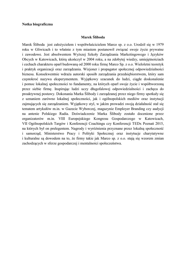 Notka biograficzna Marek Śliboda Marek Śliboda jest założycielem i współwłaścicielem Marco sp. z o.o. Urodził się w 1979 roku w Gliwicach i to właśnie z tym miastem postanowił związać swoje życie prywatne i zawodowe. Jest absolwentem Wyższej Szkoły Zarządzania Marketingowego i Języków Obcych w Katowicach, którą ukończył w 2004 roku, a na zdobytej wiedzy, umiejętnościach i cechach charakteru oparł budowaną od 2000 roku firmę Marco Sp. z o.o. Wieloletni teoretyk i praktyk organizacji oraz zarządzania. Wizjoner i propagator społecznej odpowiedzialności biznesu. Konsekwentnie wdraża autorski sposób zarządzania przedsiębiorstwem, który sam częstokroć nazywa eksperymentem. Wyjątkowy szacunek do ludzi, ciągłe doskonalenie i pomoc lokalnej społeczności to fundamenty, na których oparł swoje życie i współtworzoną przez siebie firmę. Inspirując ludzi uczy długofalowej odpowiedzialności i zachęca do proaktywnej postawy. Dokonania Marka Ślibody i zarządzanej przez niego firmy spotkały się z uznaniem zarówno lokalnej społeczności, jak i ogólnopolskich mediów oraz instytucji zajmujących się zarządzaniem. Wyjątkowy styl, w jakim prowadzi swoją działalność stał się tematem artykułów m.in. w Gazecie Wyborczej, magazynie Employer Branding czy audycji na antenie Polskiego Radia. Doświadczenie Marka Ślibody zostało docenione przez organizatorów m.in. VIII Europejskiego Kongresu Gospodarczego w Katowicach, VII Ogólnopolskich Targów i Konferencji Coachingu czy Konferencji TEDx Poznań 2015, na których był on prelegentem. Nagrody i wyróżnienia przyznane przez lokalną społeczność i samorząd, Ministerstwo Pracy i Polityki Społecznej oraz instytucje charytatywne i kulturalne są dowodem na to, że firmy takie jak Marco sp. z o.o. stają się wzorem zmian zachodzących w sferze gospodarczej i mentalności społeczeństwa.