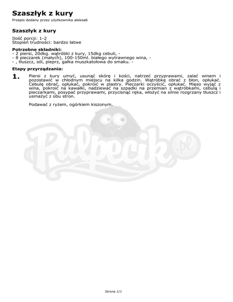 Szaszłyk z kury Przepis dodany przez użytkownika aleksa6 Szaszłyk z kury Ilość porcji: 1-2 Stopień trudności: bardzo łatwe Potrzebne składniki: - 2 piersi, 20dkg. wątróbki z kury, 15dkg cebuli, - 8 pieczarek (małych), 100-150ml. białego wytrawnego wina, - , tłuszcz, sól, pieprz, gałka muszkatołowa do smaku. Etapy przyrządzania: 1. Piersi z kury umyć, usunąć skórę i kości, natrzeć przyprawami, zalać winem i pozostawić w chłodnym miejscu na kilka godzin. Wątróbkę obrać z błon, opłukać. Cebulę obrać, opłukać, pokroić w plastry. Pieczarki oczyścić, opłukać. Mięso wyjąć z wina, pokroić na kawałki, nadziewać na szpadki na przemian z wątróbkami, cebulą i pieczarkami, posypać przyprawami, przycisnąć ręka, włożyć na silnie rozgrzany tłuszcz i usmażyć z obu stron. Podawać z ryżem, ogórkiem kiszonym. Strona 1/1