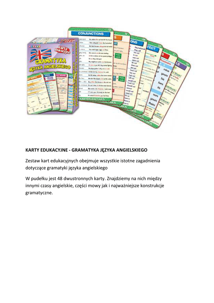 KARTY EDUKACYJNE - GRAMATYKA JĘZYKA ANGIELSKIEGO Zestaw kart edukacyjnych obejmuje wszystkie istotne zagadnienia dotyczące gramatyki języka angielskiego W pudełku jest 48 dwustronnych karty. Znajdziemy na nich między innymi czasy angielskie, części mowy jak i najważniejsze konstrukcje gramatyczne.