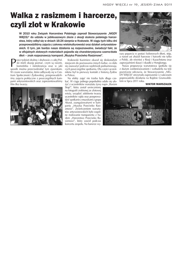 NIGDY WIĘCEJ nr 19, JESIEŃ-ZIMA 2011 Walka z rasizmem i harcerze, czyli zlot w Krakowie P W 2010 roku Związek Harcerstwa Polskiego zaprosił Stowarzyszenie „NIGDY WIĘCEJ” do udziału w jubileuszowym zlocie z okazji stulecia polskiego harcerstwa, który odbył się w dniach 16-24 sierpnia w Krakowie. W ciągu tych kilku dni przeprowadziliśmy zajęcia z zakresu wielokulturowości oraz działań antyrasistowskich. O tym, jak bardzo nasze działania są rozpoznawalne, świadczył fakt, że w oficjalnych zlotowych materiałach pojawiła się charakterystyczna czarno-biała razy poparcia w postaci kolorowych dłoni, stóp, dłoń – znak rozpoznawczy kampanii „Muzyka Przeciwko Rasizmowi”. a nawet ust złożyli harcerze i harcerki nie tylko rzez tydzień druhny i druhowie z całej Polski mieli okazję poznać, czym są rasizm, ksenofobia i nietolerancja oraz w jaki sposób można przeciwdziałać tym zjawiskom. W czasie warsztatów, które odbywały się w Centrum Społeczności Żydowskiej, przeprowadziliśmy zajęcia praktyczne z poszczególnych kampanii antyrasistowskich oraz zaprezentowaliśmy film Bez twarzy. Krakowski Kazimierz okazał się doskonałym miejscem do poznawania innych kultur, co dało się zauważyć podczas wędrówek podsumowujących poszczególne spotkania. Dla części uczestników był to pierwszy kontakt z historią Żydów w Polsce. Na efekty zajęć nie trzeba było długo czekać. W ciągu jednego popołudnia udało się ułożyć z uczestników warsztatu żywy napis „Rasizm Stop!”, który został uwieczniony na fotografii zrobionej ze zlotowej wieży, urządzić zdobienie twarzy uczestników rajdu oraz przeprowadzić spotkanie z muzykami z grupy Akurat, zaangażowanymi w kampanię „Muzyka Przeciwko Rasizmowi”. Zwieńczeniem warsztatów antyrasistowskich było wspólne malowanie transparentu z hasłem „Harcerstwo Przeciwko Rasizmowi”, który zawisł podczas koncertu zespołu. Na banerze wy- z Polski, ale również z Rosji i Kazachstanu oraz zaprzyjaźnieni skauci i skautki z Hongkongu. Nasza propozycja warsztatowa spotkała się z dużym zainteresowaniem i wzbudziła na tyle pozytywne odczucia, że Stowarzyszenie „NIGDY WIĘCEJ” otrzymało zaproszenie i z sukcesem poprowadziło działania na Rajdzie Grunwaldzkim w lipcu 2011 roku. WIKTOR MARSZAŁEK