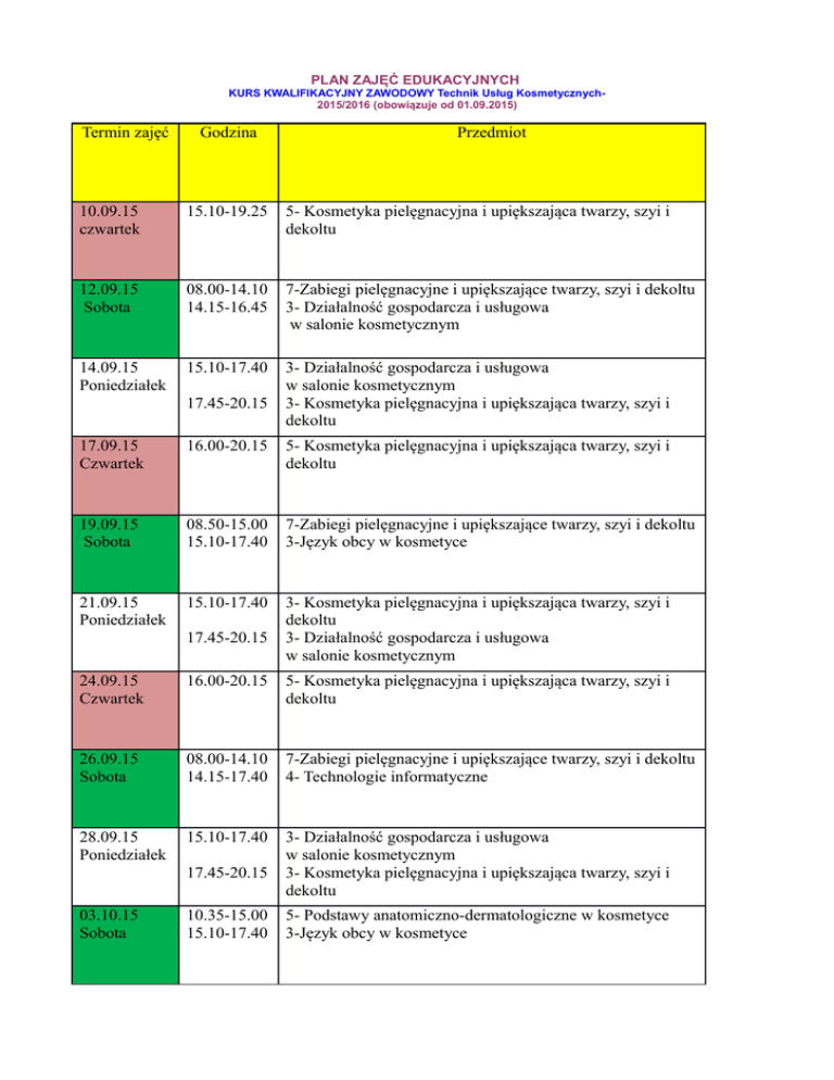 PLAN ZAJĘĆ EDUKACYJNYCH KURS KWALIFIKACYJNY ZAWODOWY Technik Usług Kosmetycznych2015/2016 (obowiązuje od 01.09.2015) Termin zajęć Godzina Przedmiot 10.09.15 czwartek 15.10-19.25 5- Kosmetyka pielęgnacyjna i upiększająca twarzy, szyi i dekoltu 12.09.15 Sobota 08.00-14.10 14.15-16.45 7-Zabiegi pielęgnacyjne i upiększające twarzy, szyi i dekoltu 3- Działalność gospodarcza i usługowa w salonie kosmetycznym 14.09.15 Poniedziałek 15.10-17.40 3- Działalność gospodarcza i usługowa w salonie kosmetycznym 3- Kosmetyka pielęgnacyjna i upiększająca twarzy, szyi i dekoltu 17.45-20.15 17.09.15 Czwartek 16.00-20.15 5- Kosmetyka pielęgnacyjna i upiększająca twarzy, szyi i dekoltu 19.09.15 Sobota 08.50-15.00 15.10-17.40 7-Zabiegi pielęgnacyjne i upiększające twarzy, szyi i dekoltu 3-Język obcy w kosmetyce 21.09.15 Poniedziałek 15.10-17.40 3- Kosmetyka pielęgnacyjna i upiększająca twarzy, szyi i dekoltu 3- Działalność gospodarcza i usługowa w salonie kosmetycznym 17.45-20.15 24.09.15 Czwartek 16.00-20.15 5- Kosmetyka pielęgnacyjna i upiększająca twarzy, szyi i dekoltu 26.09.15 Sobota 08.00-14.10 14.15-17.40 7-Zabiegi pielęgnacyjne i upiększające twarzy, szyi i dekoltu 4- Technologie informatyczne 28.09.15 Poniedziałek 15.10-17.40 3- Działalność gospodarcza i usługowa w salonie kosmetycznym 3- Kosmetyka pielęgnacyjna i upiększająca twarzy, szyi i dekoltu 17.45-20.15 03.10.15 Sobota 10.35-15.00 15.10-17.40 5- Podstawy anatomiczno-dermatologiczne w kosmetyce 3-Język obcy w kosmetyce 05.10.15 Poniedziałek 15.10-17.40 17.45-20.15 3- Kosmetyka pielęgnacyjna i upiększająca twarzy, szyi i dekoltu 3- Działalność gospodarcza i usługowa w salonie kosmetycznym 10.10.15 Sobota 08.00-14.10 7-Zabiegi pielęgnacyjne i upiększające twarzy, szyi i dekoltu 12.10.15 Poniedziałek 15.10-17.40 3- Działalność gospodarcza i usługowa w salonie kosmetycznym 3- Kosmetyka pielęgnacyjna i upiększająca twarzy, szyi i dekoltu 17.45-20.15 17.10.15 Sobota 08.00-14.10 7-Zabiegi pielęgnacyjne i upiększające twarzy, szyi i dekoltu 19.10.15 Poniedziałek 15.10-17.40 3- Kosmetyka pielęgnacyjna i upiększająca twarzy, szyi i dekoltu 3 - Podstawy anatomiczno-dermatologiczne w kosmetyce 17.45-20.15 24.10.15 Sobota 08.00-15.00 8-Zabiegi pielęgnacyjne i upiększające twarzy, szyi i dekoltu 26.10.15 Poniedziałek 15.10-17.40 17.45-20.15 3 - Podstawy anatomiczno-dermatologiczne w kosmetyce 3- Kosmetyka pielęgnacyjna i upiększająca twarzy, szyi i dekoltu 31.10.15 Sobota 09.45-11.20 2- Zabiegi pielęgnacyjne i upiększające twarzy, szyi i dekoltu/KPS, OMZ/ 5-Podstawy anatomiczno-dermatologiczne w kosmetyce 5-Język obcy w kosmetyce 11.30-15.55 16.00-20.15 02.11.15 Poniedziałek 15.10-17.40 17.45-19.25 3- Kosmetyka pielęgnacyjna i upiększająca twarzy, szyi i dekoltu 2- Działalność gospodarcza i usługowa w salonie kosmetycznym 07.11.15 Sobota 08.00-14.10 14.15-17.40 7-Zabiegi pielęgnacyjne i upiększające twarzy, szyi i dekoltu 4- Technologie informatyczne 09.11.15 Poniedziałek 15.10-17.40 3- Kosmetyka pielęgnacyjna i upiększająca twarzy, szyi i dekoltu 3- BHP 17.45-20.15 12.11.16 czwartek 15.10-16.45 16.55-20.15 2- Podstawy anatomiczno-dermatologiczne w kosmetyce 4- BHP 14 .11.15 Sobota 08.00-11.20 4- Zabiegi pielęgnacyjne i upiększające twarzy, szyi i dekoltu/KPS, OMZ/ 5- Zabiegi pielęgnacyjne i upiększające twarzy, szyi i dekoltu /podstawy fizykoterapii/ 11.30-15.55 16.11.15 Poniedziałek 15.10-17.40 17.45-20.15 3- Kosmetyka pielęgnacyjna i upiększająca twarzy, szyi i dekoltu 3- Podstawy anatomiczno-dermatologiczne w kosmetyce 19.11.15 czwartek 15.10-19.25 19.30-20.15 5- BHP 1 - Podstawy anatomiczno-dermatologiczne w kosmetyce 21.11.15 Sobota 08.00-14.10 14.10-18.30 7- Zabiegi pielęgnacyjne i upiększające twarzy, szyi i dekoltu 5- Zabiegi pielęgnacyjne i upiększające twarzy, szyi i dekoltu /podstawy fizykoterapiii/ 23.11.15 Poniedziałek 15.10-17.40 17.45-20.15 3- Podstawy anatomiczno-dermatologiczne w kosmetyce 3- Kosmetyka pielęgnacyjna i upiększająca twarzy, szyi i dekoltu 28 .11.15 Sobota 08.00-11.20 11.30-15.55 4- Zabiegi pielęgnacyjne i upiększające twarzy, szyi i dekoltu 5- Język obcy w kosmetyce 30.11.15 Poniedziałek 15.10-17.40 17.45-20.15 3- Podstawy anatomiczno-dermatologiczne w kosmetyce 3- Kosmetyka pielęgnacyjna i upiększająca twarzy, szyi i dekoltu 05 .12.15 Sobota 08.00-11.20 4- Zabiegi pielęgnacyjne i upiększające twarzy, szyi i dekoltu/KPS, OMZ/ 6- Zabiegi pielęgnacyjne i upiększające twarzy, szyi i dekoltu 11.30-16.45 07.12.15 Poniedziałek 15.10-17.40 17.45-20.15 3- Podstawy anatomiczno-dermatologiczne w kosmetyce 3- Kosmetyka pielęgnacyjna i upiększająca twarzy, szyi i dekoltu 12.12.15 Sobota 08.00-09.35 2- Zabiegi pielęgnacyjne i upiększające twarzy, szyi i dekoltu/KPS, OMZ/ 3- Zabiegi pielęgnacyjne i upiększające twarzy, szyi i dekoltu 4- Język obcy w kosmetyce 09.45-12.15 12.20-15.55 14.12.15 Poniedziałek 15.10-18.30 18.40-20.15 4-BHP 2- Podstawy anatomiczno-dermatologiczne w kosmetyce 19.12.15 Sobota 09.45-14.10 5- Zabiegi pielęgnacyjne i upiększające twarzy, szyi i dekoltu /podstawy fizykoterapii/ 6- Zabiegi pielęgnacyjne i upiększające twarzy, szyi i dekoltu 14.15-19.25 04.01.16 Poniedziałek 15.10-17.40 17.45-20.15 3-BHP 3- Kosmetyka pielęgnacyjna i upiększająca twarzy, szyi i dekoltu 09.01.16 Sobota 08.00-11.20 4- Zabiegi pielęgnacyjne i upiększające twarzy, szyi i dekoltu/KPS, OMZ/ 4- Zabiegi pielęgnacyjne i upiększające twarzy, szyi i dekoltu 4-Technologie informatyczne 3- Kosmetyka pielęgnacyjna i upiększająca twarzy, szyi i dekoltu 3-BHP 11.30-15.00 15.10-18.30 11.01.16 Poniedziałek 15.10-17.40 17.45-20.15 16.01.16 Sobota 08.00-12.15 12.20-16.00 5- Podstawy anatomiczno-dermatologiczne w kosmetyce 5- Zabiegi pielęgnacyjne i upiększające twarzy, szyi i dekoltu /podstawy fizykoterapii/ 18.01.16 Poniedziałek 15.10-18.30 18.40-20.15 4-BHP 2- Podstawy anatomiczno-de