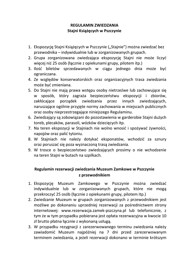 REGULAMIN ZWIEDZANIA Stajni Książęcych w Pszczynie 1. Ekspozycję Stajni Książęcych w Pszczynie („Stajnie”) można zwiedzać bez przewodnika – indywidualnie lub w zorganizowanych grupach. 2. Grupa zorganizowana zwiedzająca ekspozycję Stajni nie może liczyć więcej niż 25 osób (łącznie z opiekunami grupy, pilotem itp.) 3. Ilość biletów sprzedawanych w ciągu jednego dnia może być ograniczana. 4. Ze względów konserwatorskich oraz organizacyjnych trasa zwiedzania może być zmieniana. 5. Do Stajni nie mają prawa wstępu osoby nietrzeźwe lub zachowujące się w sposób, który zagraża bezpieczeństwu ekspozycji i zbiorów, zakłócające porządek zwiedzania przez innych zwiedzających, naruszające ogólnie przyjęte normy zachowania w miejscach publicznych oraz osoby nieprzestrzegające niniejszego Regulaminu. 6. Zwiedzający są zobowiązani do pozostawienia w garderobie Stajni dużych toreb, plecaków, parasoli, wózków dziecięcych itp. 7. Na teren ekspozycji w Stajniach nie wolno wnosić i spożywać żywności, napojów oraz palić tytoniu. 8. W Stajniach nie należy dotykać eksponatów, wchodzić za sznury oraz poruszać się poza wyznaczoną trasą zwiedzania. 9. W trosce o bezpieczeństwo zwiedzających prosimy o nie wchodzenie na teren Stajni w butach na szpilkach. Regulamin rezerwacji zwiedzania Muzeum Zamkowe w Pszczynie z przewodnikiem 1. Ekspozycję Muzeum Zamkowego w Pszczynie można zwiedzać indywidualnie lub w zorganizowanych grupach, które nie mogą przekroczyć 25 osób (łącznie z opiekunami grupy, pilotem itp.) 2. Zwiedzanie Muzeum w grupach zorganizowanych z przewodnikiem jest możliwe po dokonaniu uprzedniej rezerwacji za pośrednictwem strony internetowej: www.rezerwacja.zamek-pszczyna.pl lub telefonicznie, z tym że w tym przypadku pobierana jest opłata rezerwacyjna w kwocie 10 zł brutto płatna łącznie z wykonaną usługą. 3. W przypadku rezygnacji z zarezerwowanego terminu zwiedzania należy zawiadomić Muzeum najpóźniej na 7 dni przed zarezerwowanym terminem zwiedzania, a jeżeli rezerwacji dokonano w terminie krótszym 4. 5. 6. 7. niż 7 dni przed terminem zwiedzania niezwłocznie po wystąpieniu okoliczności powodującej rezygnację z rezerwacji. W przypadku rezygnacji z zarezerwowanego terminu zwiedzania ekspozycji Muzeum należy dokonać zawiadomienia o rezygnacji ze zwiedzania w jeden z następujących sposobów: a. on-line za pośrednictwem serwisu internetowego Muzeum na stronie www.rezerwacja.zamek-pszczyna.pl – poprzez zalogowanie się na swoim koncie i anulowanie rezerwacji, b. drogą mailową – poprzez przesłanie rezygnacji na adres: rezerwacja[at]zamek-pszczyna.pl, c. bądź faksem – przesyłając rezygnację pod nr 32 449 03 33. Rezerwacji zwiedzania można dokonywać w terminie 1 roku przed planowanym terminem zwiedzania. Natomiast w okresie krótszym niż 7 dni przed terminem zwiedzania rezerwacji można dokonać tylko drogą telefoniczną pod numerem: (32) 210 30 37 - w tym przypadku pobierana jest opłata w kwocie 10 zł brutto. Rezerwacja terminu zwiedzania drogą elektroniczną (przez system online) jest bezpłatna. Zamiana terminów zwiedzania ekspozycji Muzeum zarezerwowanych w systemie on-line wymaga zgody Muzeum.
