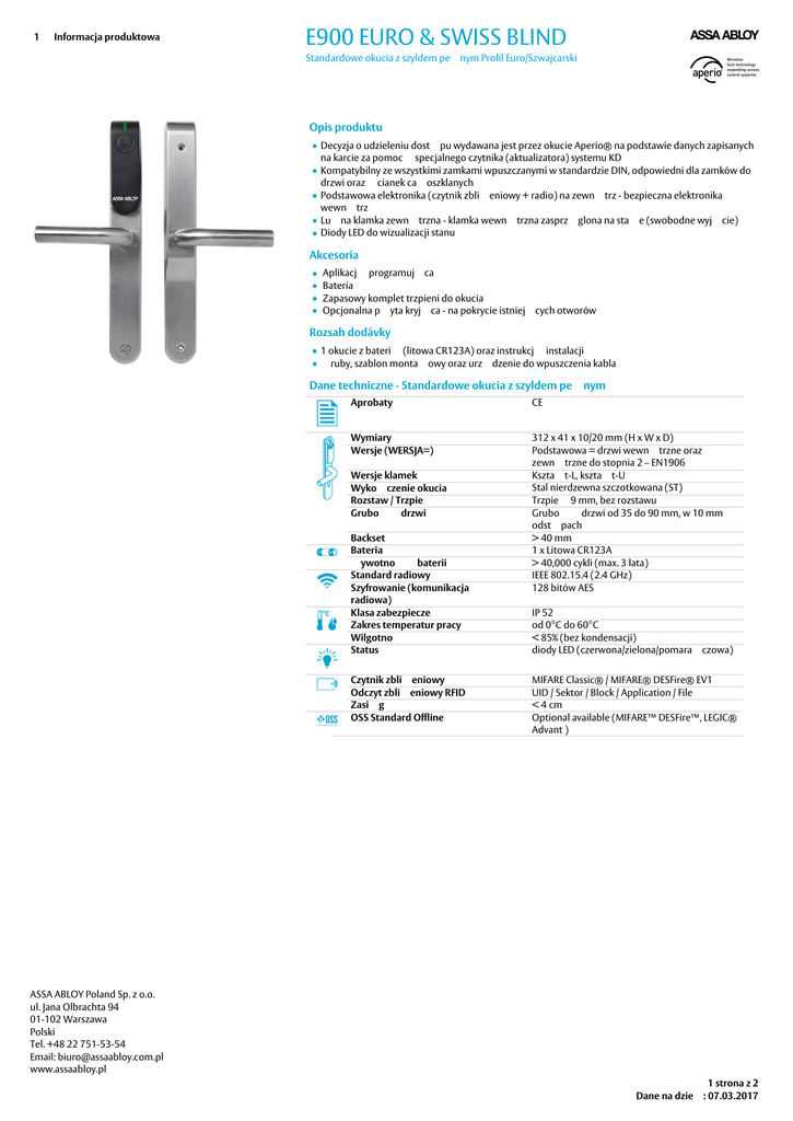 1 Informacja produktowa E900 EURO & SWISS BLIND Standardowe okucia z szyldem pełnym Profil Euro/Szwajcarski Opis produktu Decyzja o udzieleniu dostępu wydawana jest przez okucie Aperio® na podstawie danych zapisanych na karcie za pomocą specjalnego czytnika (aktualizatora) systemu KD Kompatybilny ze wszystkimi zamkami wpuszczanymi w standardzie DIN, odpowiedni dla zamków do drzwi oraz ścianek całoszklanych Podstawowa elektronika (czytnik zbliżeniowy + radio) na zewnątrz - bezpieczna elektronika wewnątrz Luźna klamka zewnętrzna - klamka wewnętrzna zasprzęglona na stałe (swobodne wyjście) Diody LED do wizualizacji stanu Akcesoria Aplikacją programująca Bateria Zapasowy komplet trzpieni do okucia Opcjonalna płyta kryjąca - na pokrycie istniejących otworów Rozsah dodávky 1 okucie z baterią (litowa CR123A) oraz instrukcją instalacji Śruby, szablon montażowy oraz urządzenie do wpuszczenia kabla Dane techniczne - Standardowe okucia z szyldem pełnym Aprobaty CE Wymiary Wersje (WERSJA=) 312 x 41 x 10/20 mm (H x W x D) Podstawowa = drzwi wewnętrzne oraz zewnętrzne do stopnia 2 – EN1906 Kształt-L, kształt-U Stal nierdzewna szczotkowana (ST) Trzpień 9 mm, bez rozstawu Grubość drzwi od 35 do 90 mm, w 10 mm odstępach > 40 mm 1 x Litowa CR123A > 40,000 cykli (max. 3 lata) IEEE 802.15.4 (2.4 GHz) 128 bitów AES Wersje klamek Wykończenie okucia Rozstaw / Trzpień Grubość drzwi Backset Bateria Żywotność baterii Standard radiowy Szyfrowanie (komunikacja radiowa) Klasa zabezpieczeń Zakres temperatur pracy Wilgotność Status Czytnik zbliżeniowy Odczyt zbliżeniowy RFID Zasięg OSS Standard Offline IP 52 od 0°C do 60°C < 85% (bez kondensacji) diody LED (czerwona/zielona/pomarańczowa) MIFARE Classic® / MIFARE® DESFire® EV1 UID / Sektor / Block / Application / File < 4 cm Optional available (MIFARE™ DESFire™, LEGIC® Advant ) ASSA ABLOY Poland Sp. z o.o. ul. Jana Olbrachta 94 01-102 Warszawa Polski Tel. +48 22 751-53-54 Email: [email protected] www.assaabloy.pl 1 strona z 2 Dane na dzień: 07.03.2017 2 Informacja produktowa E900 EURO & SWISS BLIND Standardowe okucia z szyldem pełnym Profil Euro/Szwajcarski ASSA ABLOY Poland Sp. z o.o. ul. Jana Olbrachta 94 01-102 Warszawa Polski Tel. +48 22 751-53-54 Email: [email protected] www.assaabloy.pl 2 strona z 2 Dane na dzień: 07.03.2017 Powered by TCPDF (www.tcpdf.org)
